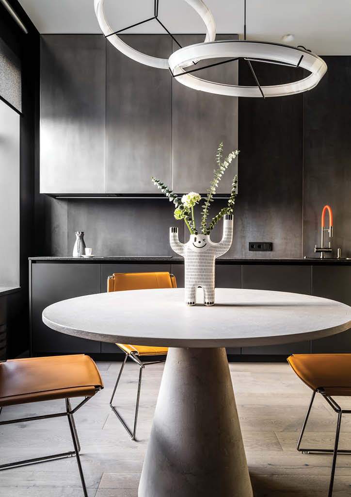 The next dark block is a kitchen. The design team chose large-format porcelain stoneware for the wall’s finishing. They found a non-traditional solution for the upper modules’ façade finishing: the facades repeat the metal texture and reflect the light as the metal but they’re made of MDF and covered by special enamel based on metal powder. For the block of upper modules looking monolith, they matched the facades and decorative side parts by a 45° angle.