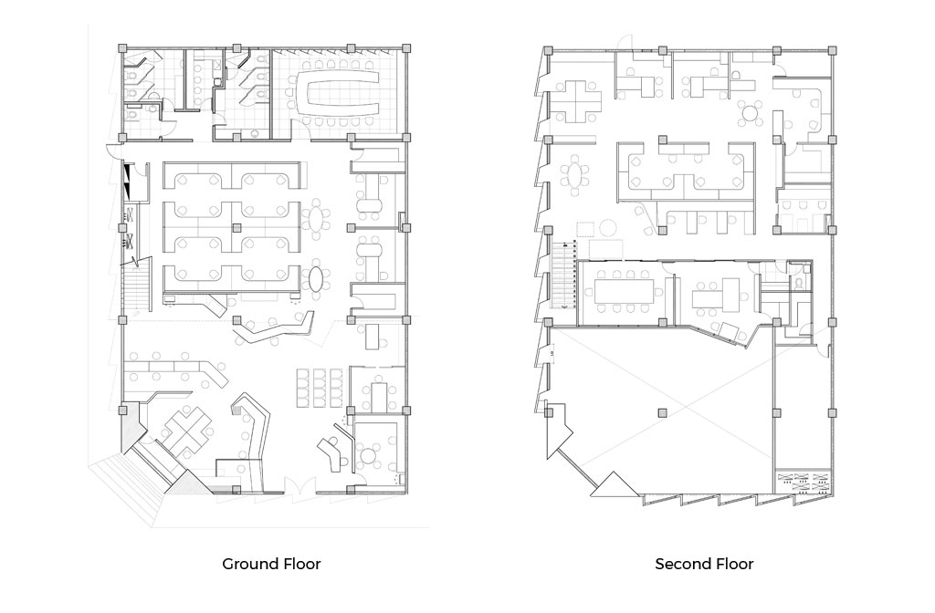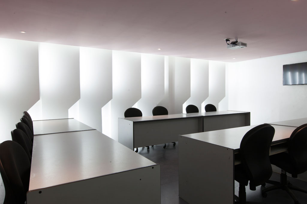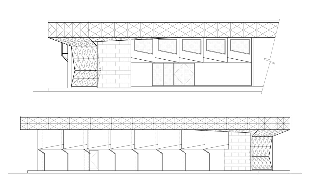 The building has double height interiors, with a mezzanine floor. Despite the high ceiling, the interiors were dark due to the lack of fenestration, particularly on the wall facing west, which was one solid expanse. Clearly, the intention was to keep the harsh afternoon sun out. To allow indirect sunlight in and make the façade more interesting, Sia lined the wall with vertical “gills.”