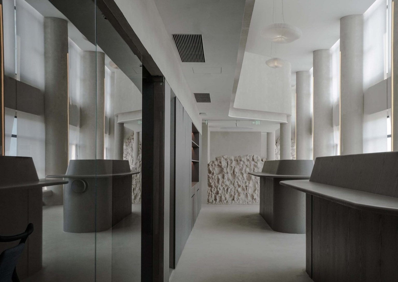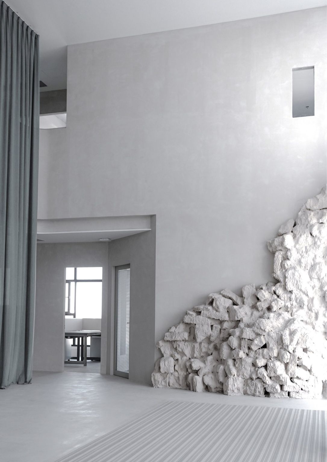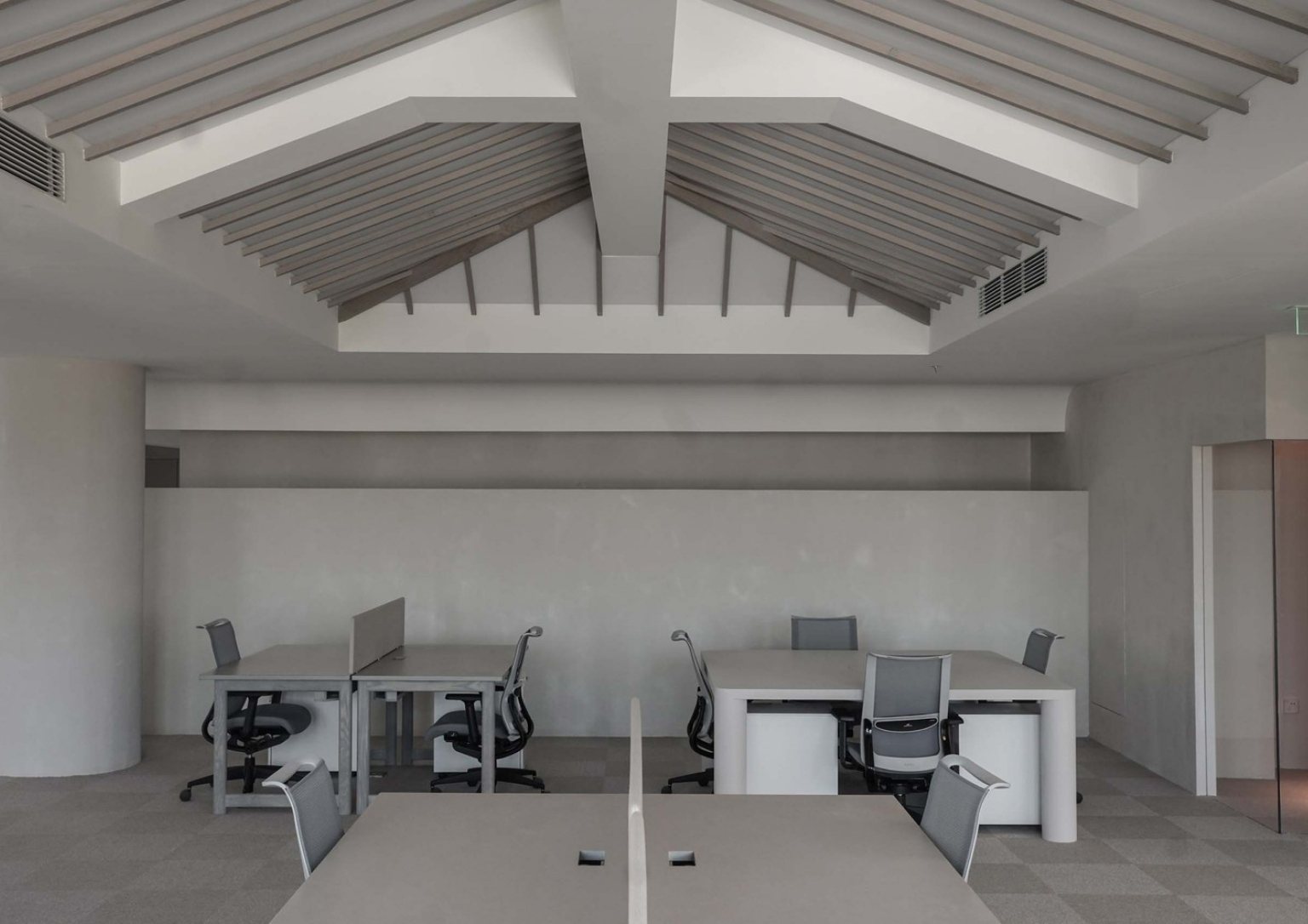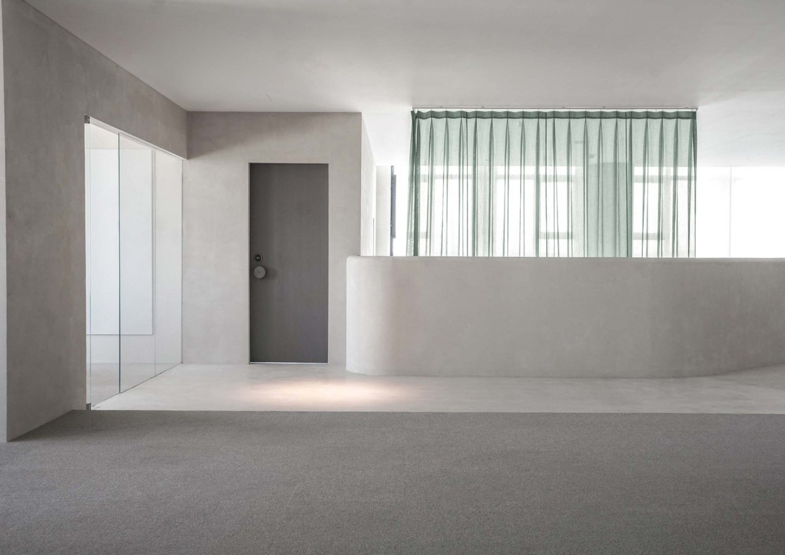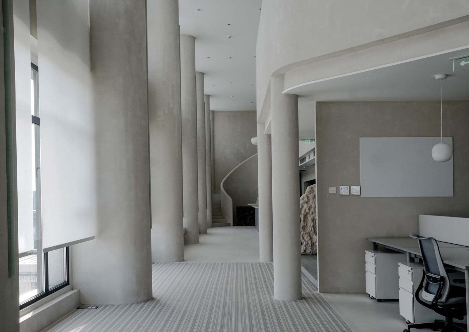 Soft gray gypsum plaster, chosen for its matte appearance, has been applied to nearly every surface in the office, including the floors. Two textured walls created by pouring semi-solidified gypsum over jumbled piles of shattered bricks are an intriguing visual element on the lower floor. Nature is incorporated into the office through the floor-to-ceiling windows that invite organic light to create a play of shadows in the areas. Installing semi-transparent drapes that function as light filters softens the sunlight, which can sometimes be too harsh. The circular support column diffuses the edges of light that passes through it. Soft light and shadows create a visual experience by making everything appear to be related.