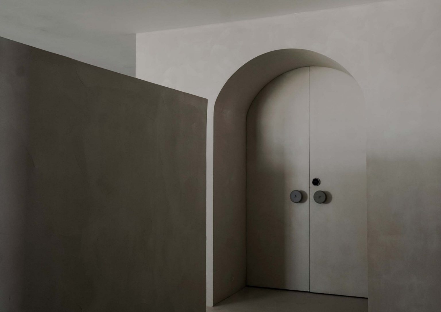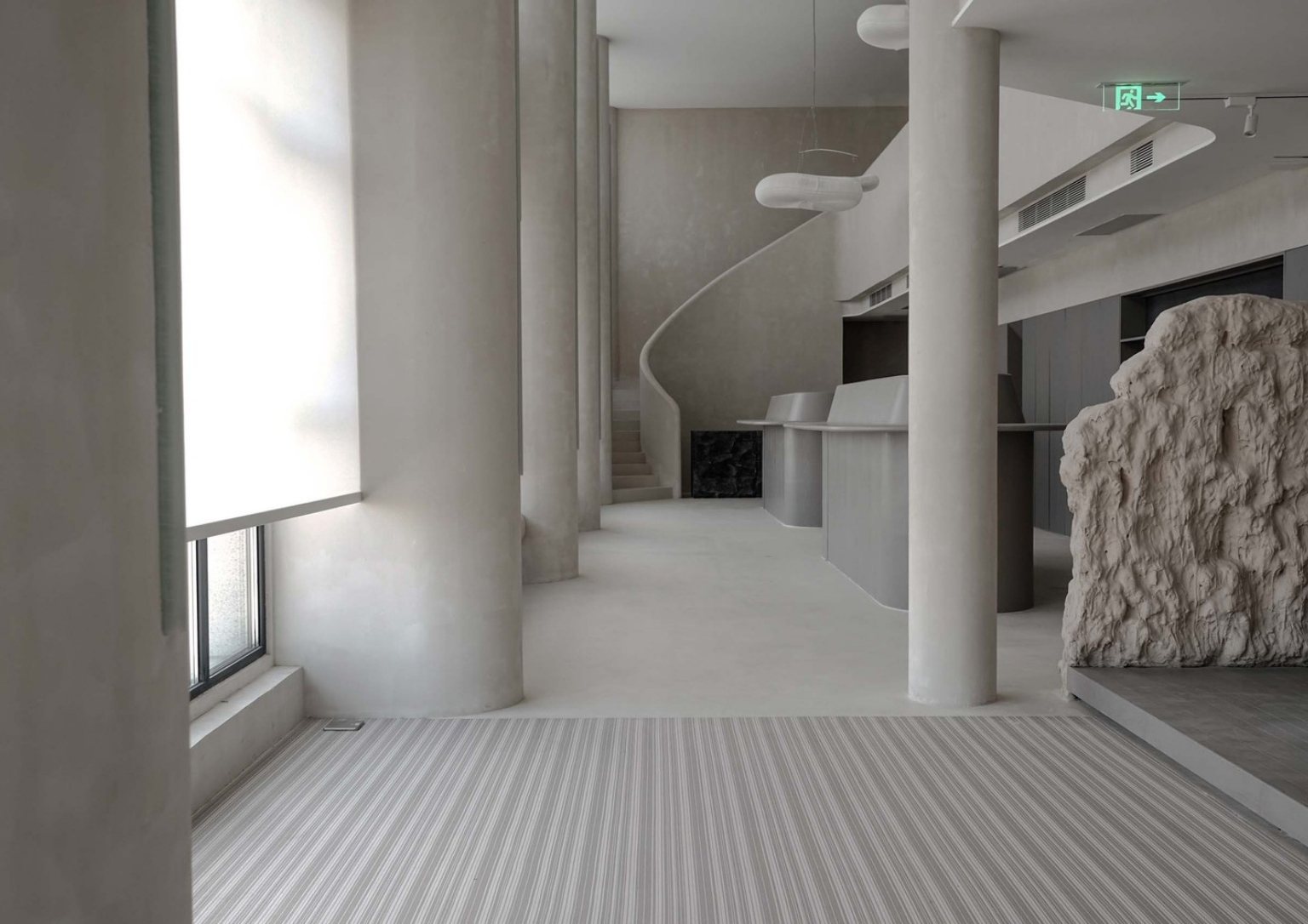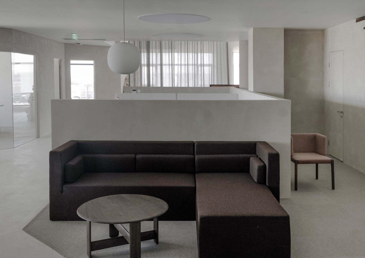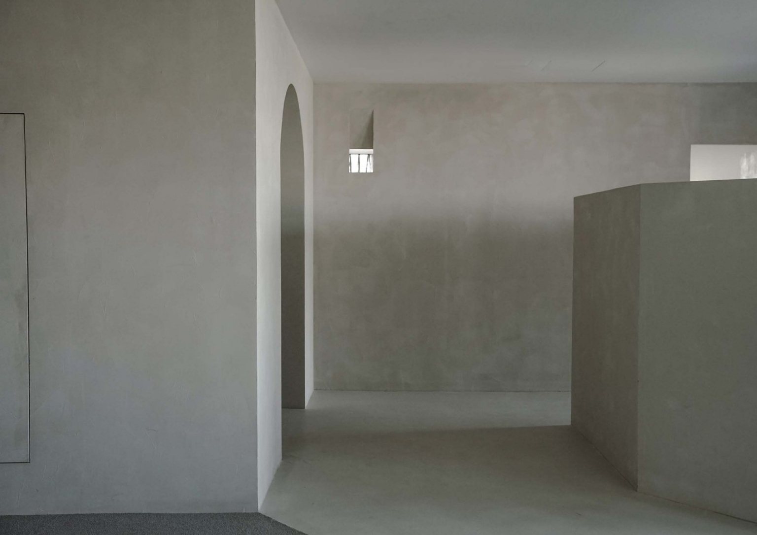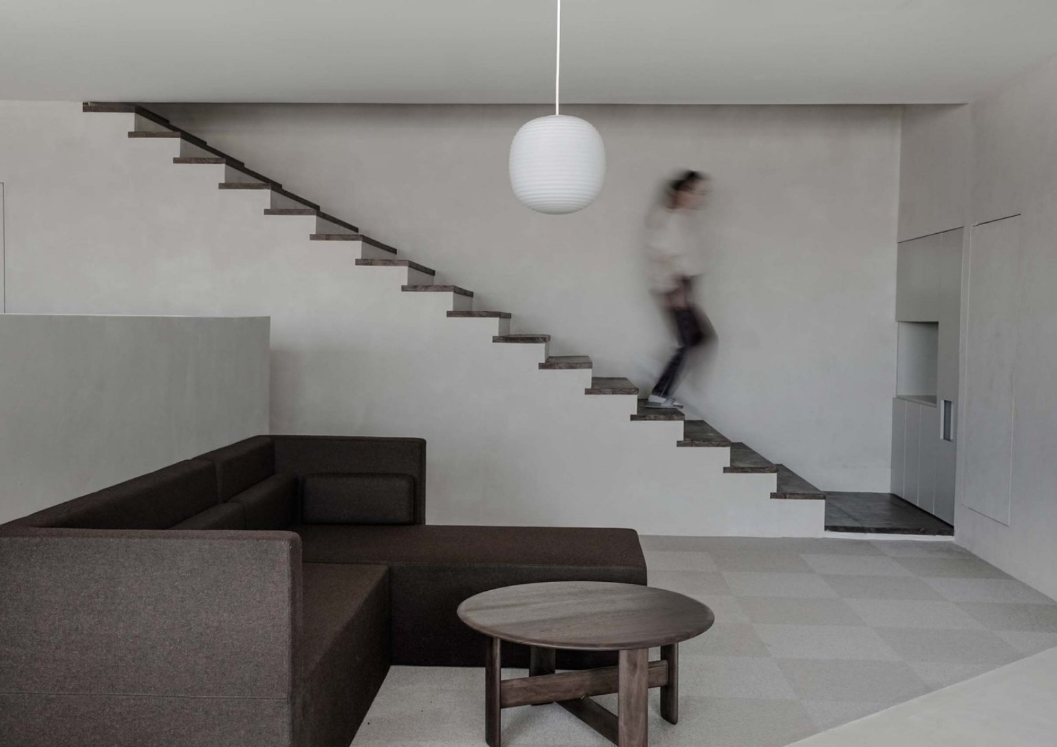Soft gray gypsum plaster, chosen for its matte appearance, has been applied to nearly every surface in the office, including the floors. Two textured walls created by pouring semi-solidified gypsum over jumbled piles of shattered bricks are an intriguing visual element on the lower floor. Nature is incorporated into the office through the floor-to-ceiling windows that invite organic light to create a play of shadows in the areas. Installing semi-transparent drapes that function as light filters softens the sunlight, which can sometimes be too harsh. The circular support column diffuses the edges of light that passes through it. Soft light and shadows create a visual experience by making everything appear to be related.