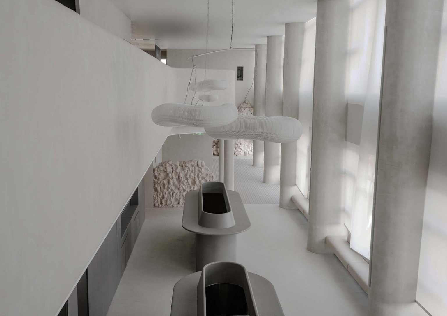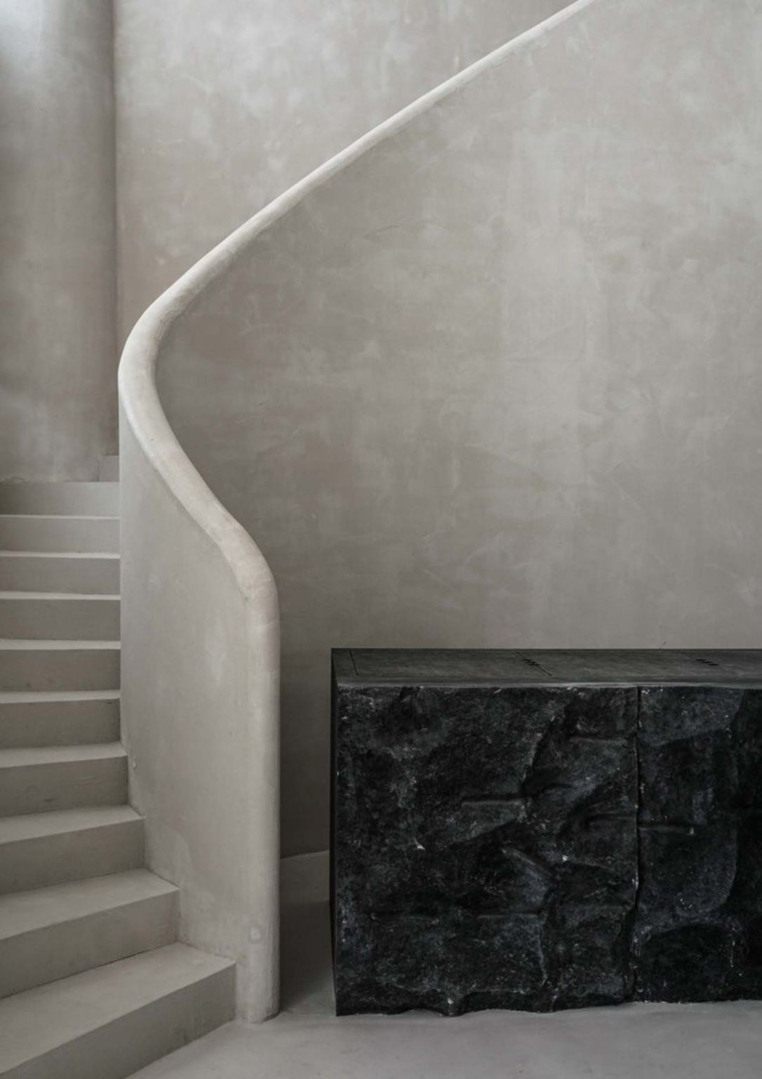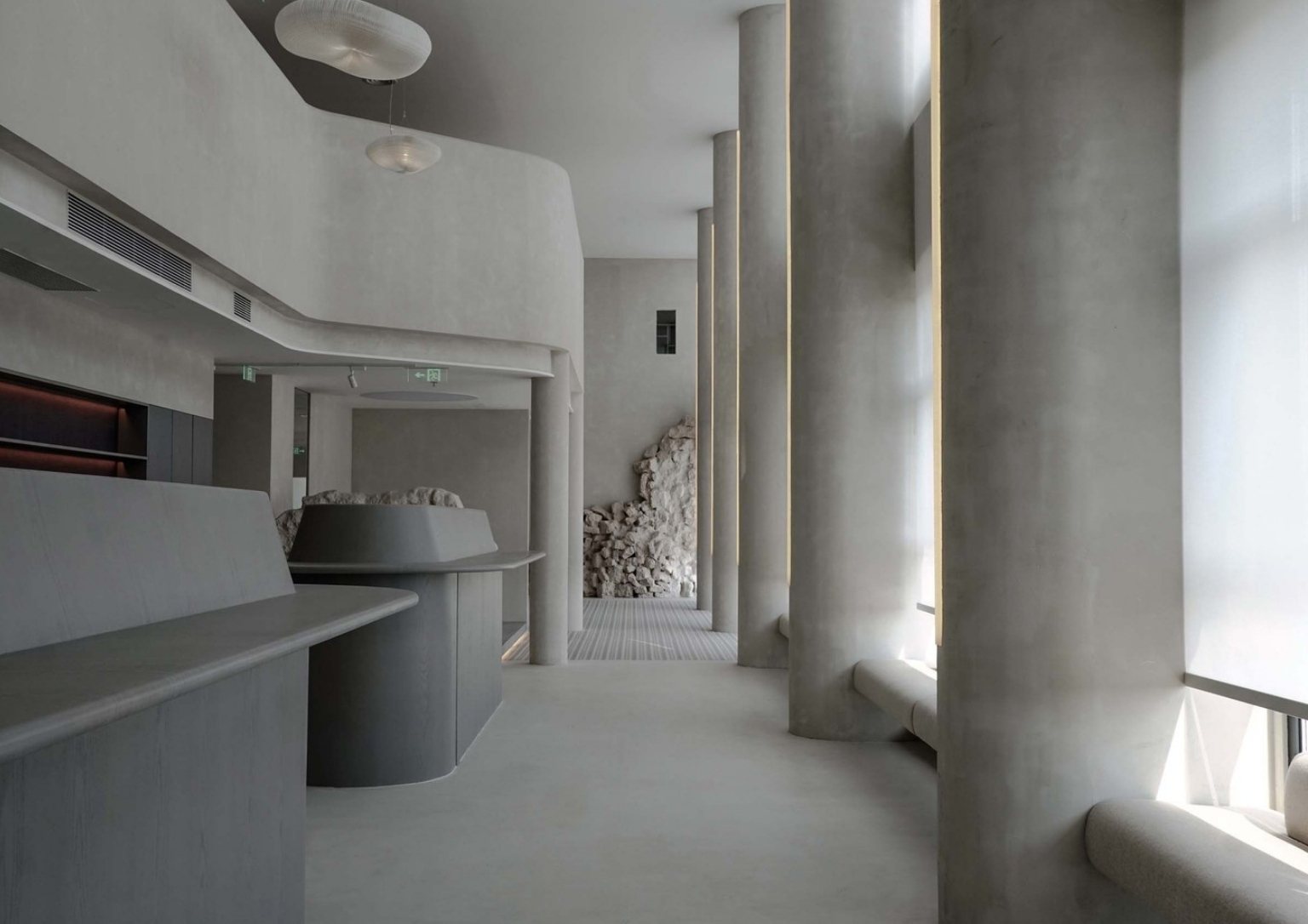 Additionally, a few designated plant areas also double as dining tables. Having a meal under the plants is a further allusion to a science fiction film that inspired the design. The spiral staircase is enlivened by the addition of an arc-shaped railing with an organic texture that reveals the clay’s personality. The alteration of multidimensional curved surfaces invigorates the whole environment. The team ensured that the monochromatic theme was enhanced by minute touches. Certain zones are adorned with pops of color to contrast the gray tones.