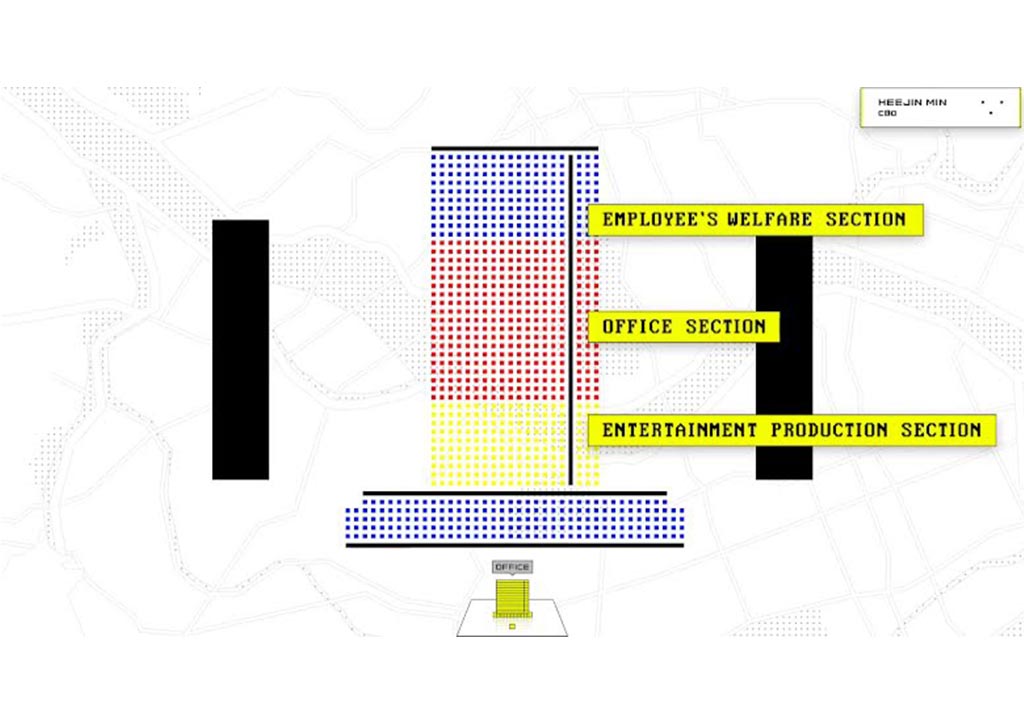 19-stories tall with seven more levels below ground and an approximate area of 60,000 square meters, the HYBE building was divided into three parts. The employee’s welfare section which makes up the topmost half, the office section for the middle, and the entertainment production section, which makes up the lower half.