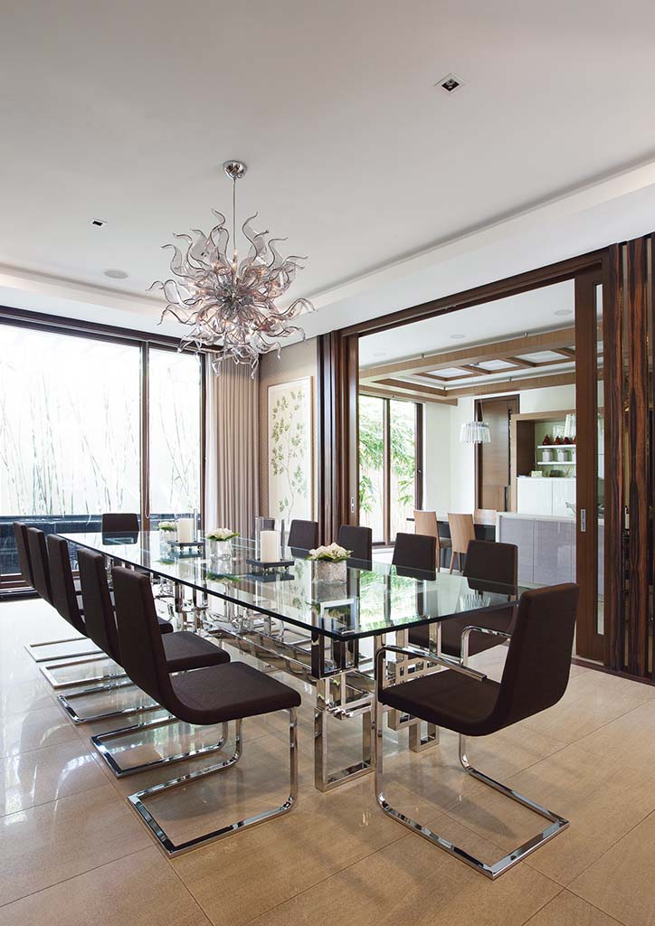 The use of modern geometric couches, coupled with a predominant use of white to shades of brown gives a very Continental Modern look to the main interiors, similar to that of modern countryside houses in France or Germany. The living room’s double-height windows and curtains reinforce this feeling, as well as the strategic use of crystal lighting or mirrored accents from Murano or Bohemia.
