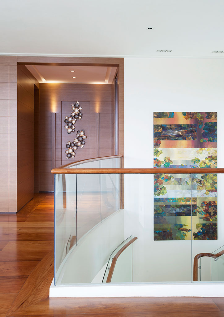 On the ground floor, the living room stretches from the foyer into the enclosed dining room and clean kitchen, the garden view resplendent to the cast via double-level glass curtain walls and sliding doors. Just to the left is the den, and behind it the exercise gym for the client’s athletic daughter. Nazareno’s love for wood textures still reverberates via the solid narra treads of the glass and white cantilevered staircase; and the wood veneer panels and screens on the interiors.