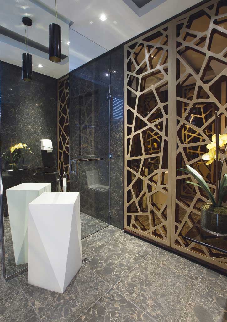 An ancient-meets-modern sensibility pervades a house in a gated village in Greenhills done by Nazareno+Guerrero Design Consultancy. With 800 square meters of floor area occupying a 780-square meter lot, the house is screened from the sidewalk by copper-brown stainless steel gates laser-cut in a honeycomb cubist pattern. The pattern is also applied to the kamagong-narra applique double doors of the main entrance. Based on an ancient Roman opus sectile stone floor pattern, the motif is streamlined in a manner that characterizes Anthony Nazareno‘s modern grasp of design.