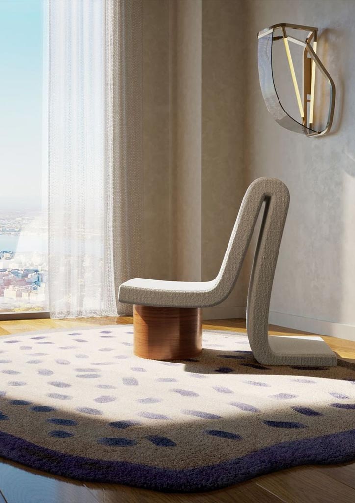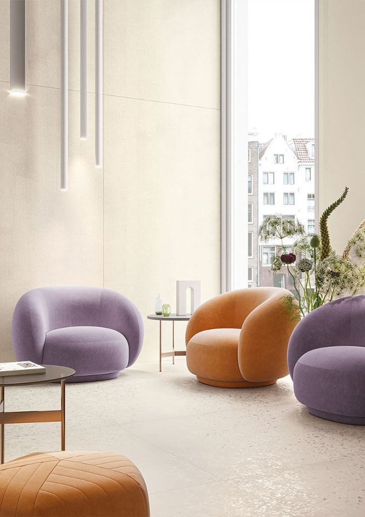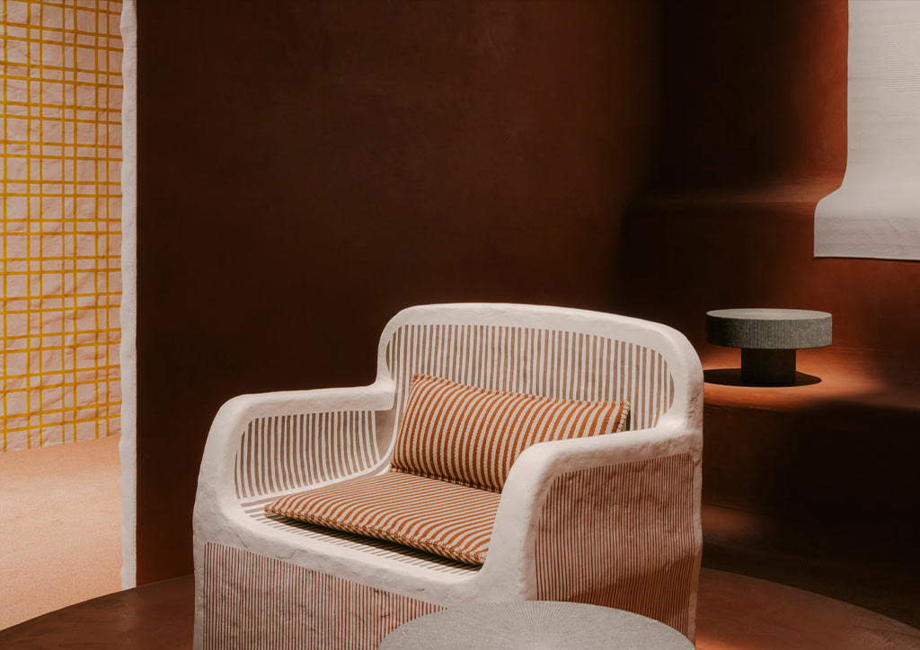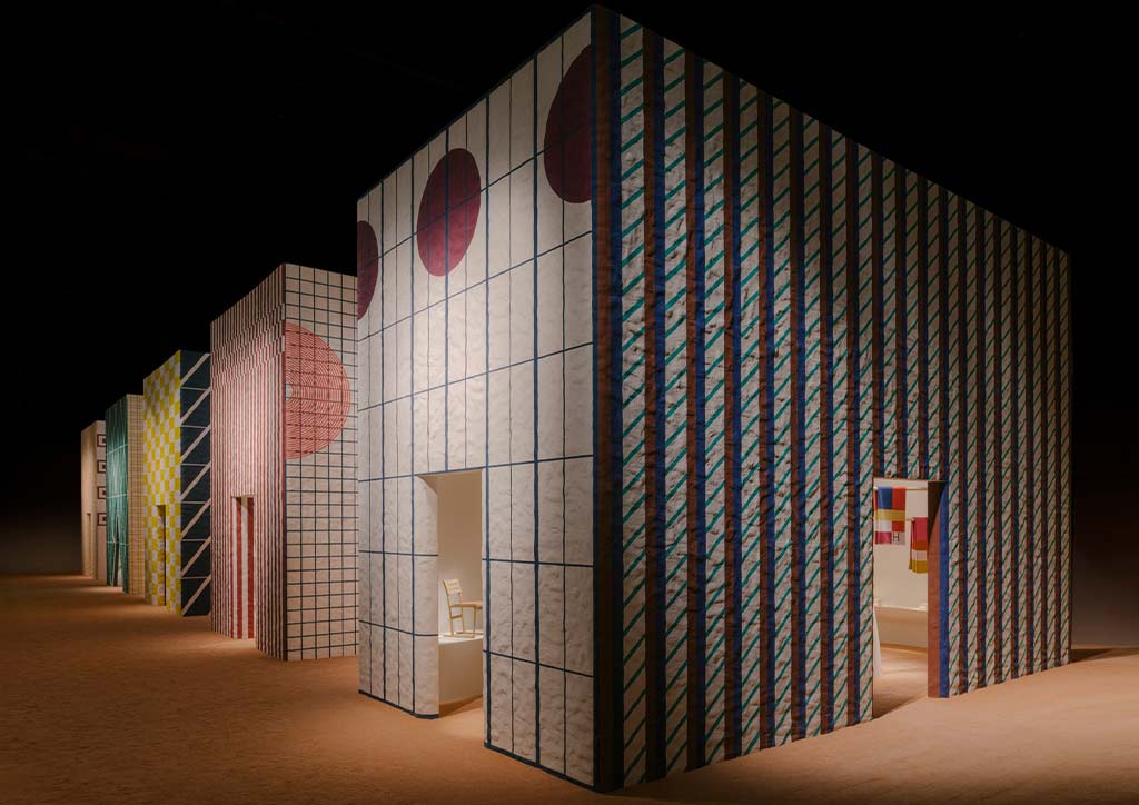 A surreal interior, decorated with colorful walls, has a floor made of orange sand. Designed by Charlotte Macaux Perelman, the installation comprises five architectural volumes, each one featuring a unique geometric color pattern. The volumes are furnished with elegant pieces and quality materials such as leather, fabrics, stone, and metal.