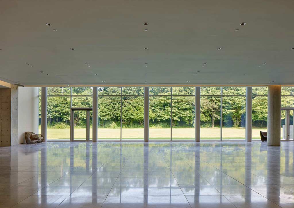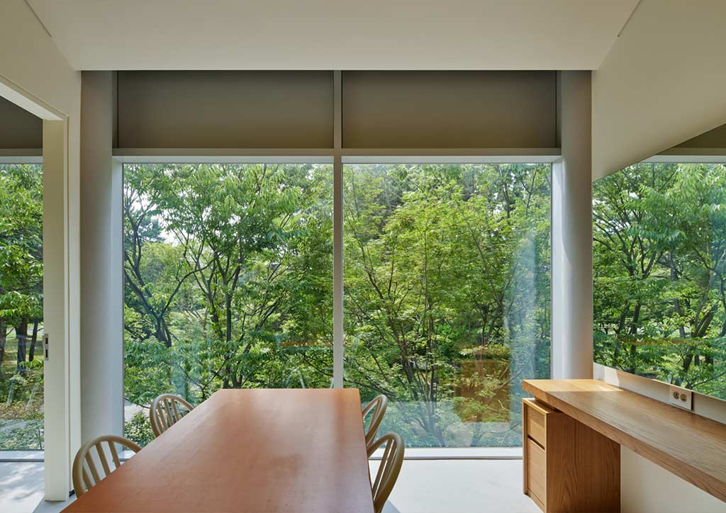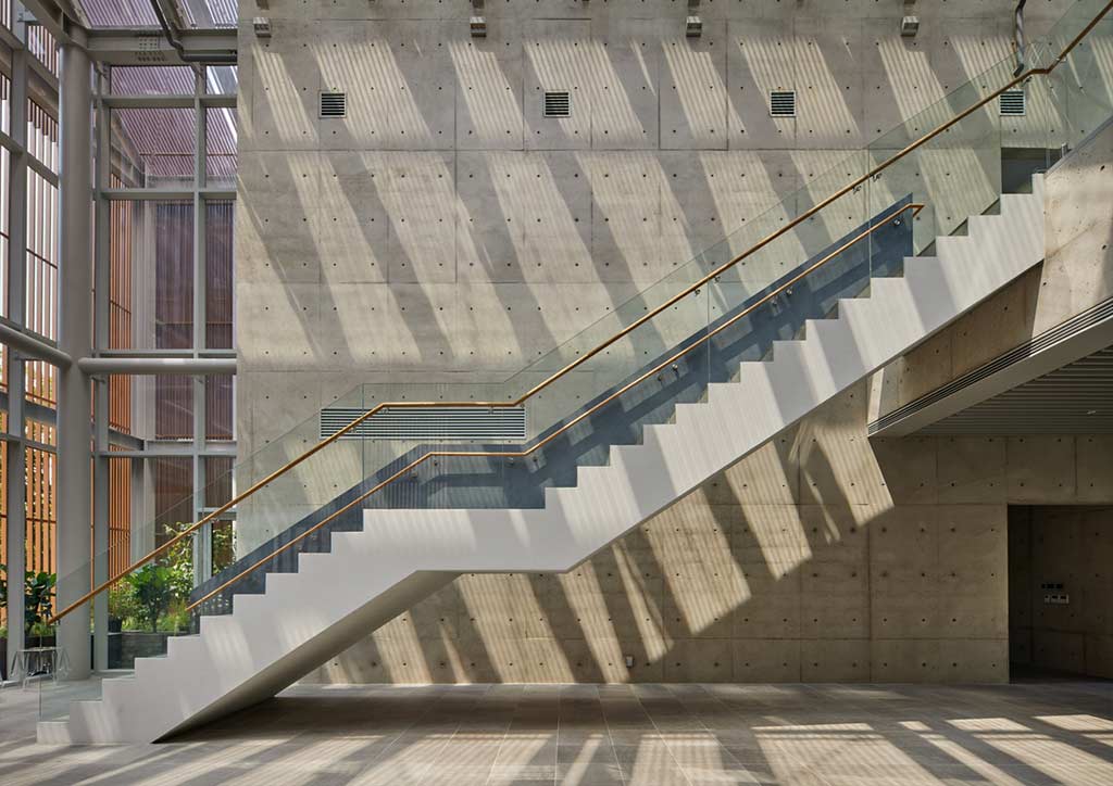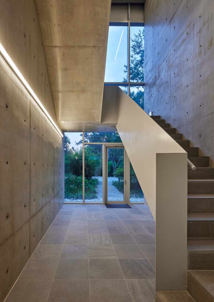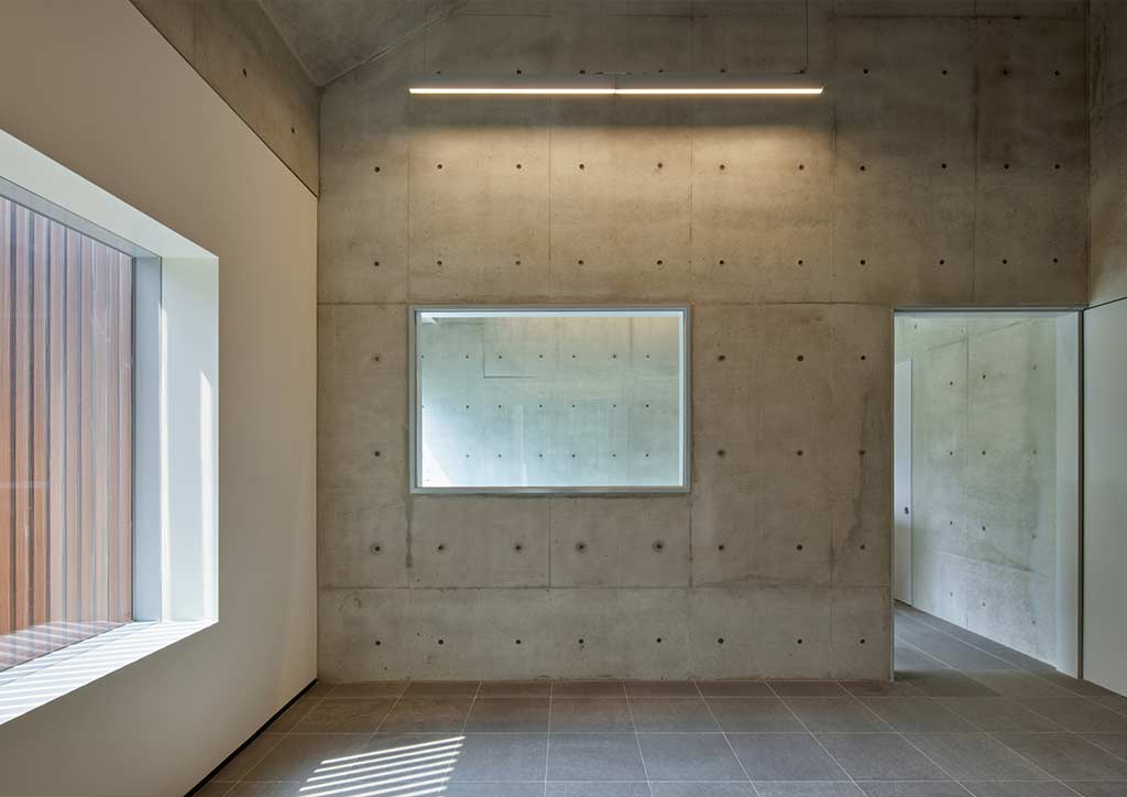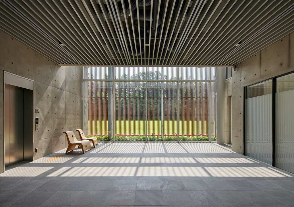 The clean symmetry of horizontal and vertical elements, together with muted finishes becomes dynamic as natural light passes through.