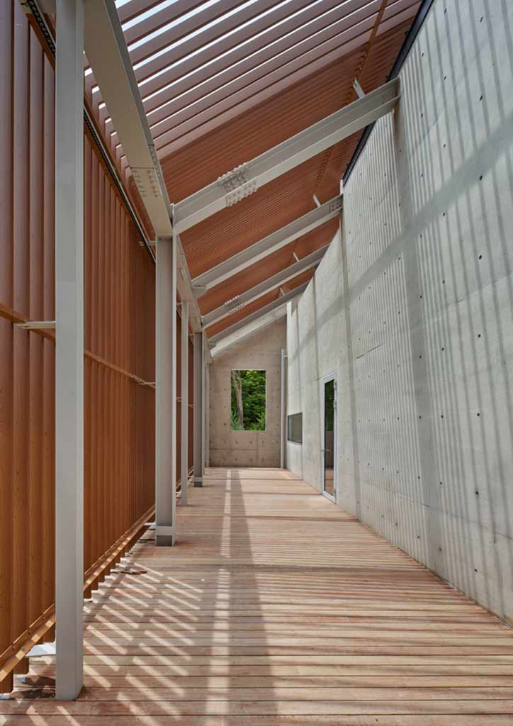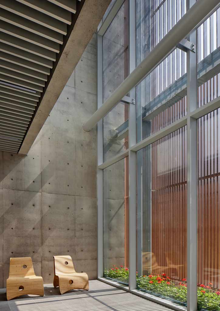 The façade showcases a clean contemporary architecture having used materials that highly encourage the entry of natural light into the building, such as the full-height glass panels and the metal louvers. These louvers not only allow natural light to come through but also create dramatic shadow effects. In addition, these louvers also allow passage for natural ventilation to penetrate the interior spaces. The raw polished concrete gives that authentic look that blends well with the surrounding greens. Another interesting feature is the zinc roofs wherein some parts are painted manually breaking monotony thus creating good harmony with nature.