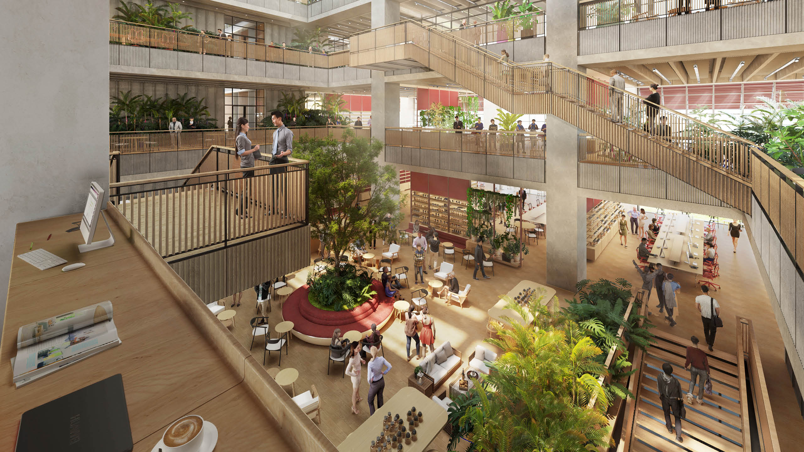 The interior design responds to the needs of a creative workplace and incorporates a refined collection of materials such as exposed concrete columns, and precast concrete soffits that are paired with a terrazzo floor with recycled stone aggregates. Foster + Partners’ Industrial Design team also designed a highly flexible furniture system that adapts to the company’s changing requirements. The option to add planters to the floor-to-ceiling system was also included to allow for the natural flow of greenery throughout workspaces and to function as a break to the open-plan spaces in order to create a more intimate working environment.