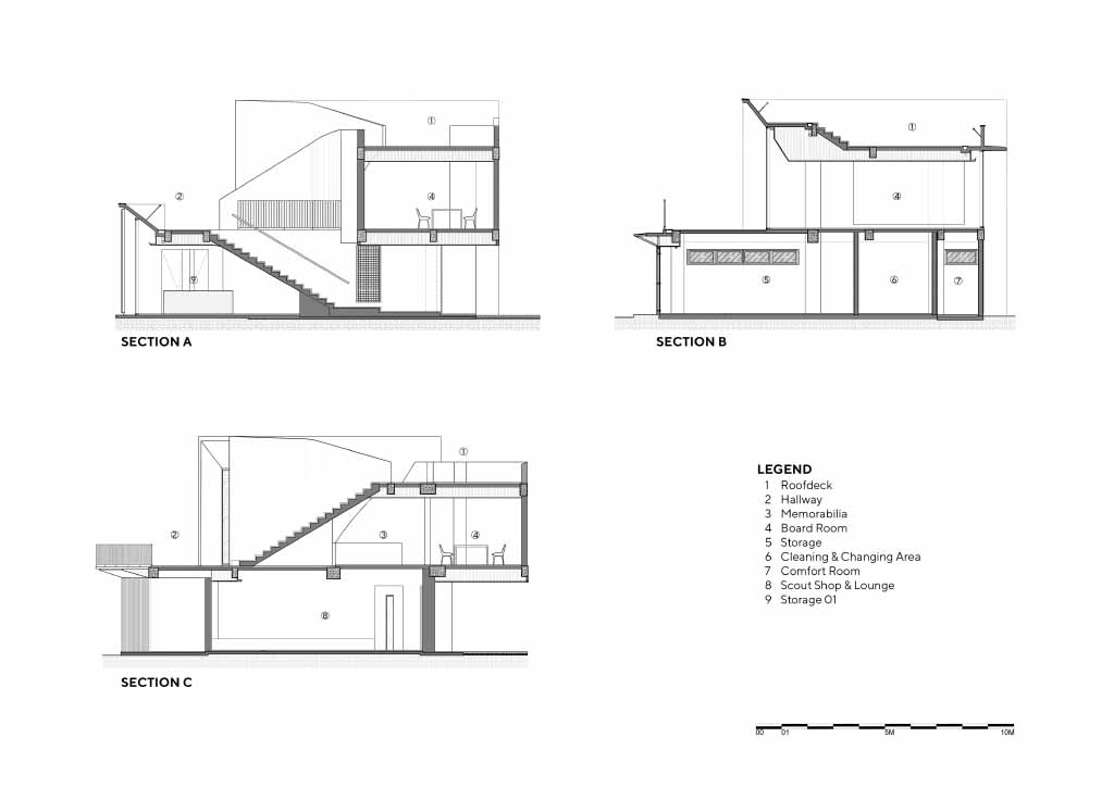 The ground floor houses the office, equipment room, scout shop, changing room, and the restroom which are suitably divided having a modest size for each space. On the second floor is the board room and it also features the memorabilia that celebrates the glorious years of the school’s scouting unit. And of course, various scout-related activities can be done and enjoyed at the roof deck area.