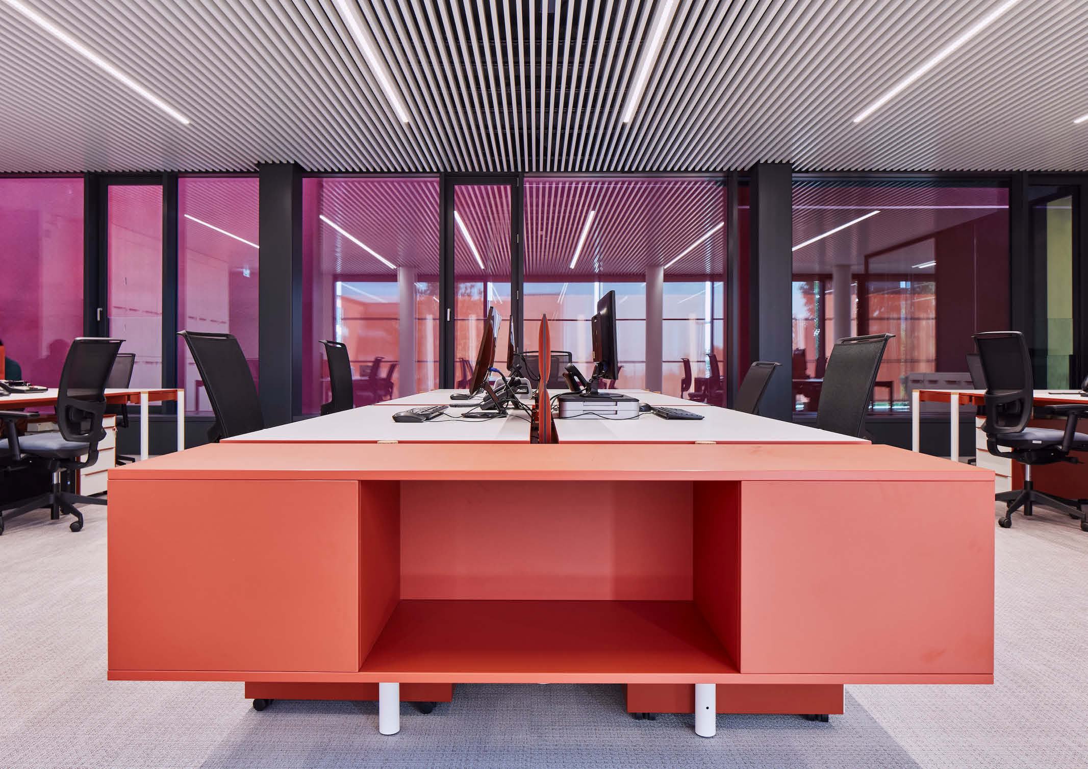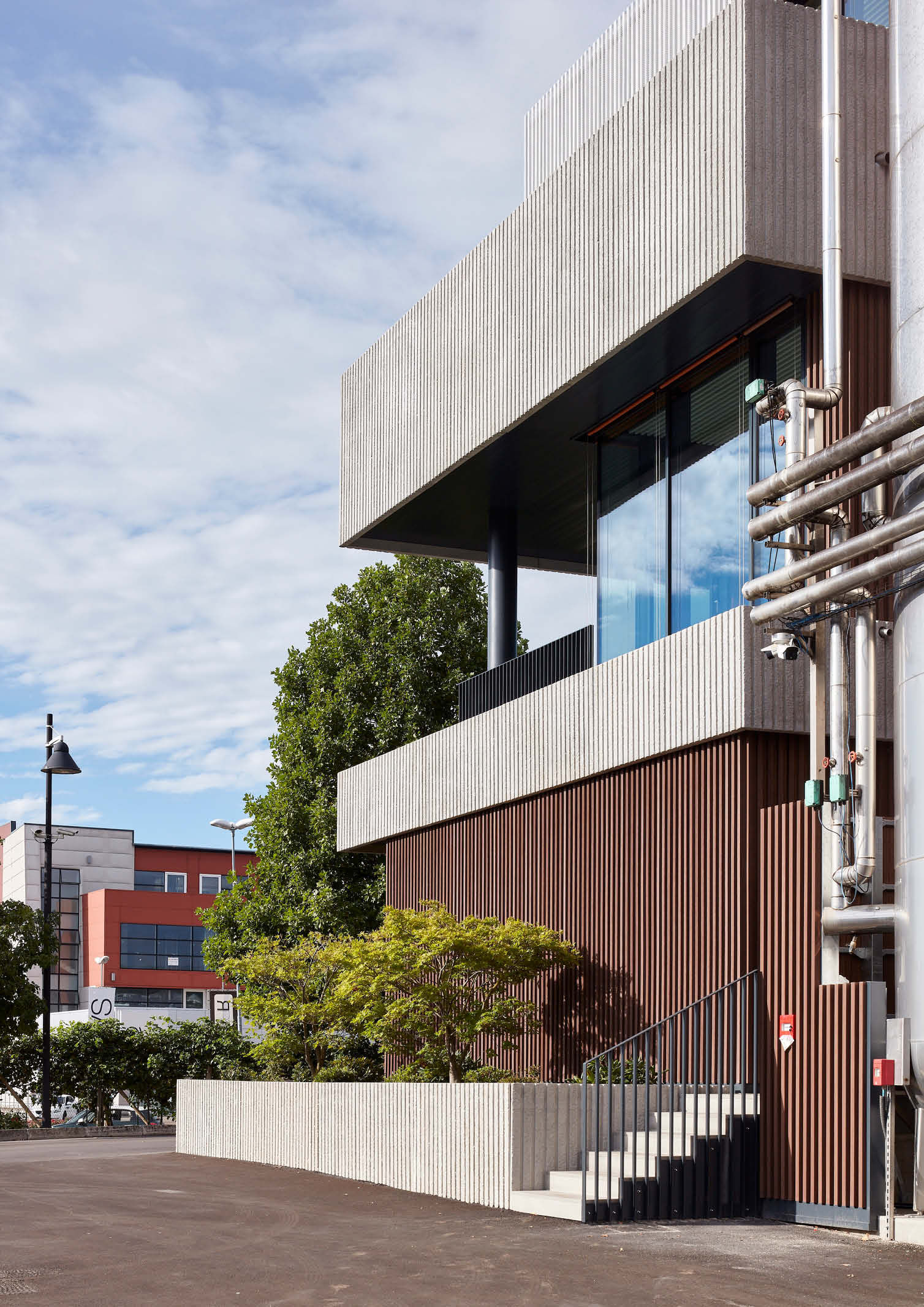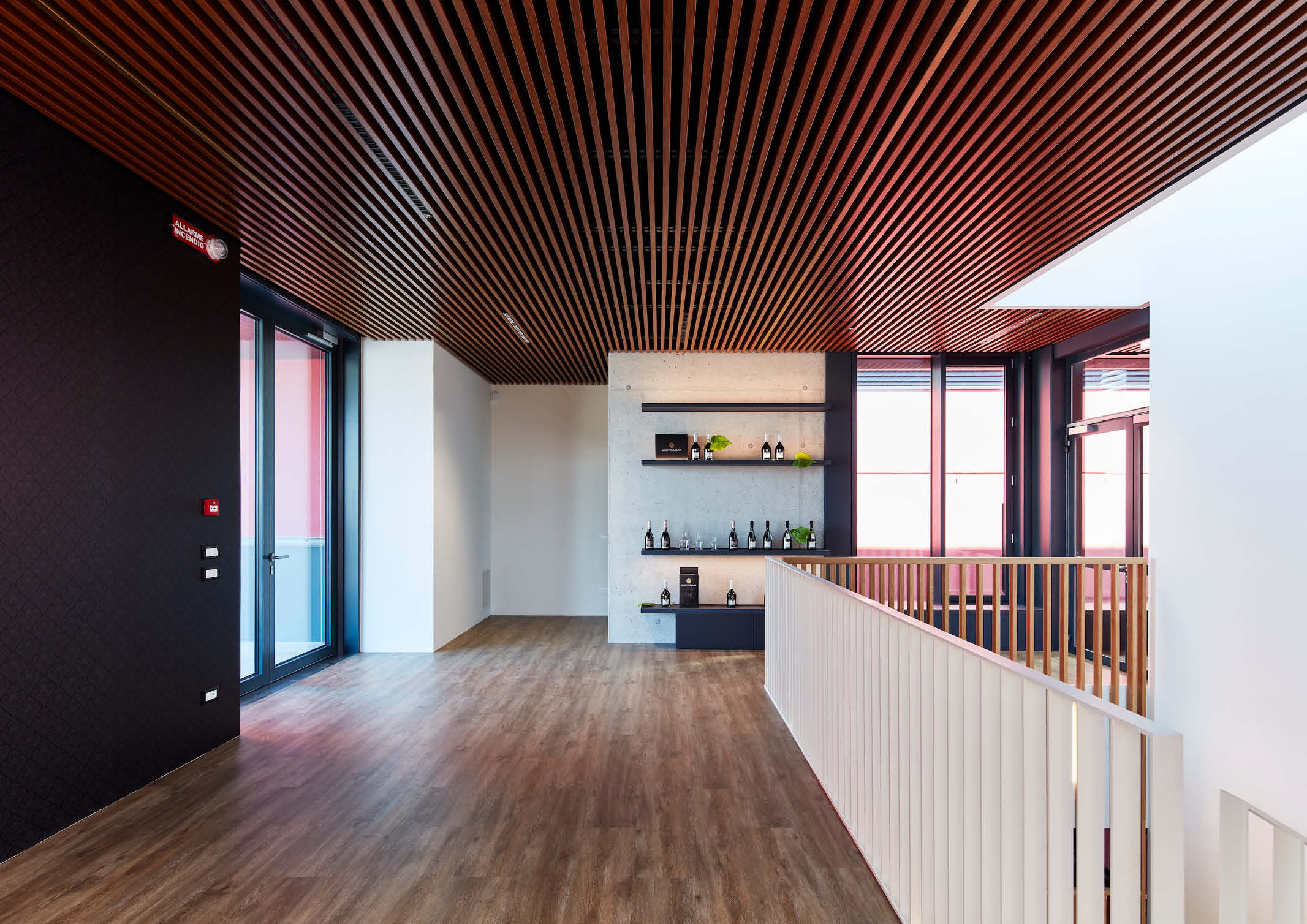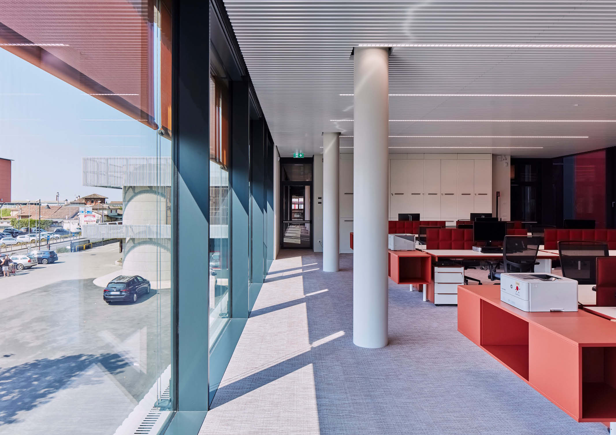 The intricate system of openings and screens also lends quality to the interior spaces, which strongly relate both to the outdoors, on the fronts facing south and east, and to the production areas located at the rear of the building, to the north. On the main façade, the architect created a spacious entrance with a recess in the ground floor. It is highlighted by a bright red septum that leads toward a grand staircase that serves the four levels. Wood counter ceilings echo the striped pattern found in the facade elements and serve a sound-absorbing function.