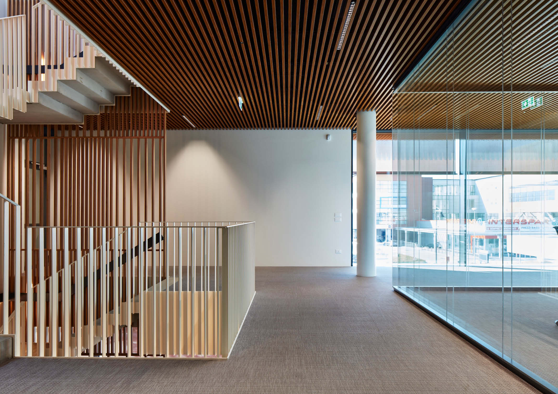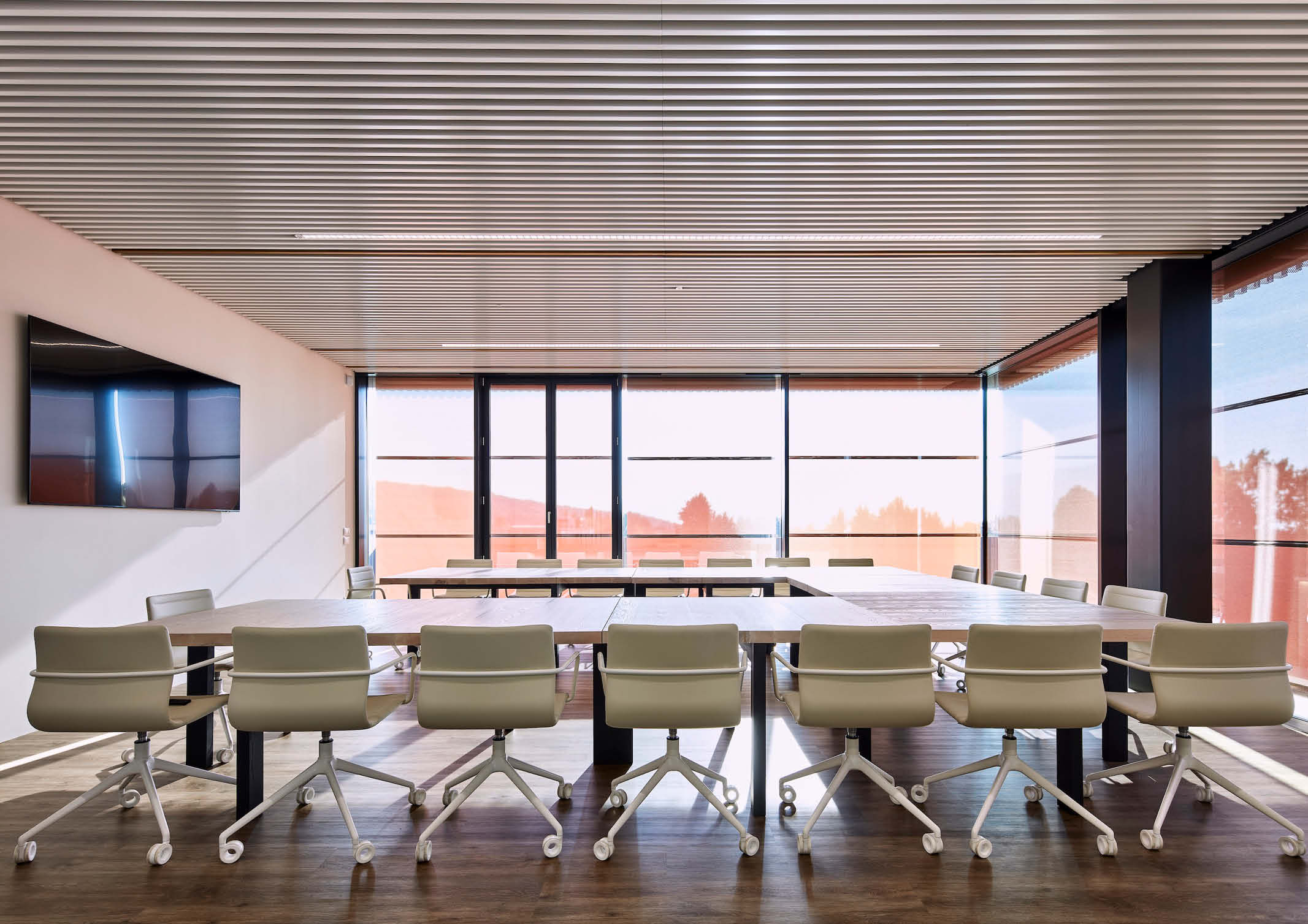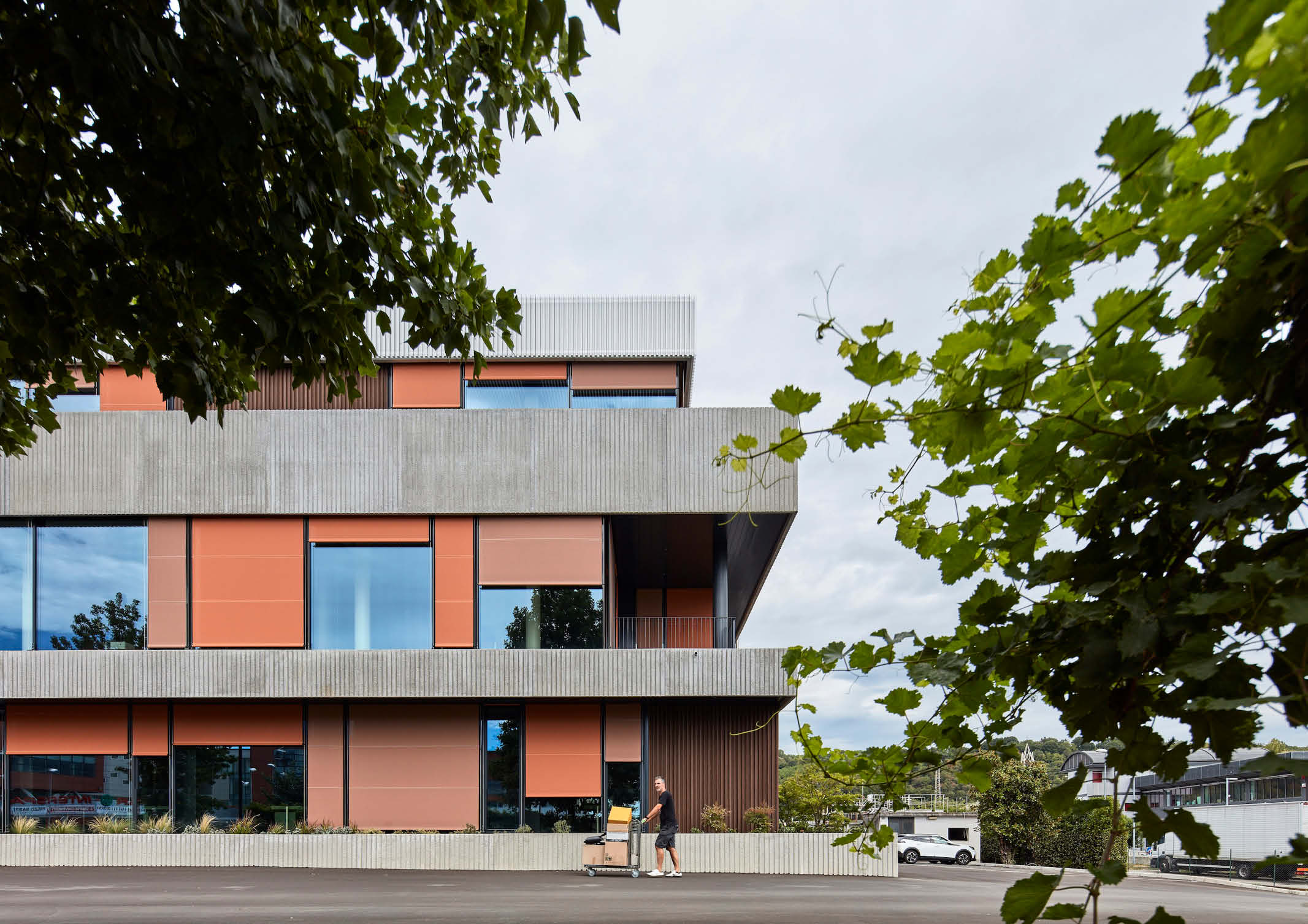 The intricate system of openings and screens also lends quality to the interior spaces, which strongly relate both to the outdoors, on the fronts facing south and east, and to the production areas located at the rear of the building, to the north. On the main façade, the architect created a spacious entrance with a recess in the ground floor. It is highlighted by a bright red septum that leads toward a grand staircase that serves the four levels. Wood counter ceilings echo the striped pattern found in the facade elements and serve a sound-absorbing function.