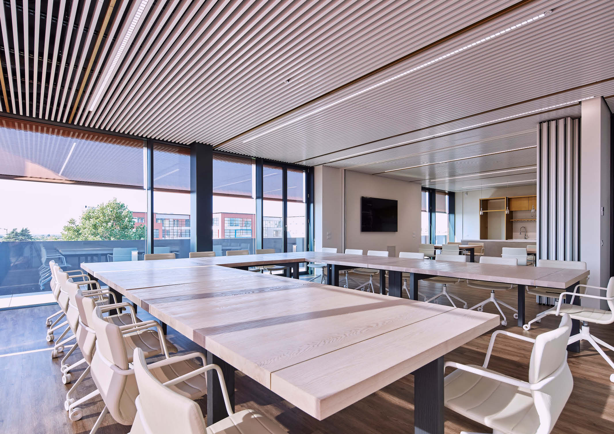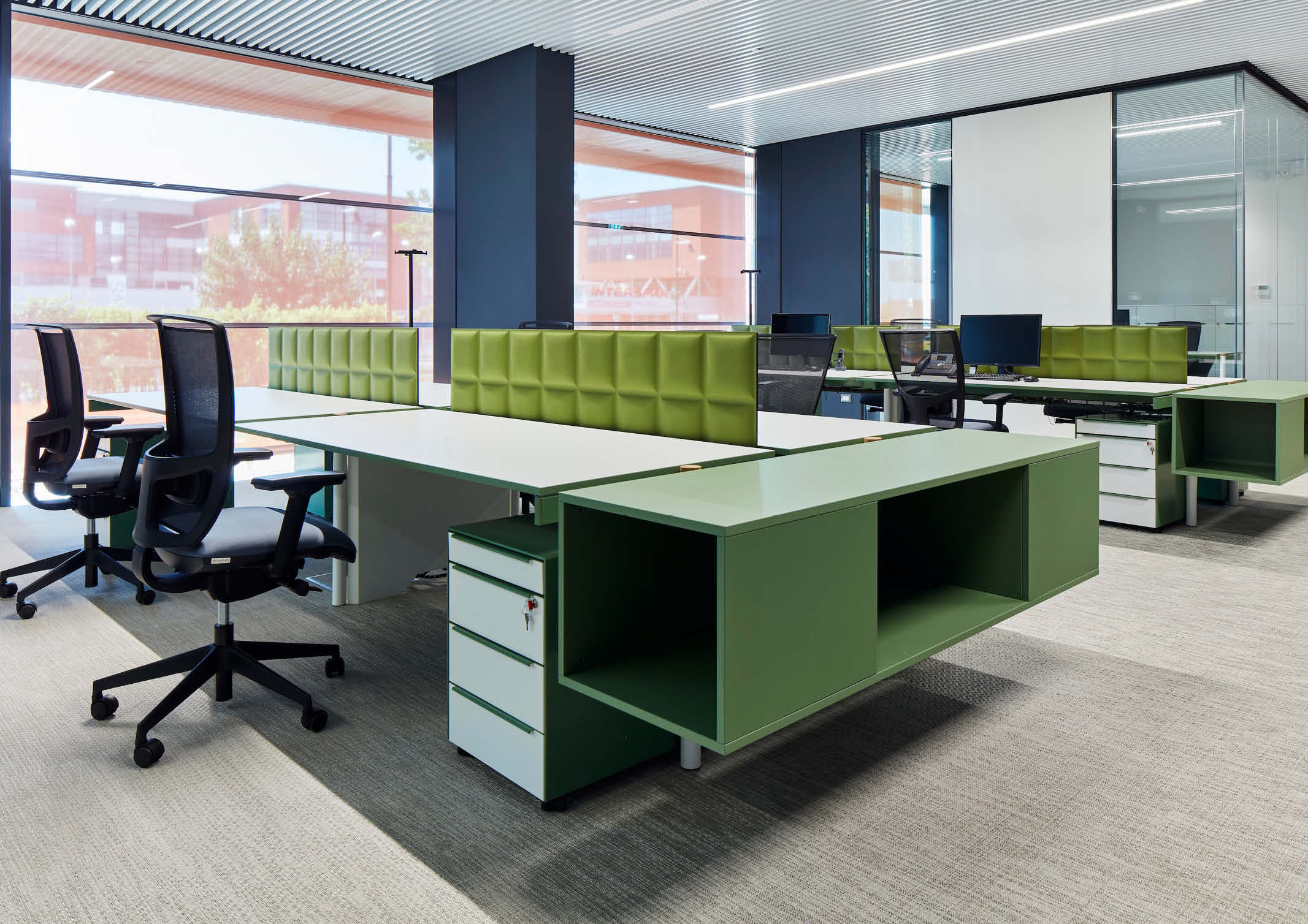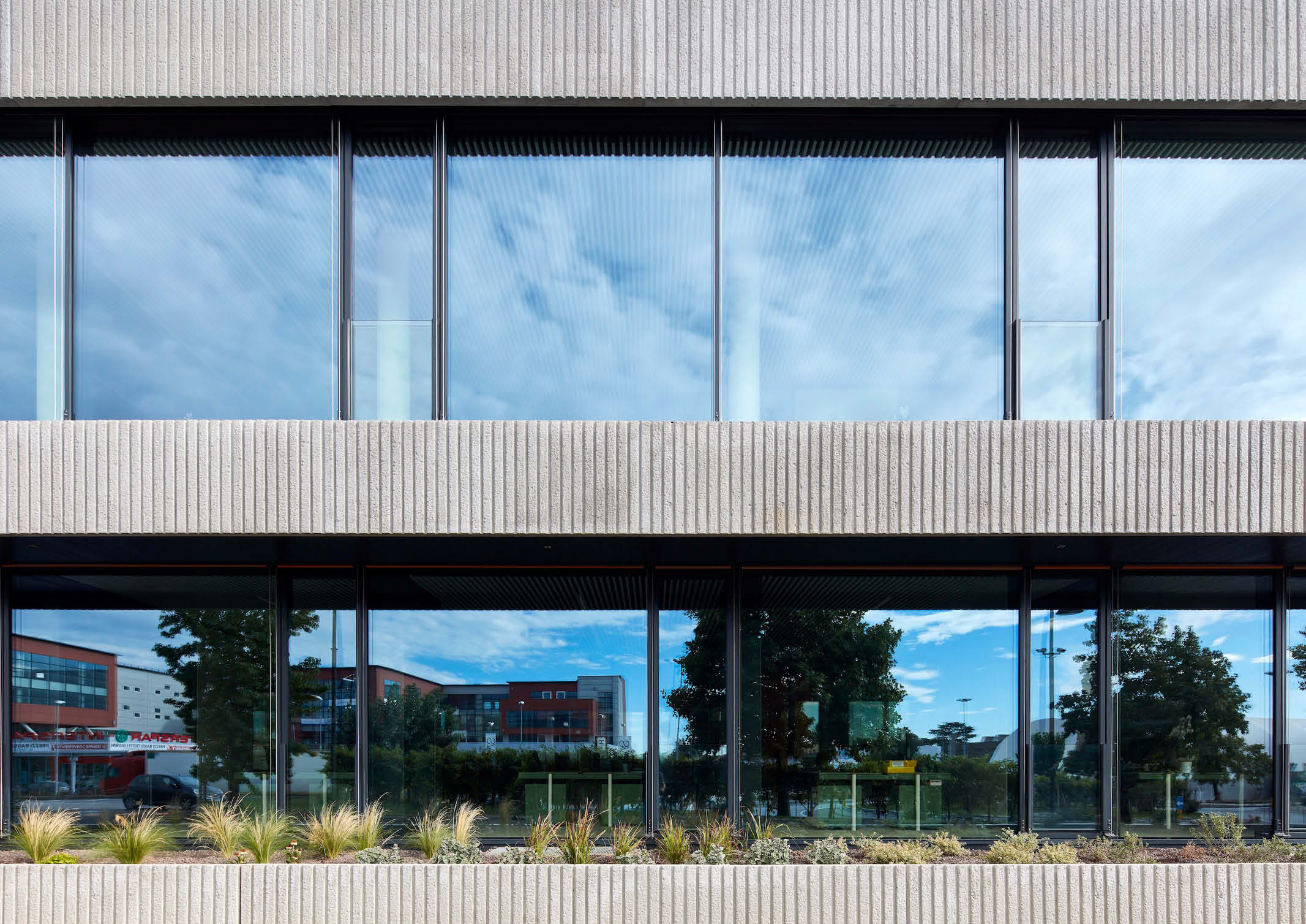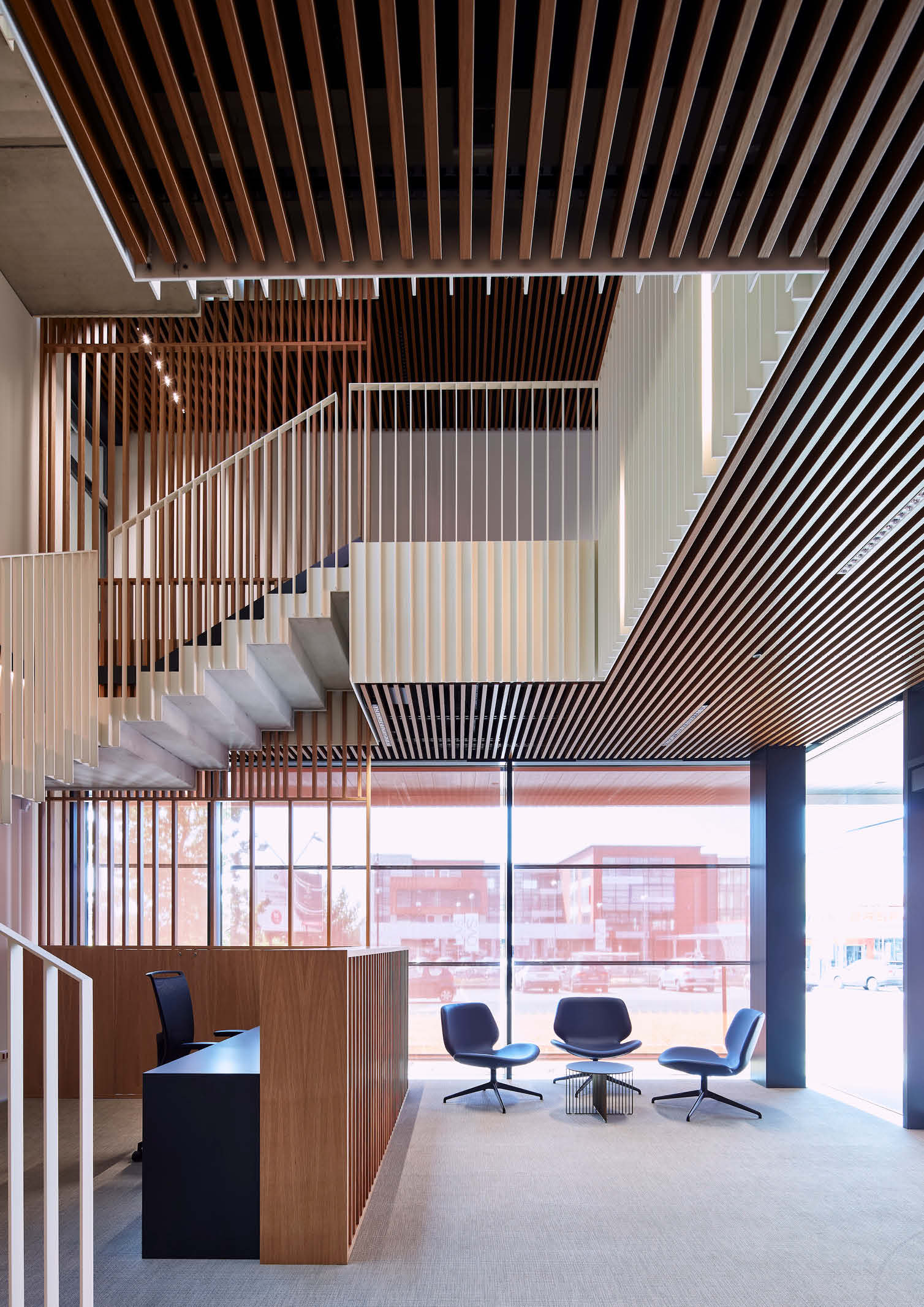 The intricate system of openings and screens also lends quality to the interior spaces, which strongly relate both to the outdoors, on the fronts facing south and east, and to the production areas located at the rear of the building, to the north. On the main façade, the architect created a spacious entrance with a recess in the ground floor. It is highlighted by a bright red septum that leads toward a grand staircase that serves the four levels. Wood counter ceilings echo the striped pattern found in the facade elements and serve a sound-absorbing function.