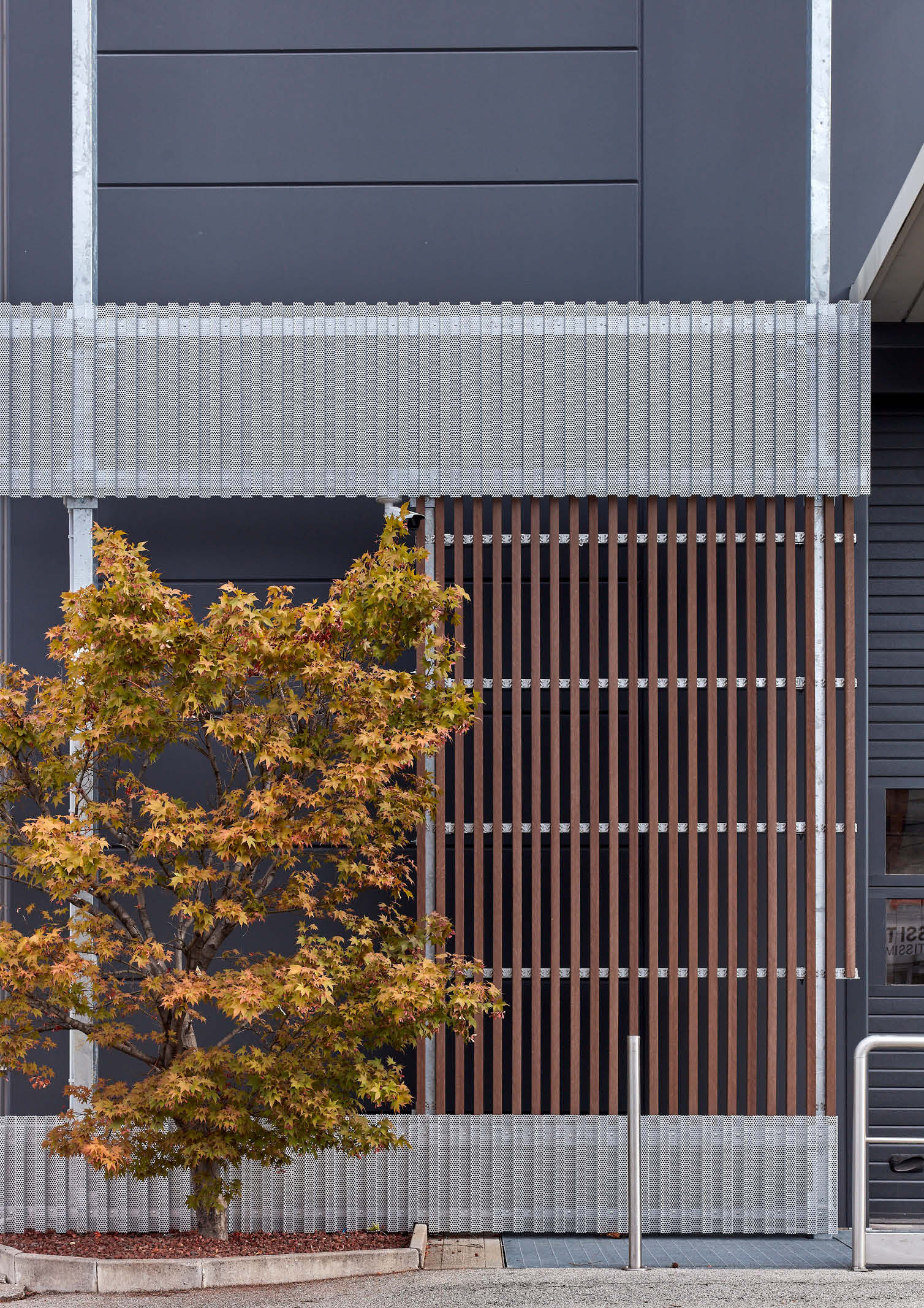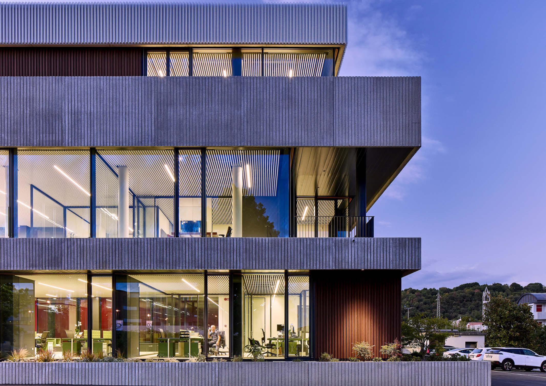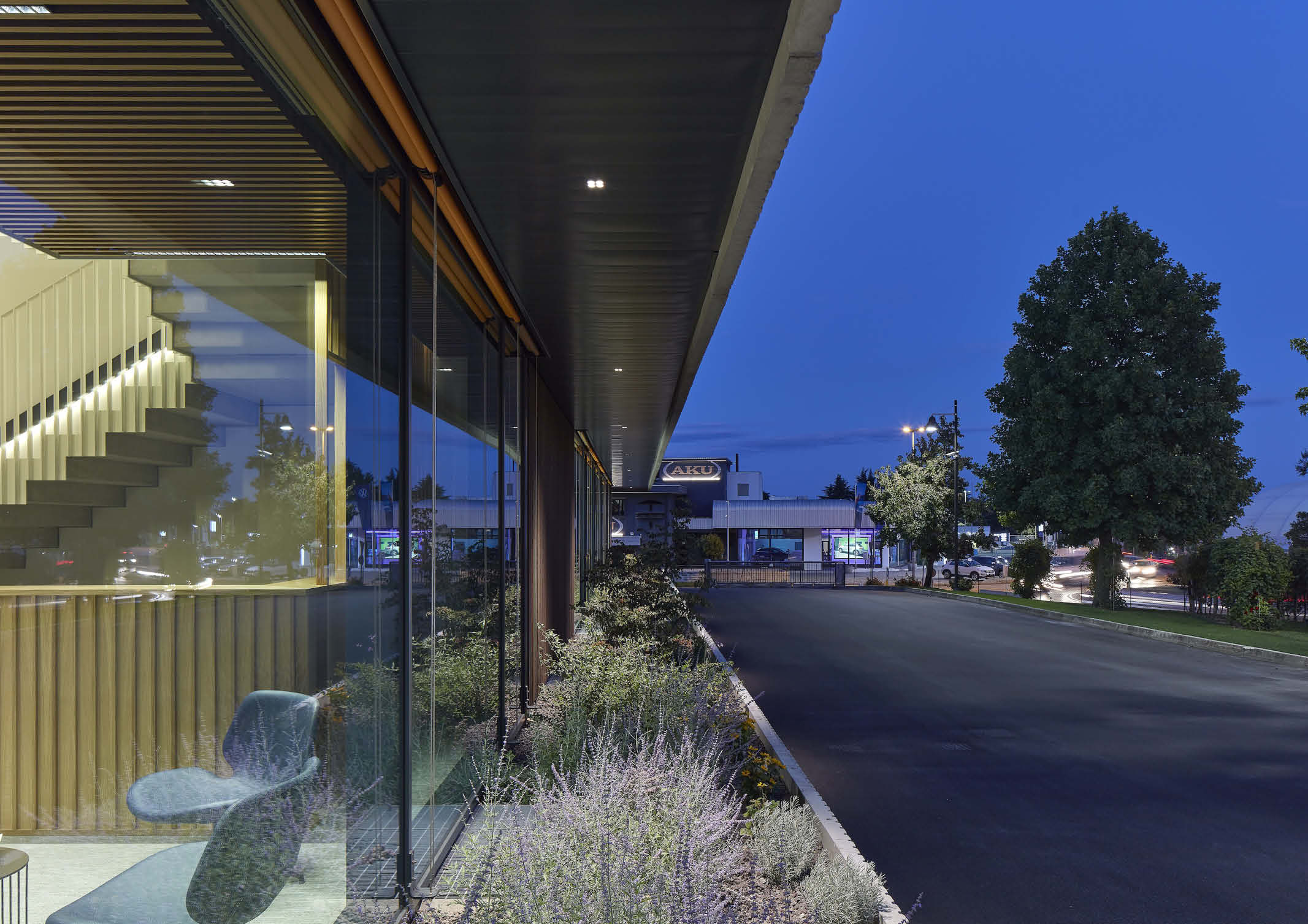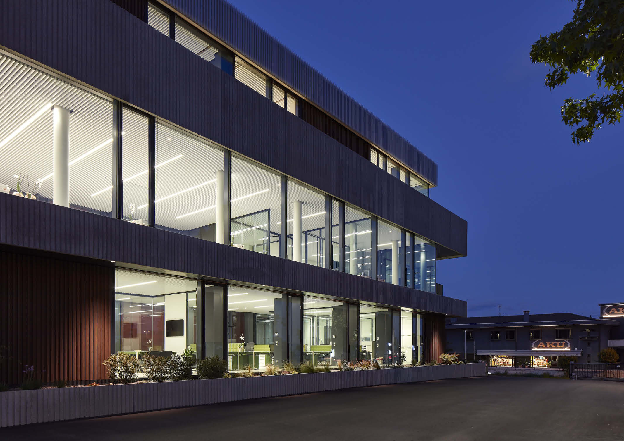 Michieli and Zanatta also share that such a choice is at the origin of the extension of the facade of the headquarters to engage the other adjacent, pre-existing buildings: a commercial outlet store and a warehouse. This project led to their successful integration. A galvanized iron frame supports a counter façade that is placed in front of the existing buildings, defining the framework on which the continuing horizontal band pattern is arranged. But it is a façade that reveals its content, both through transparency effects achieved by the metal and wooden screens and that it occasionally retracts, leaving portions of the pre-existing buildings fully visible.