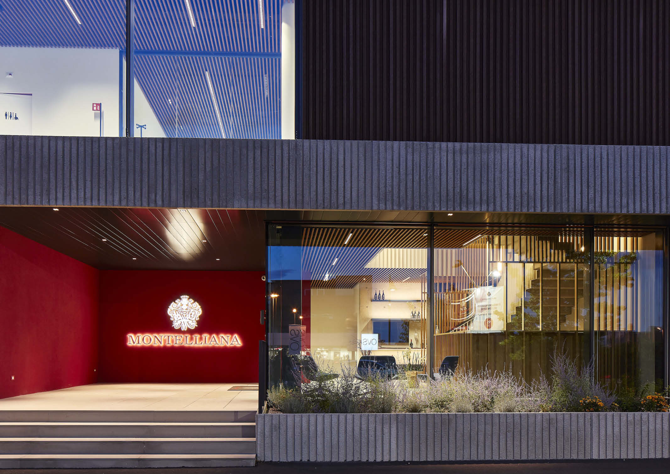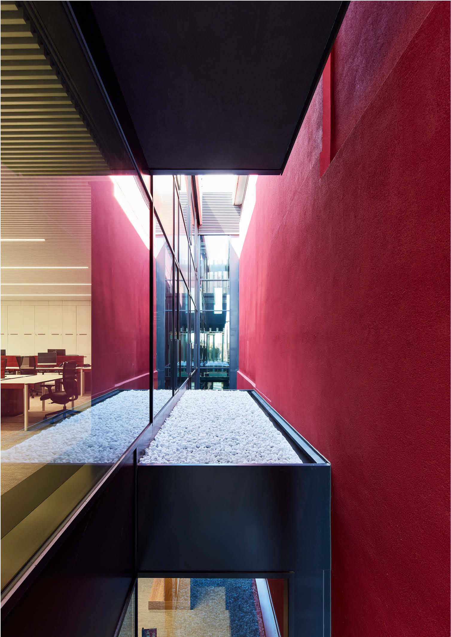 The color red reappears to mark the pre-existing building dedicated to wine storage and distinguish it from the addition behind the headquarters building. The two objects are physically separated but the space in between, which affords unexpected glimpses, is a place of connection and transition. It expresses the choice to hold even very different architectural elements together, putting them in dialogue.