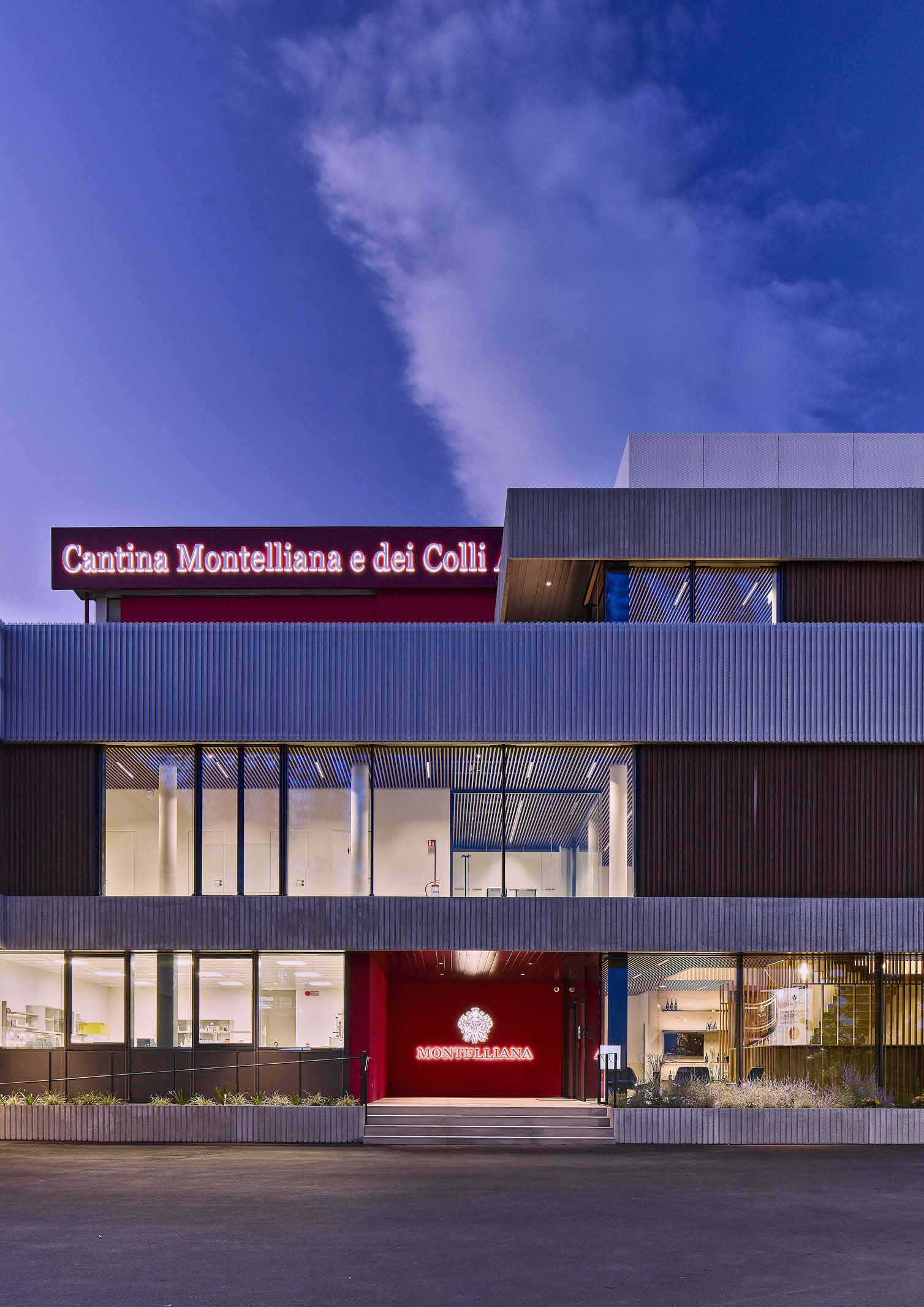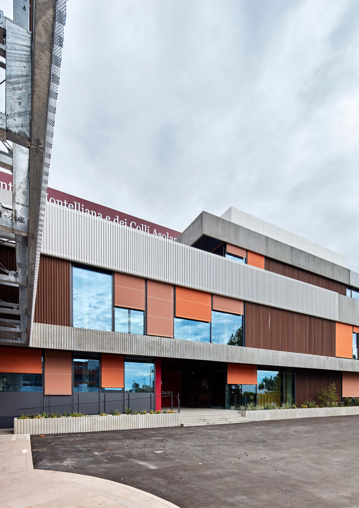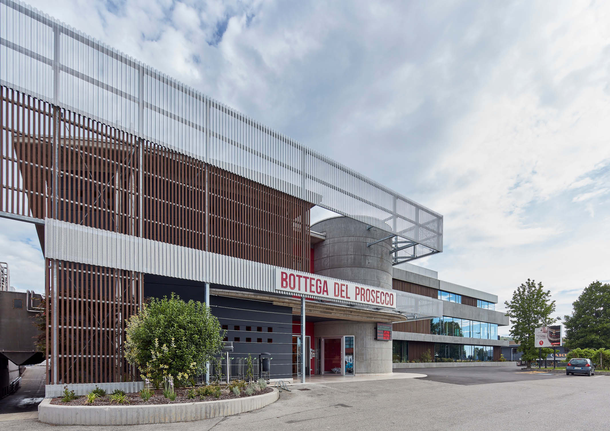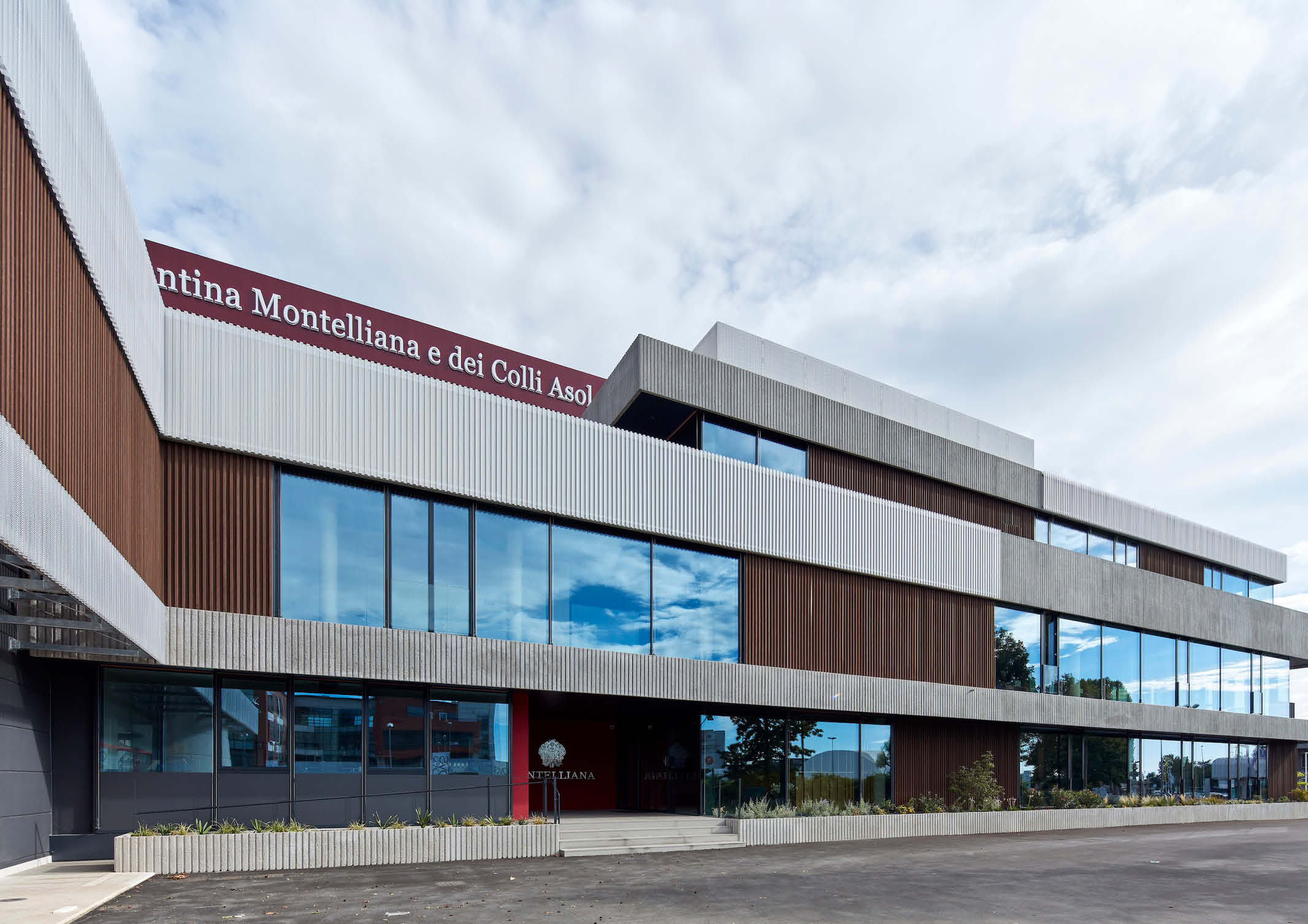 The block housing the headquarters of the wine company is situated at the very front of the production areas which features a rectangular floor plan. The area is about 50 meters long and 10 meters wide, with three above-ground floors and one basement. The total area is about 1,800 square meters. The space accommodates technical and commercial offices, a meeting room, a tasting area, the boardroom, the executive office, and a terrace for events. Its facade, which extends on the south side parallel to Schiavonesca Road, is organized in bands of different heights and with varying overhangs.