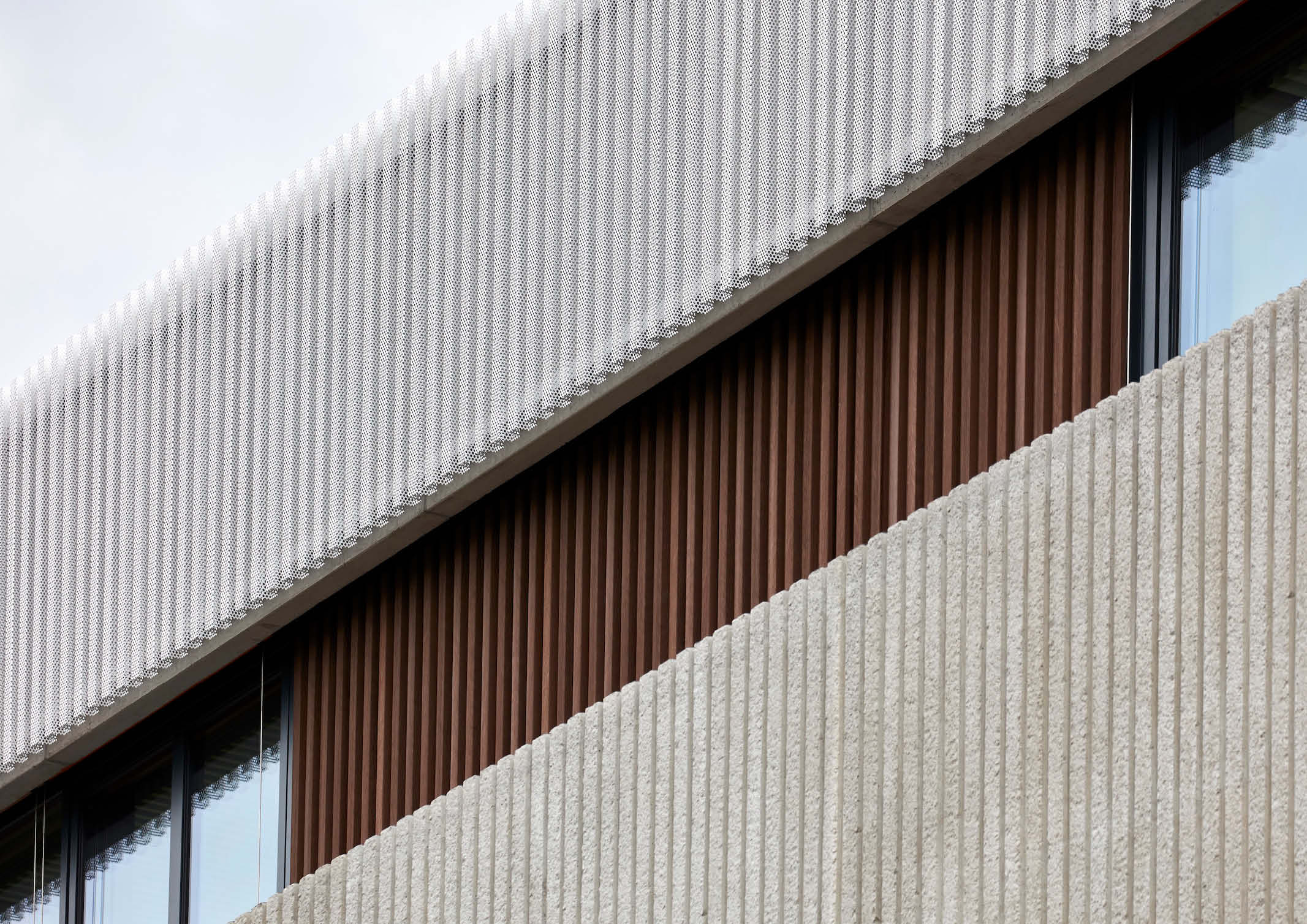 Michieli and Zanatta explain that pre-formed concrete and perforated corrugated sheet metal surfaces alternate with extensive ribbon windows, frequently interspersed with wooden screens. The concrete, sheet metal, and wooden elements repeat a pattern of dense vertical grooves that offer somewhat a counterpoint to the distinct horizontality of the overall composition. Assorted and promiscuously distributed, these elements yield a lively and coherent design, in which roll-up curtains of different widths and in two shades of orange partake, the two shades obtained by the architects by occasionally flipping the side of the curtain intended for the interior to the outside.