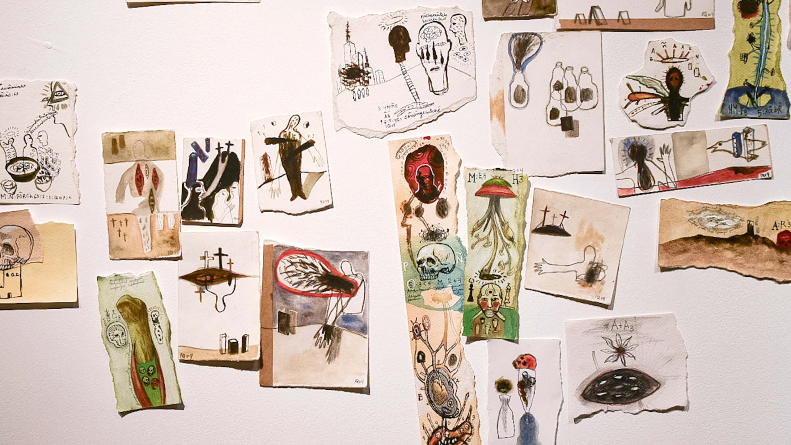 Ian Quirante’s site-specific installation of archival drawings and his assemblage titled “Pozioni”