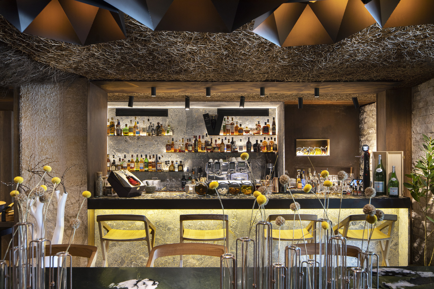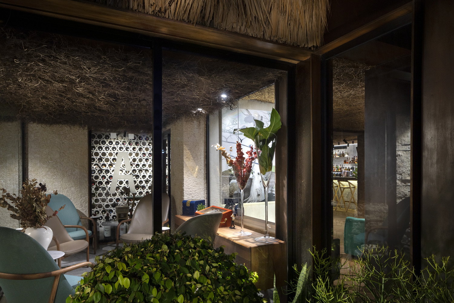 The restaurant proudly displays what it has to offer. Its design features local craftsmanship and materials that mirrors the flavors and cultural roots of its cuisine. A portico framed with aged steel tola announces the restaurant’s entrance. It stands tall as a modern element against the rustic backdrop formed by the thatch roof and ashlar finish. The building’s profile is rectangular and uniform in shape, putting these elements in the spotlight.