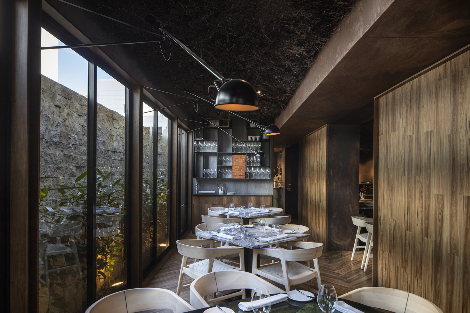 The single story elevation of the structure supports mobility and visibility requirements for managing a dining experience. An open layout connects the reception, bar, and the main dining room. At maximum capacity, a total of 40 guests can be accommodated. A sense of spaciousness is achieved through the wide floor-to-ceiling windows that are framed by perimeter gardens and walls.