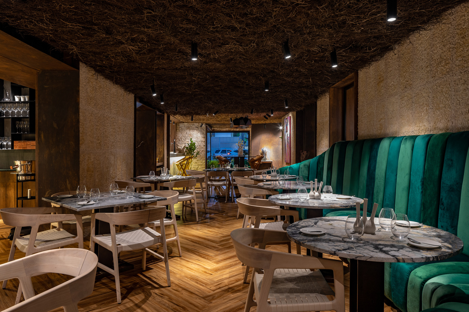 A strategic lighting plan uses sculptural dome pendant lights that highlight focal points in conjunction with track lighting over each table. Traditional Dominican wood block molds inspire the back bar shelving design. The flooring appears to be a classic pattern of herringbone wood planks. Different seating arrangements offer unique views, from the site’s greenery to the dynamic work seen from the open kitchen.