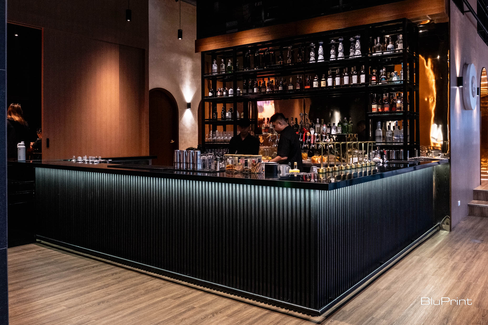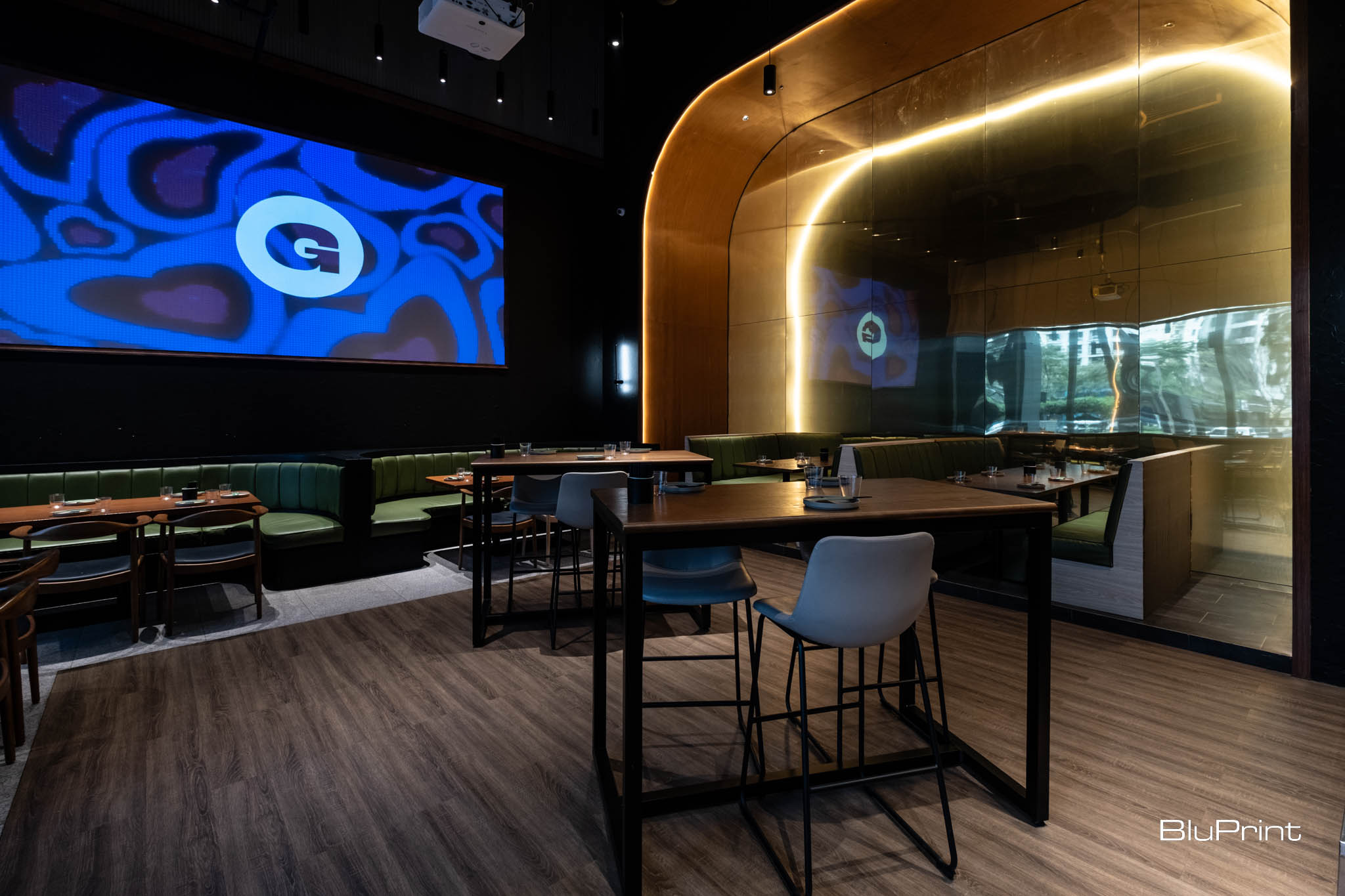 The restaurant interior design is elevated by reflective gold aluminum panels. A golden archway divides the space, doubling as a striking architectural feature that mirrors its surroundings. In the lounge area, dark tones and warm lighting create a sophisticated yet inviting atmosphere. This is complemented by versatile seating options, including private booths and a function room.