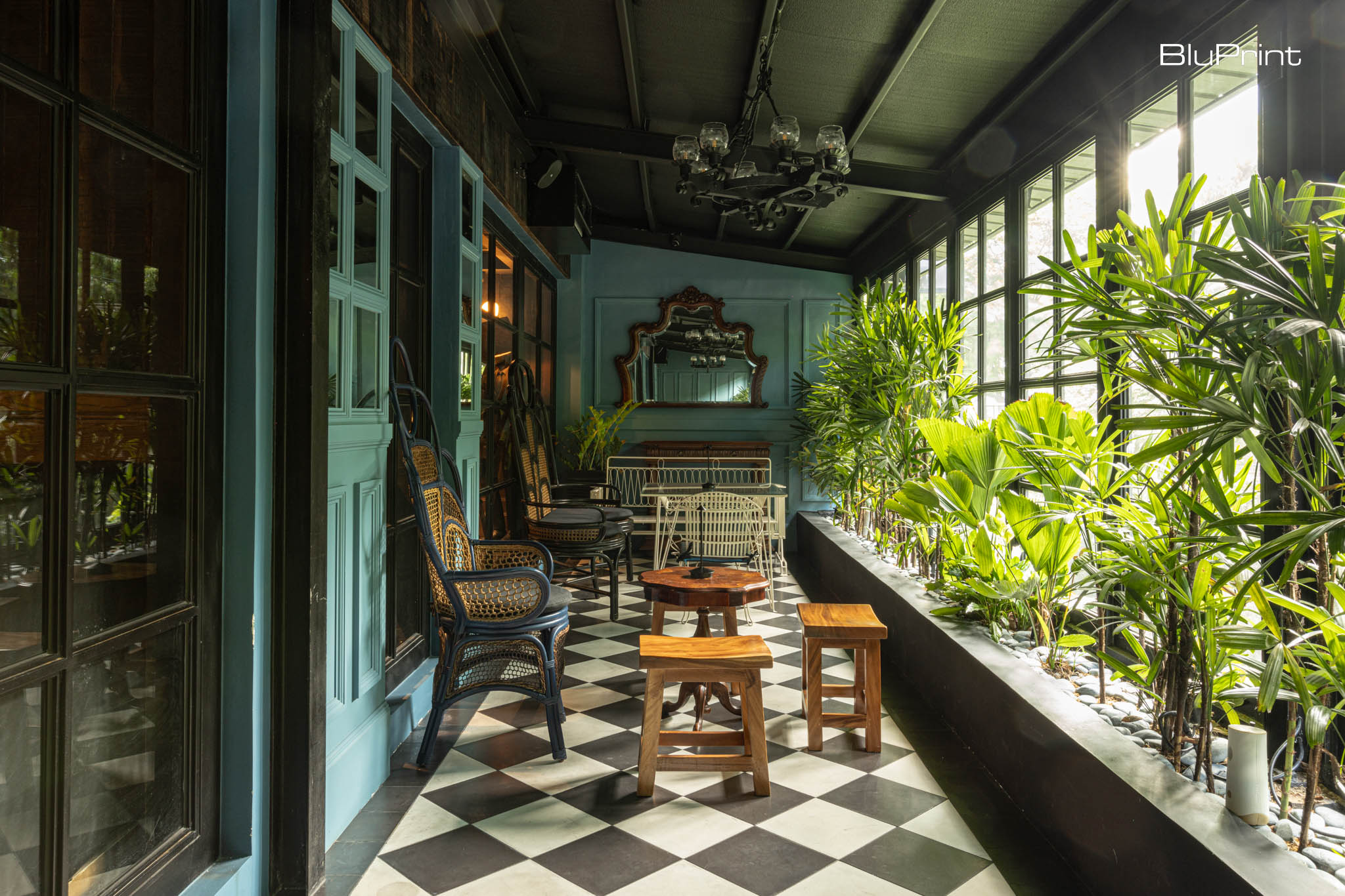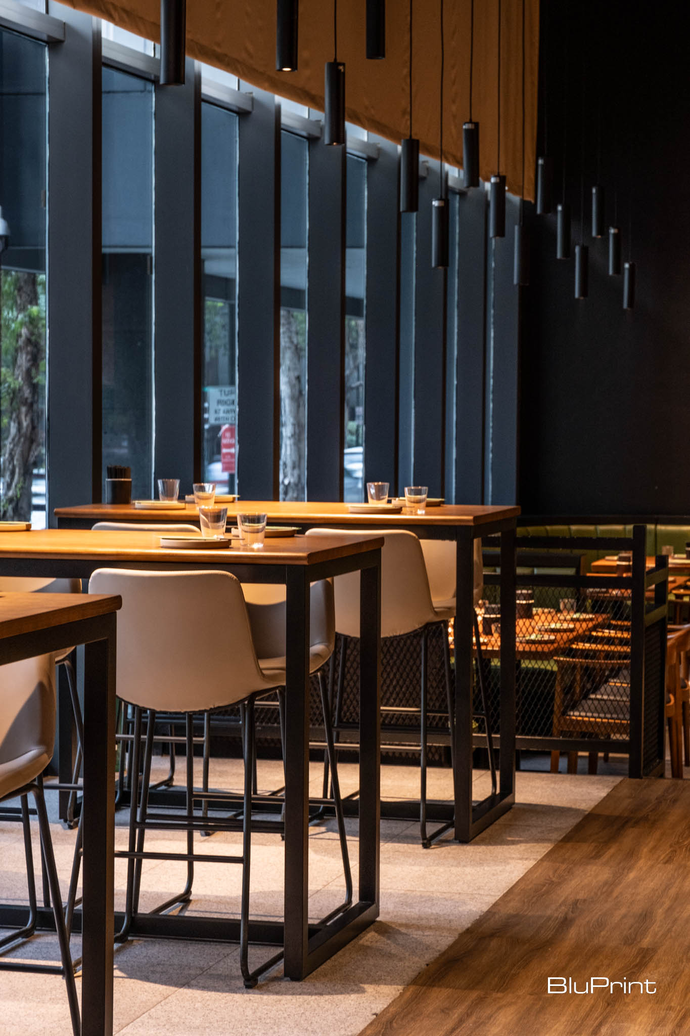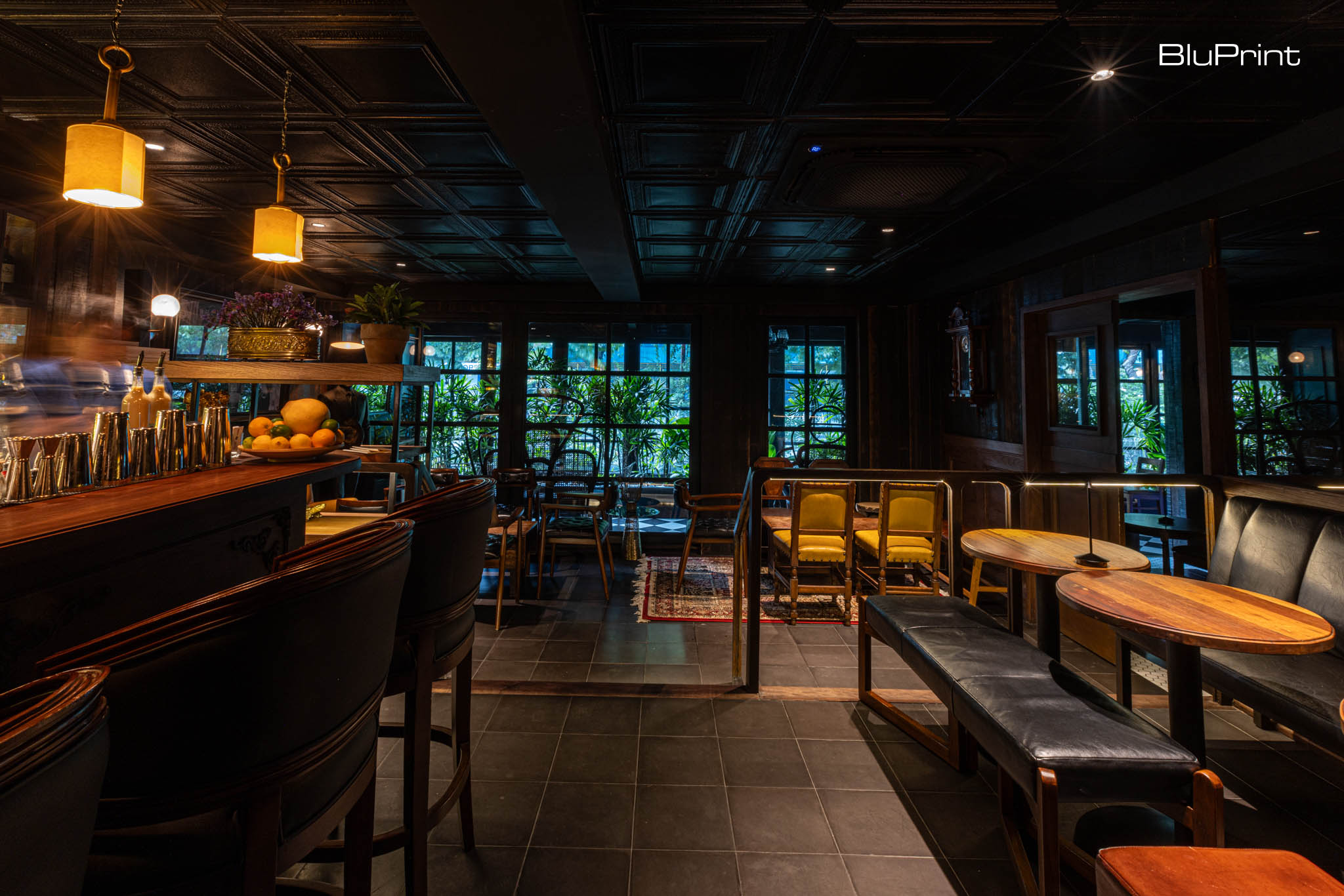 The venue opens with a modern tavern ambiance. Outside is the muted blue façade, al fresco seating adorned with plants, and terracotta tiles. Its dimly lit restaurant interior design features dark grey walls, black leather banquettes, and a checkered floor.