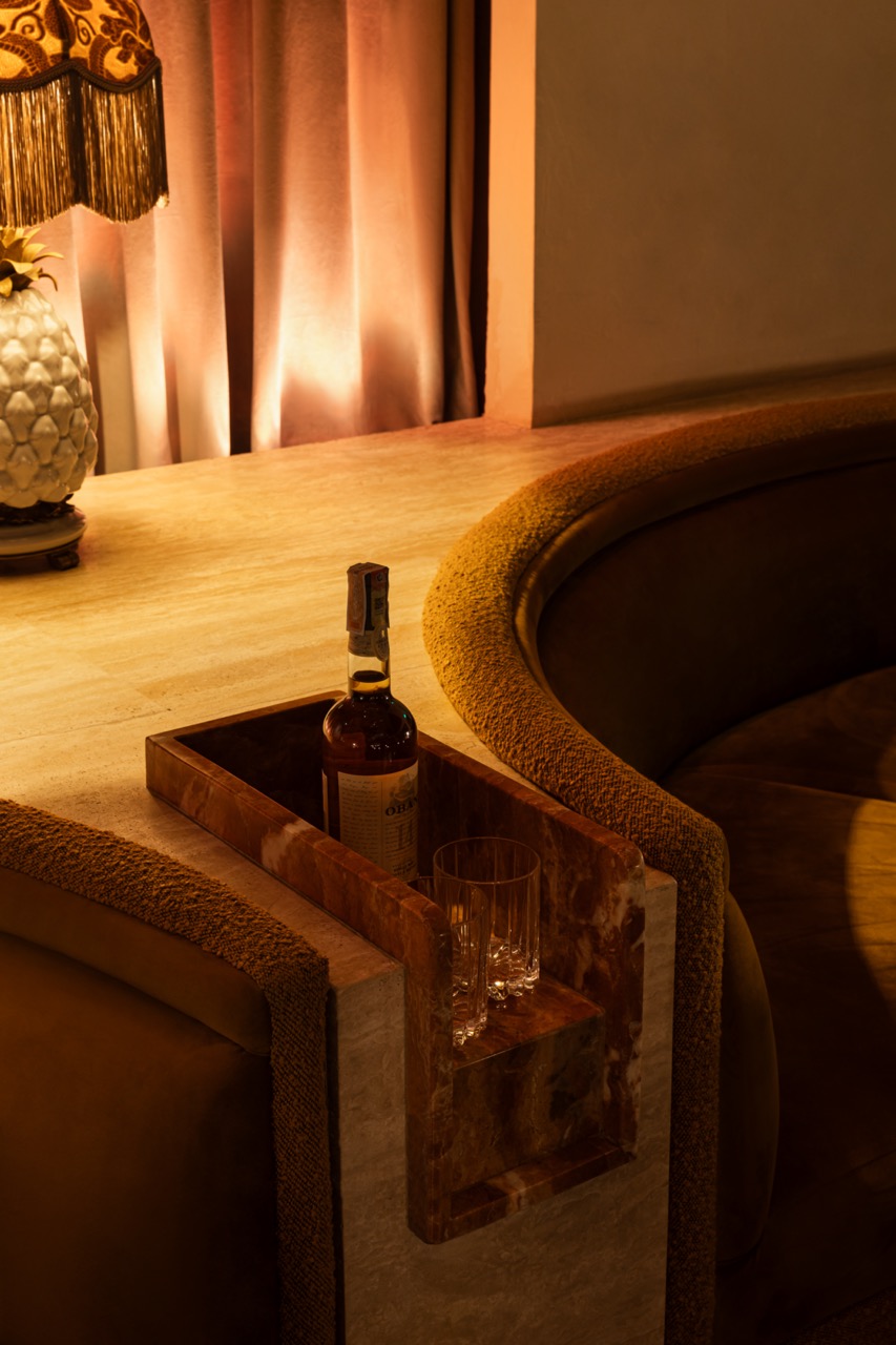 Kish’s vision extends to every corner, from handcrafted plates and Italian-designed water pitchers to the tropical wallpaper behind the coffee bar. Guests are greeted by a row of suamei trees and a live-edge wooden table. These evoke Kish’s cherished memories of sipping coffee under the trees. The theme continues with an antique bar cabinet, used practically rather than as a display, bridging functionality with storytelling.