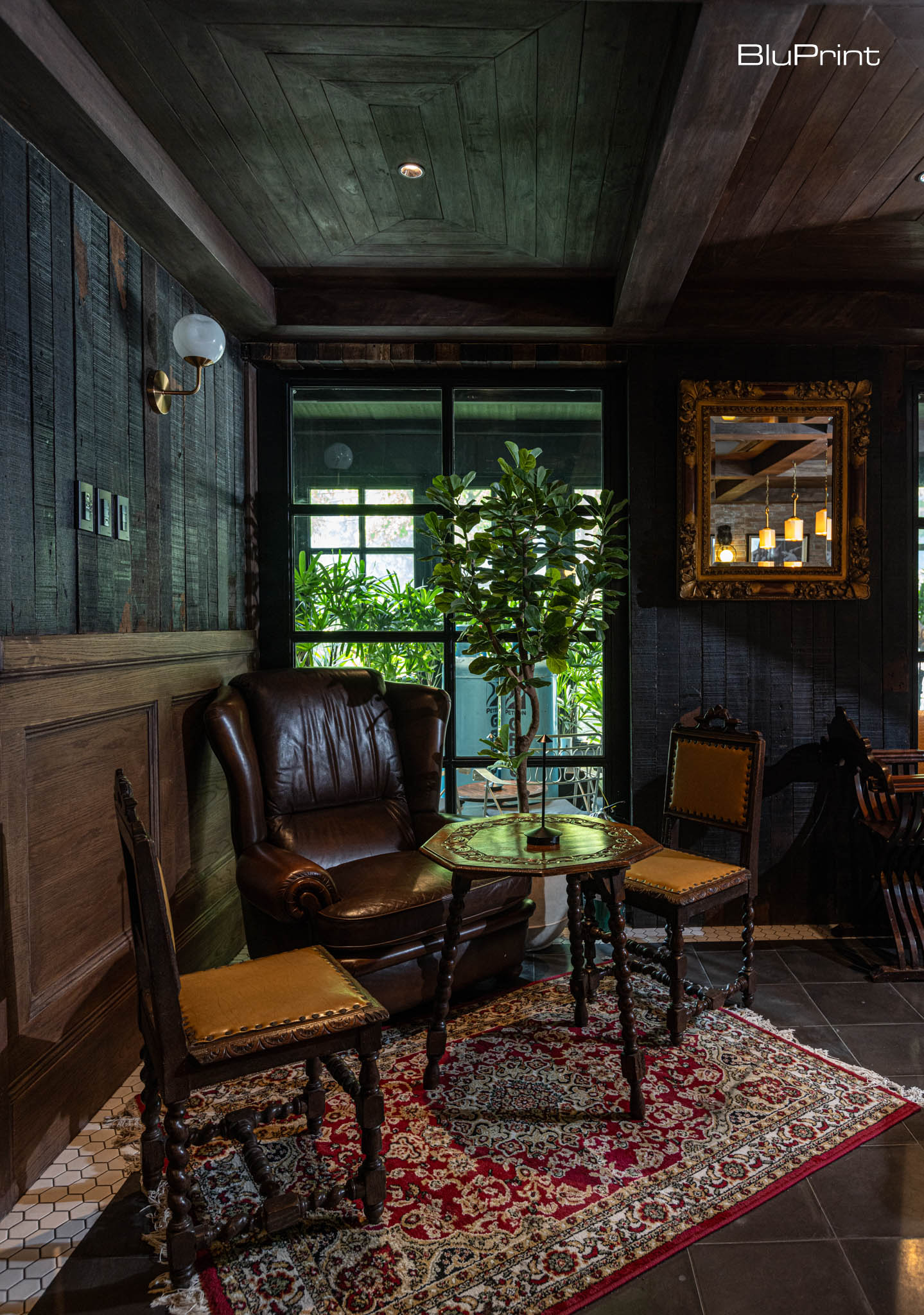 The hidden gem of this outpost is the Village Bar, concealed behind a black curtain. Its interiors evoke a rustic, cozy vibe with Persian rugs, vintage furniture, and distressed wood finishes. Carol Karthe, Ladrilyo’s founder, used repurposed materials to minimize waste, creating an inviting and sustainable space. To address the building’s low ceilings, elevated seating and decorative black-tile ceilings were incorporated, adding depth and openness.