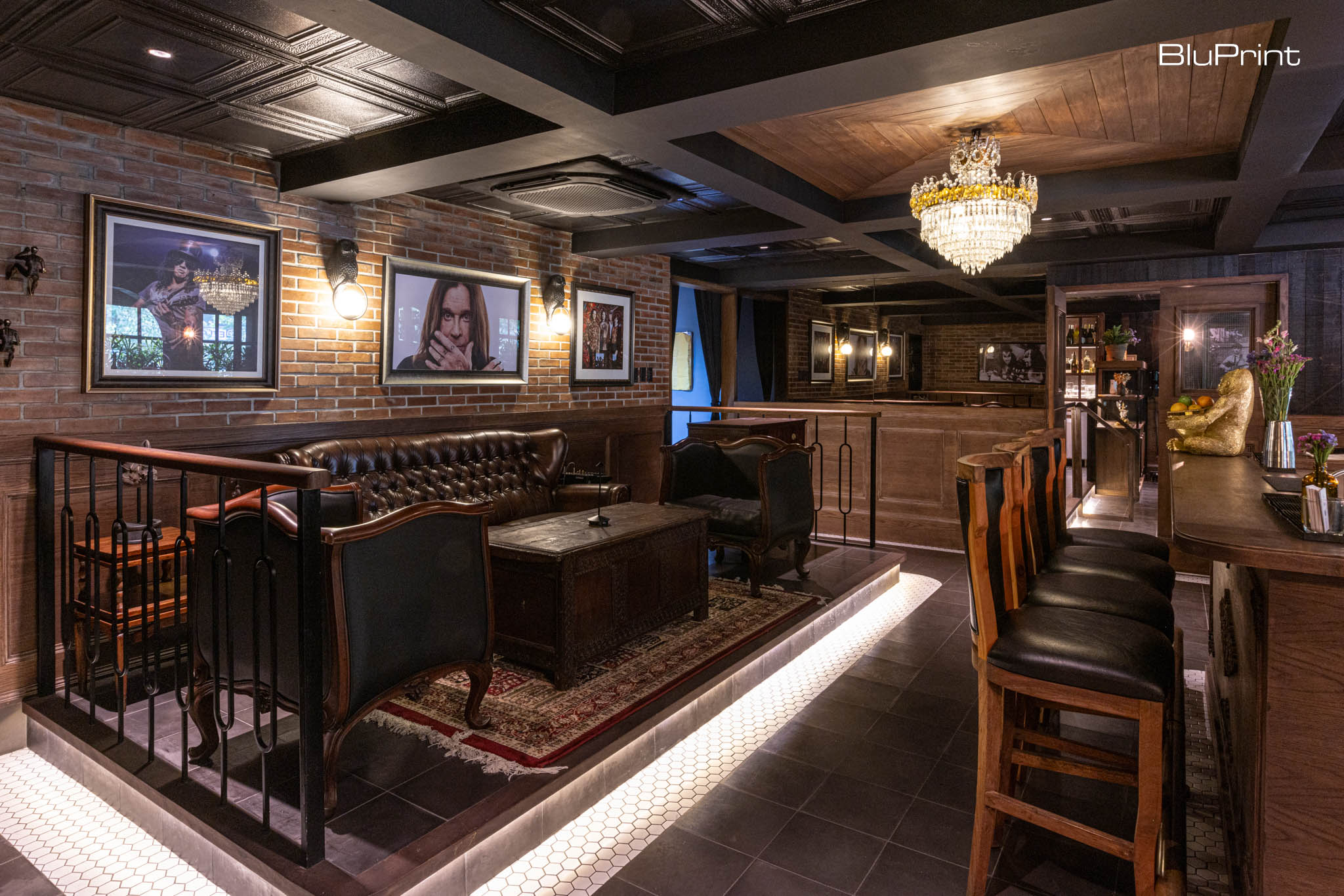 The Village Bar is divided into distinct areas, each with unique elements such as wooden coffered ceilings, wainscoting, and framed photos of rock legends. The design preserves Wildflour’s rustic identity while embracing modern elegance, ensuring every corner offers a tailored experience.