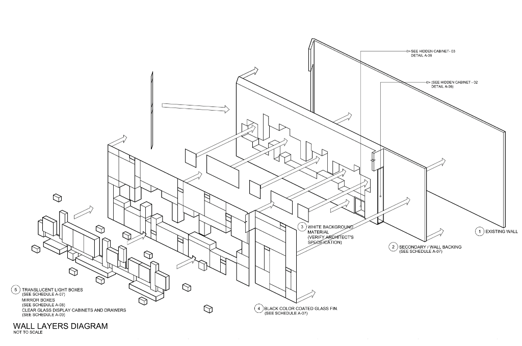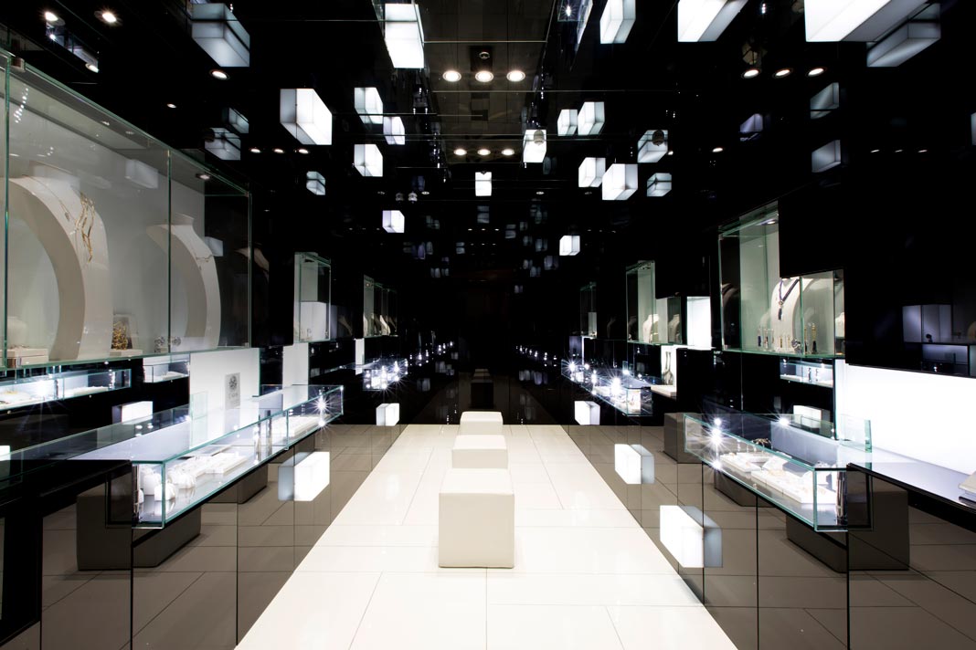 “We were inspired by an Arturo Luz painting, a black Armani dress, and a diamond mine,” recounts Austria, whose expertise, the color-blind Sunga says, is working with color, texture and material. They arrived at the concept of a diamond in the rough. Says Sunga: “Entering a diamond mine, you see the crystals attached to the walls, so we took off from that, abstracting the essence of a diamond mine to display the jewelry, which also suits Denovo because they’re new to the business of jewelry. They too are like diamonds in the rough… that’s the architectural allegory.”