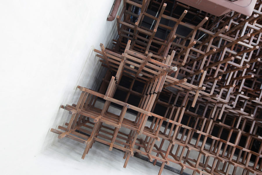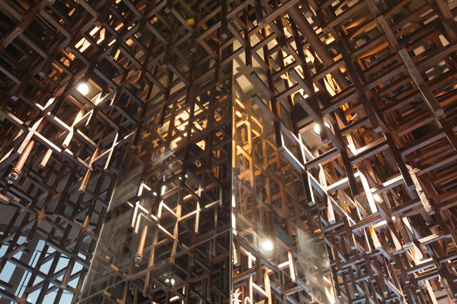 The complex looking structure is quite simple. Instead of constructing a matrix or latticework and attaching it to the ceiling, Yulo used individual steel rods of different lengths. Perpendicular spokes are welded on alternate sides of each rod and spaced in progressively shorter distances towards the lower end of the rod. When positioned just so, rods and spokes appear welded to one another.