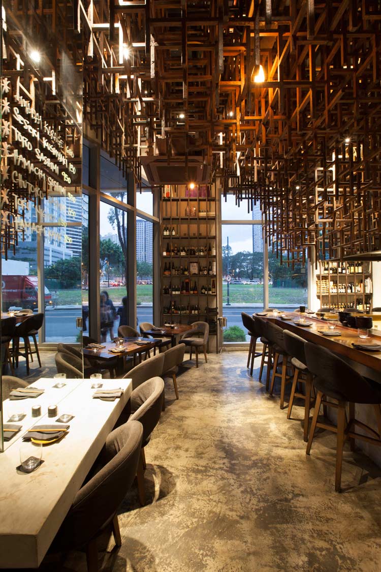 Yulo talks about the use of mirrors for certain walls, copper for the bar counter, concrete for the floor, and lighting at different heights within the steel cloud. In closing, Yulo speaks of how, apart from the shōchū wall, the design makes several Japanese references without displaying literal Japanese artifacts.