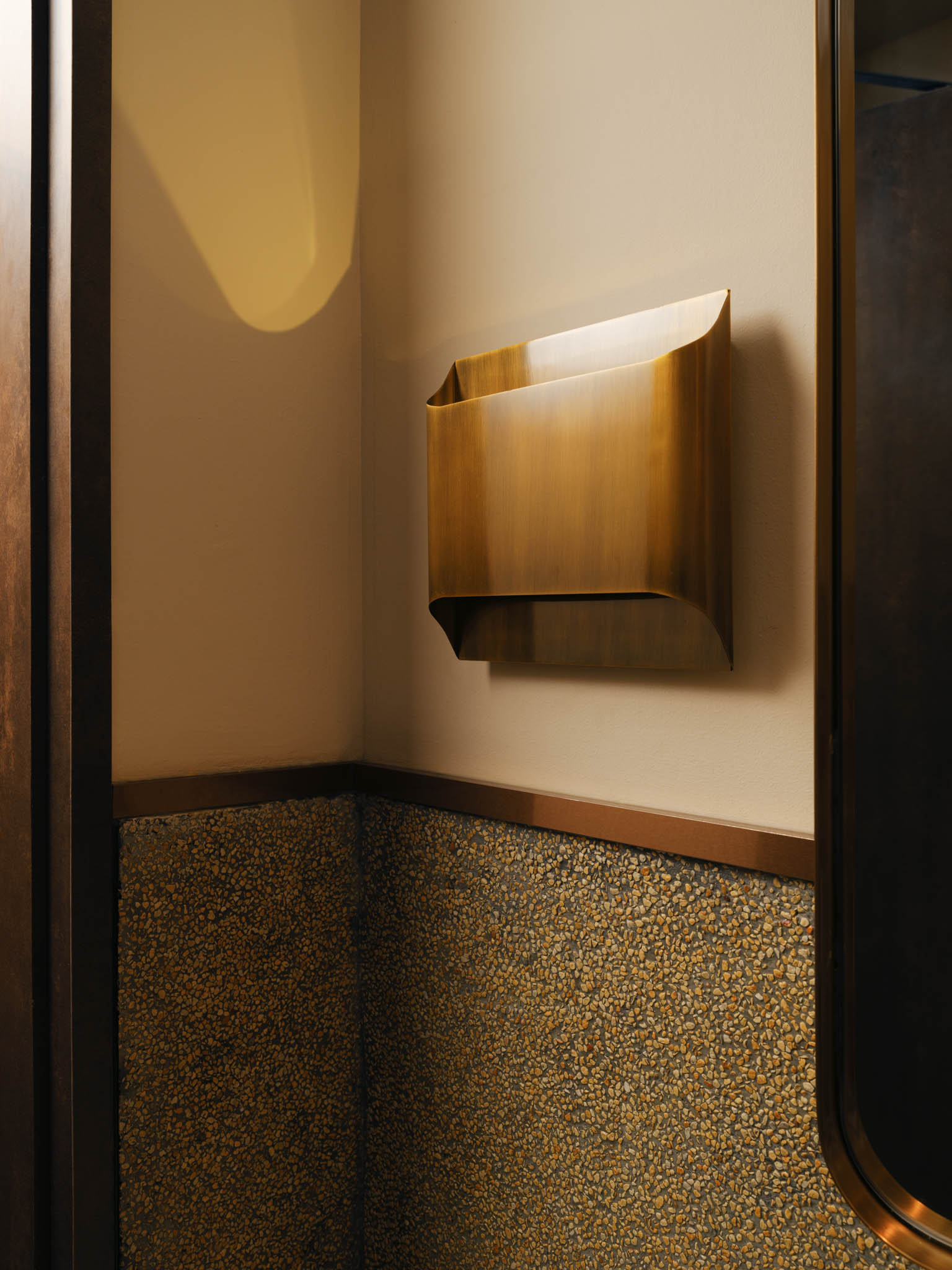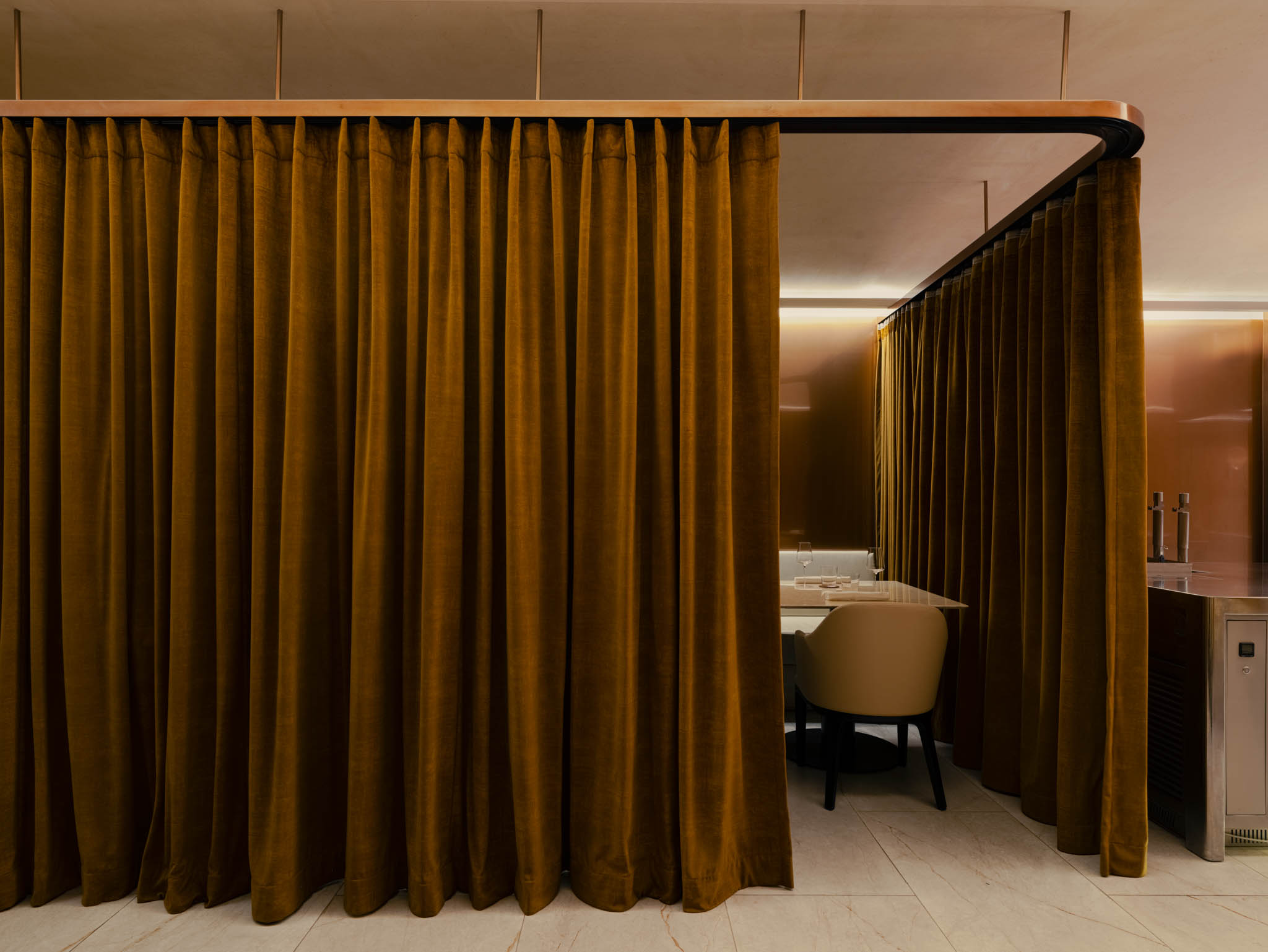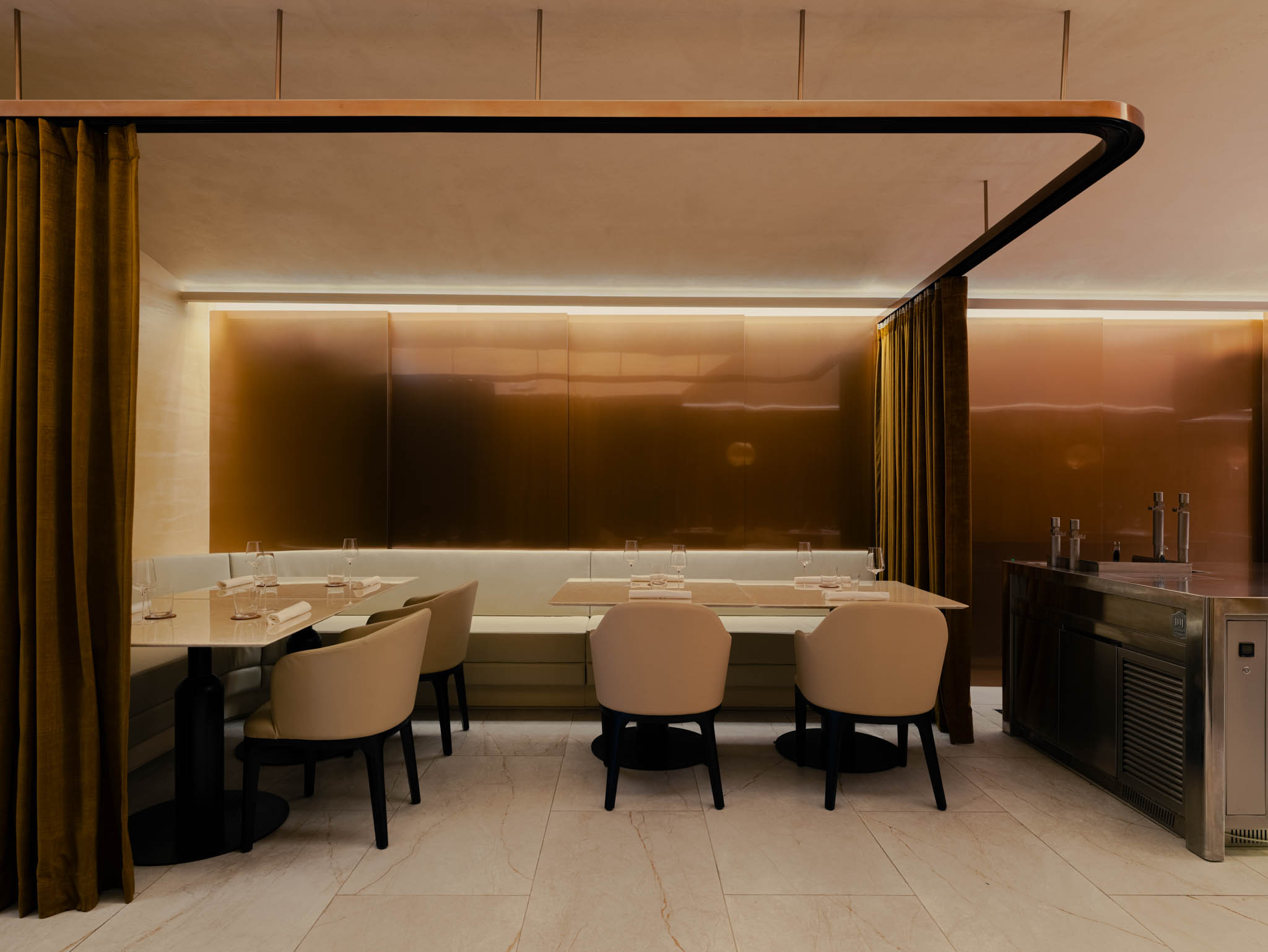 On the other side, bronze wall panels are tessellated on the back of the private dining area and open kitchen. This geometric pattern breaks the space’s overall fluid design without disrupting the cohesiveness of the restaurant.