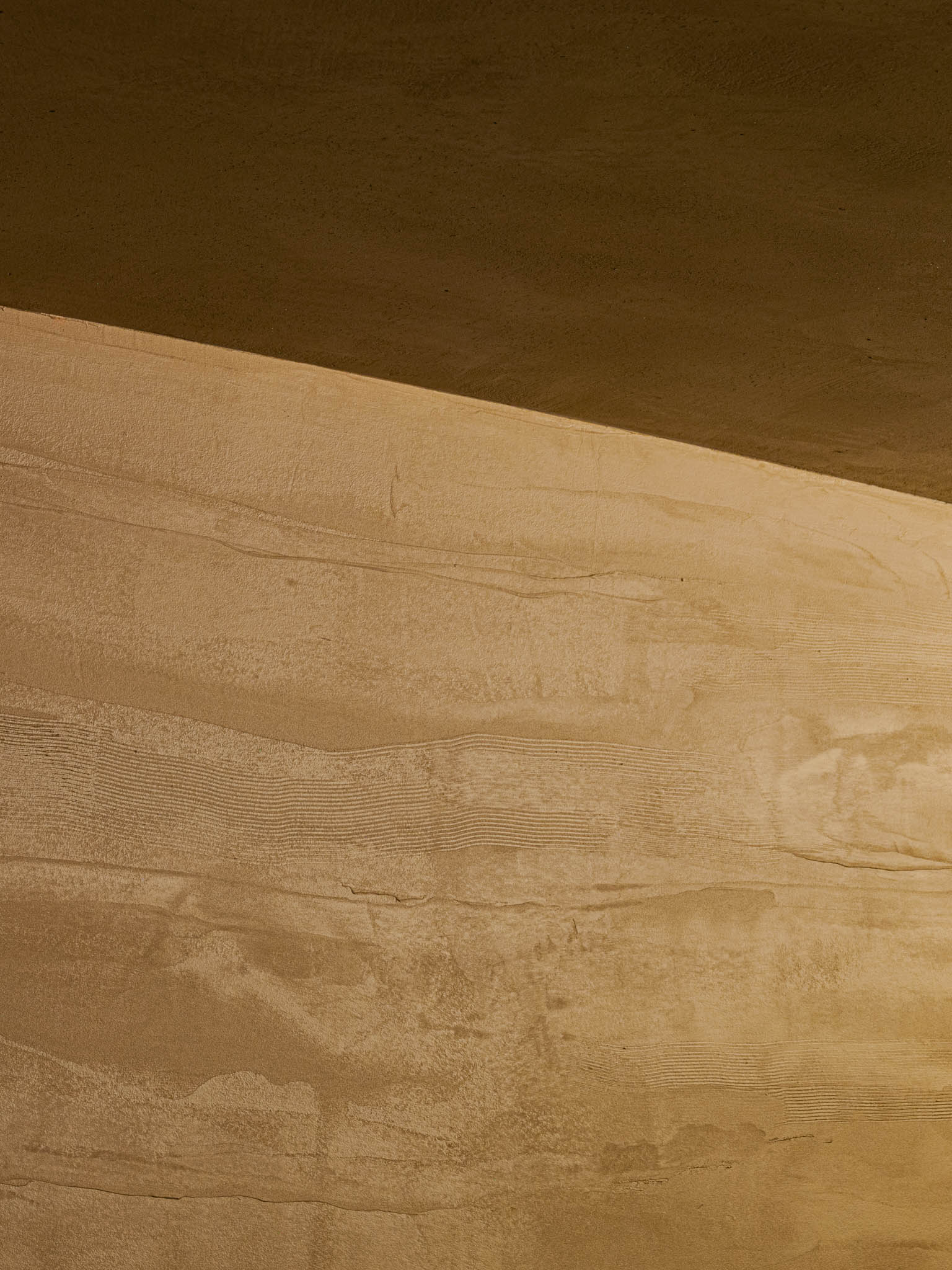 Sheathing the entire room is beige pearlescent plaster matched with the beige travertine finish of the ceiling. The marble-like flooring makes a seamless transition from floor to wall, creating a clean and minimalistic aesthetic.