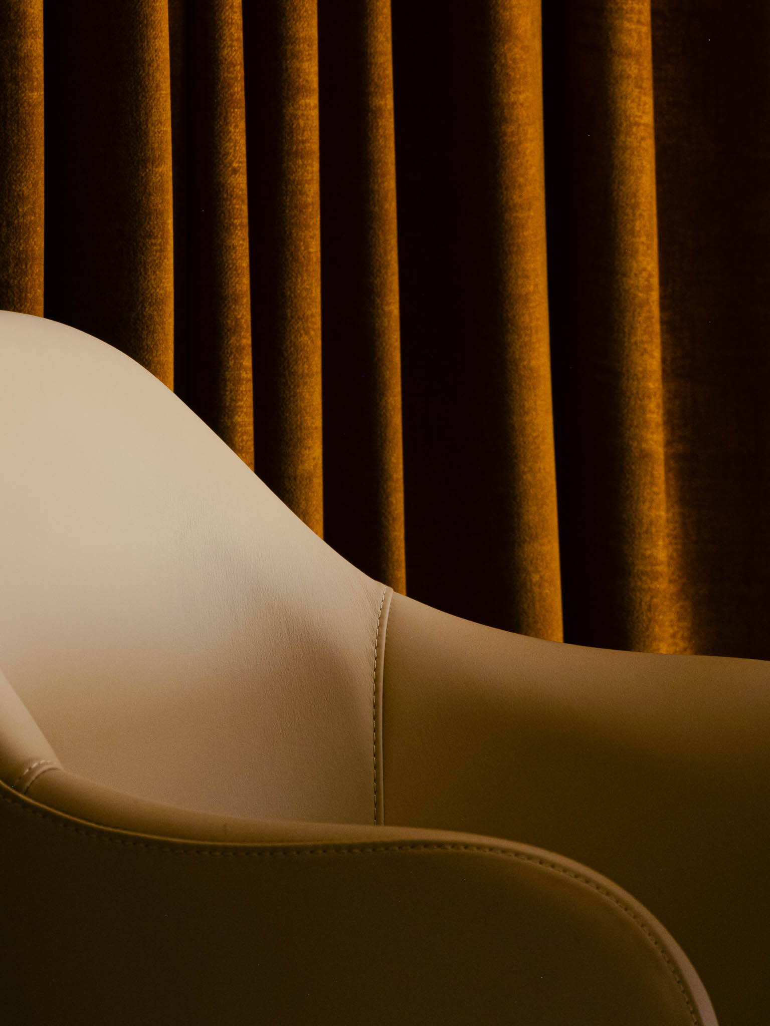 Adhering to the intention of creating a neutral and warm ambiance, Lazareva and Sudiro had the furniture custom-made from natural marble and leather. And to add a bit of glamor, they maximized the velvet curtains, covering the stretch of wall behind the tables.
