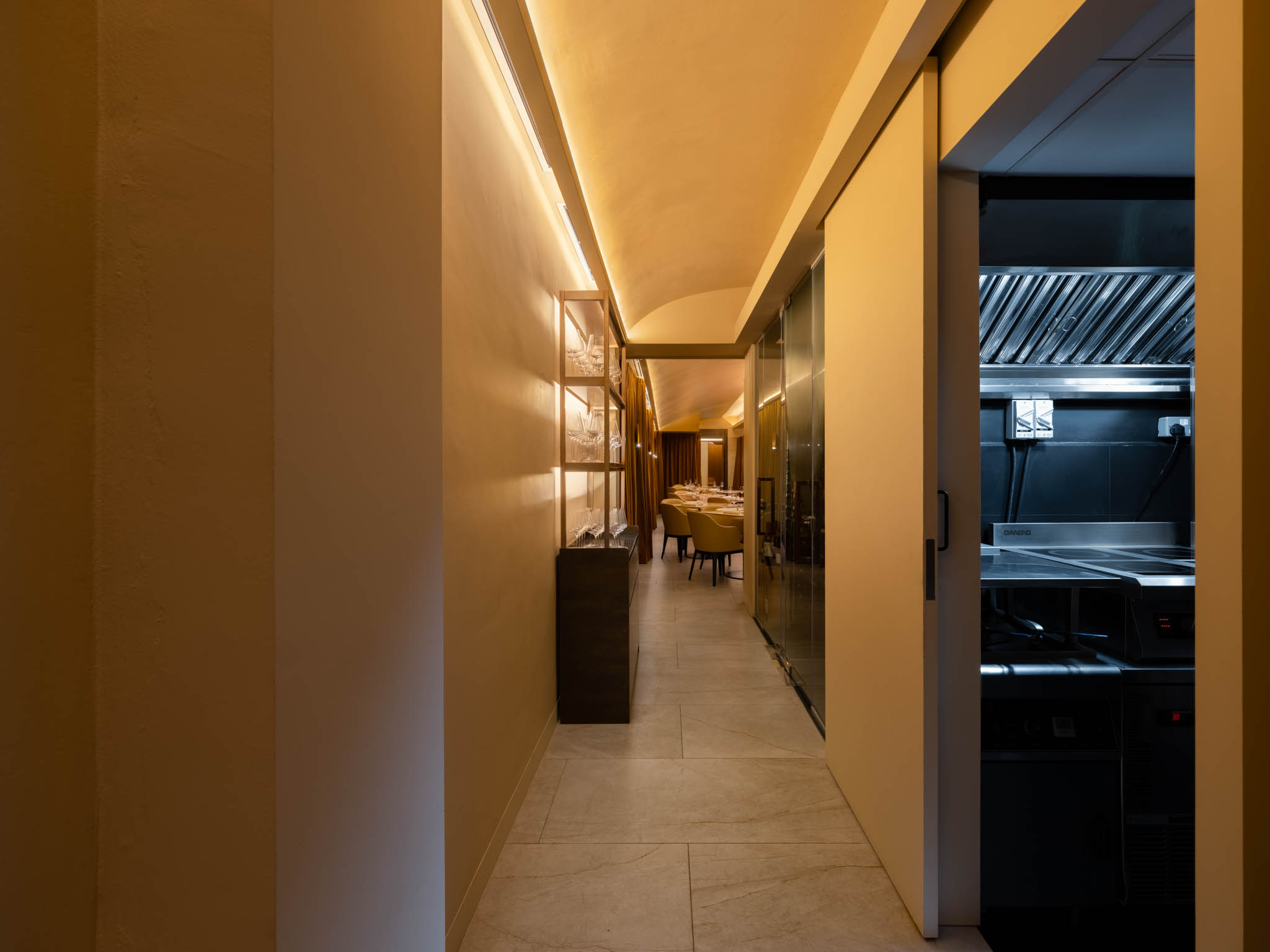 Nestled at the rear of the Lerouy restaurant is the backstage of its operations. The wine cellar, the technical kitchen, and restrooms all mirror the style of the main areas. Similar to the gray and steel design of the open kitchen, the technical kitchen maintains a sleek and industrial aesthetic, with stainless steel surfaces and professional-grade equipment on full display.