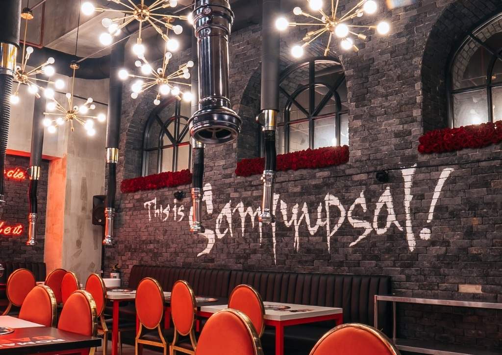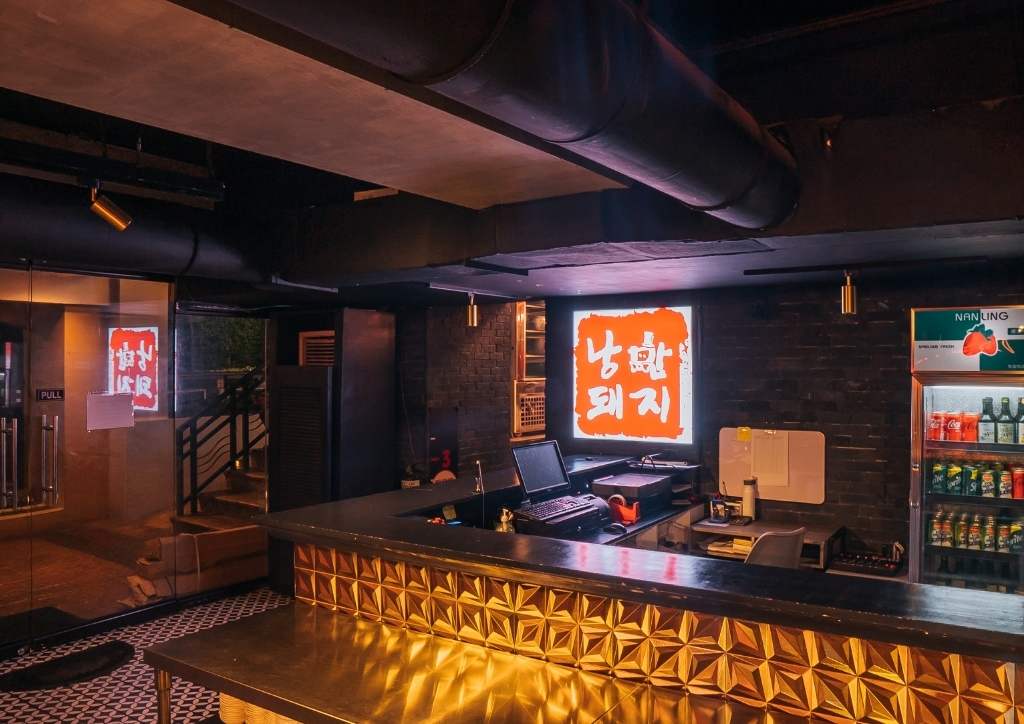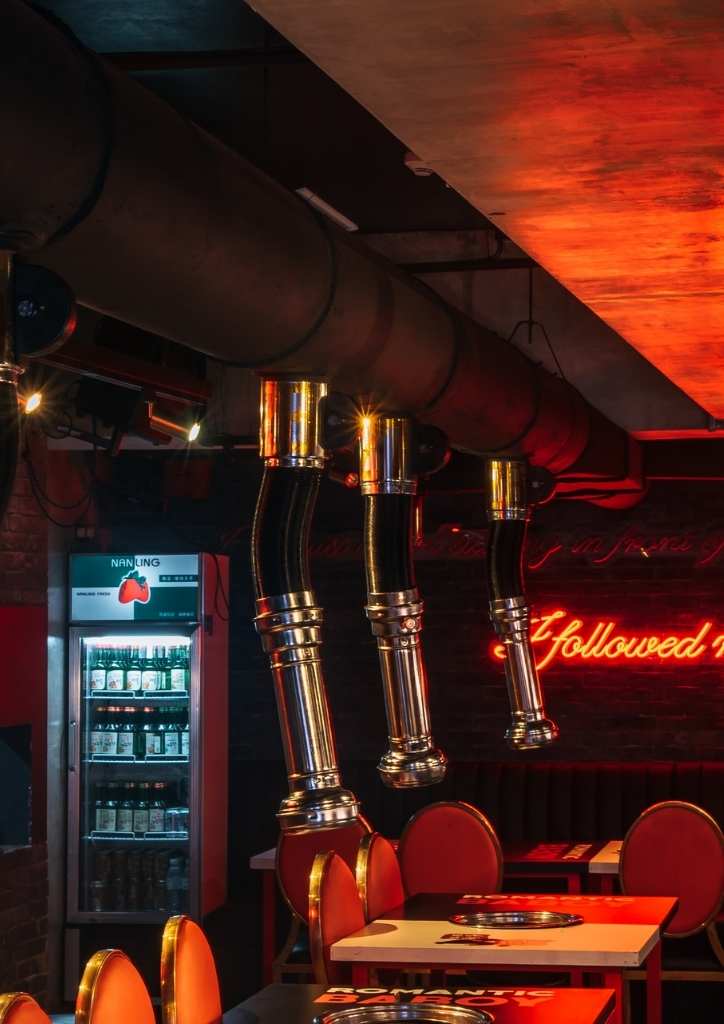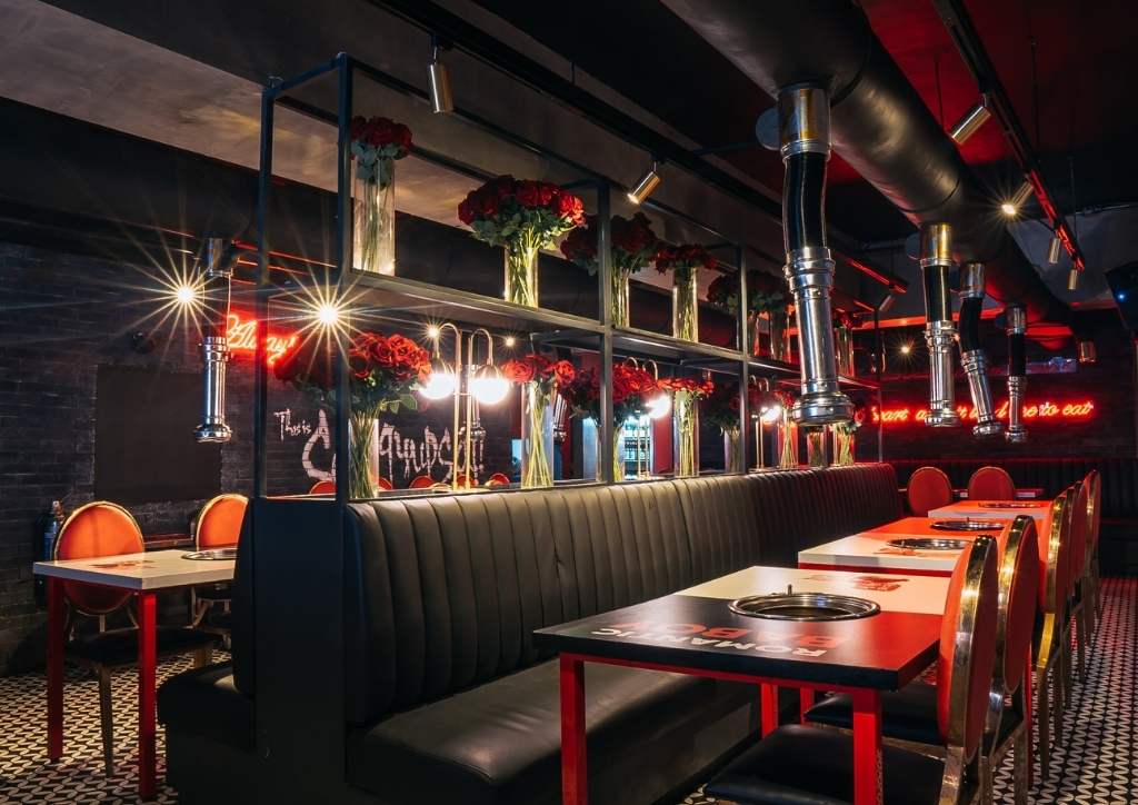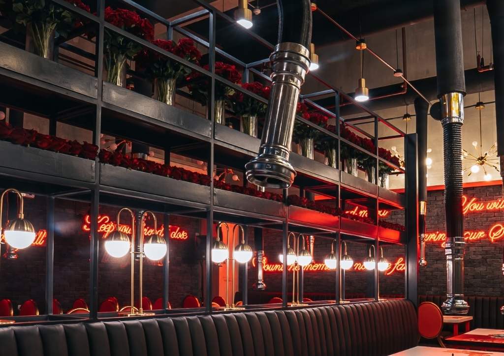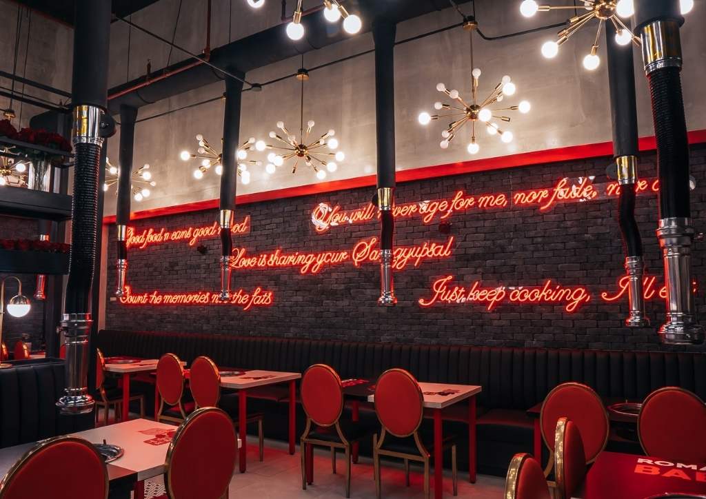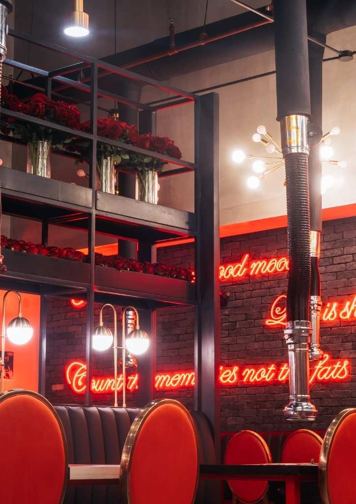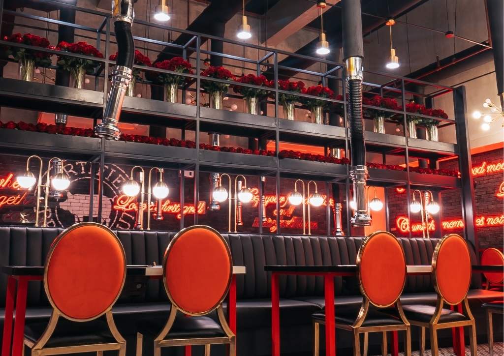 The result was a mix of neo-romanticism interior concept and Romantic Baboy’s industrial design. It also maximized the upper and lower areas. The red accents came in the form of witty quotes in red neon lights and red roses all over the space. Meanwhile, gold accents in the form of furniture and lighting fixtures complete the look. The brick walls, ceiling, and flooring served as the dark gray canvas of the entire design.