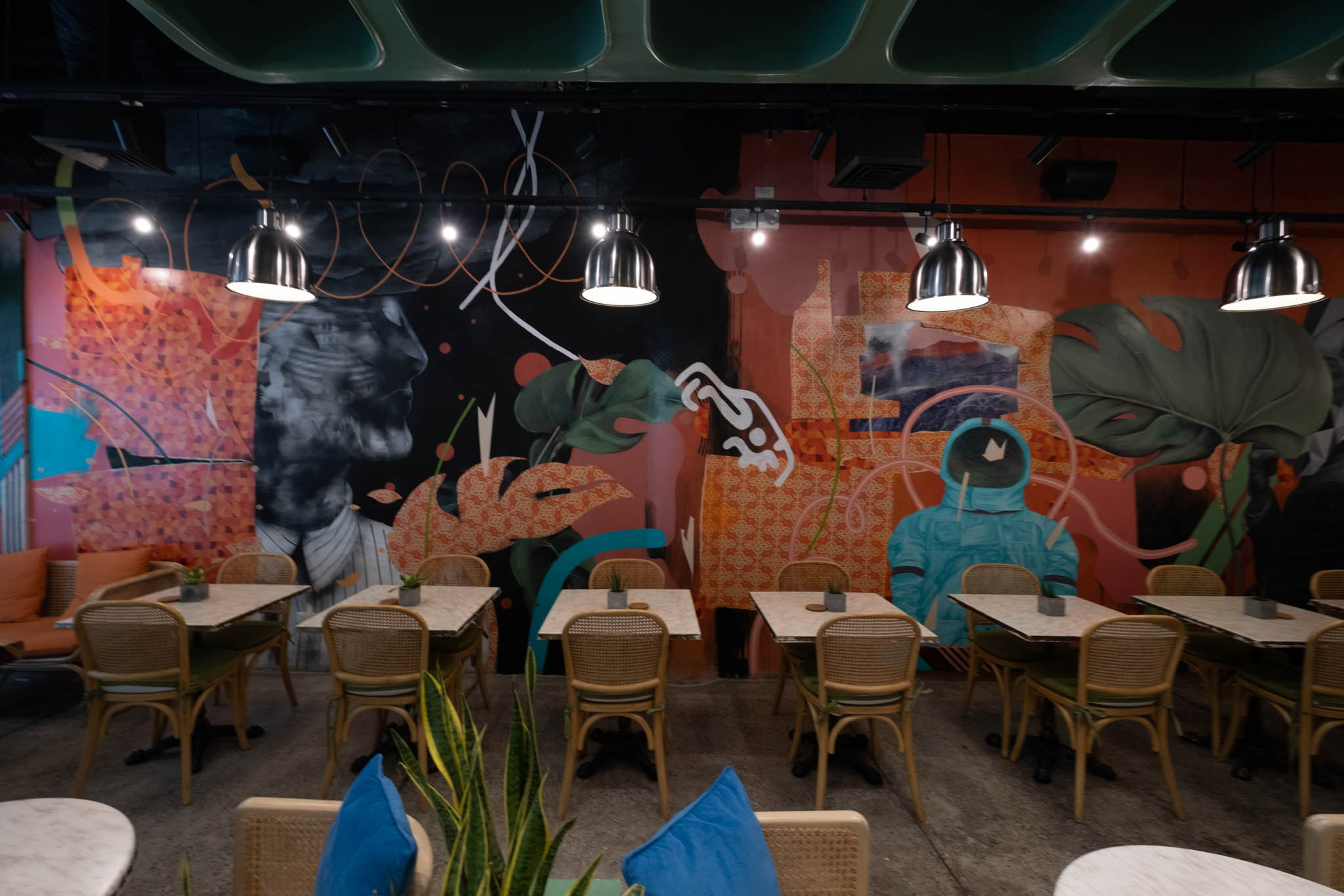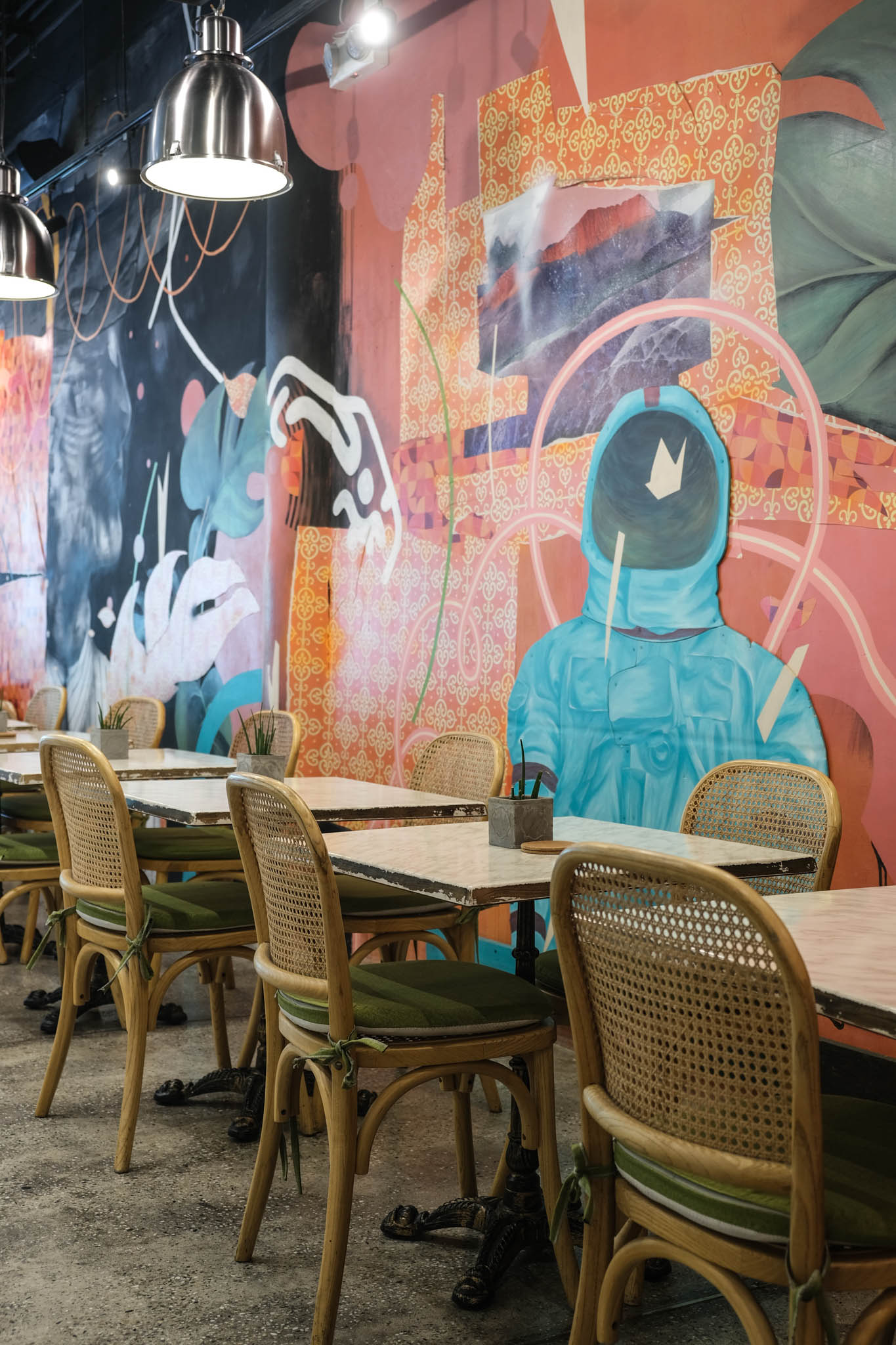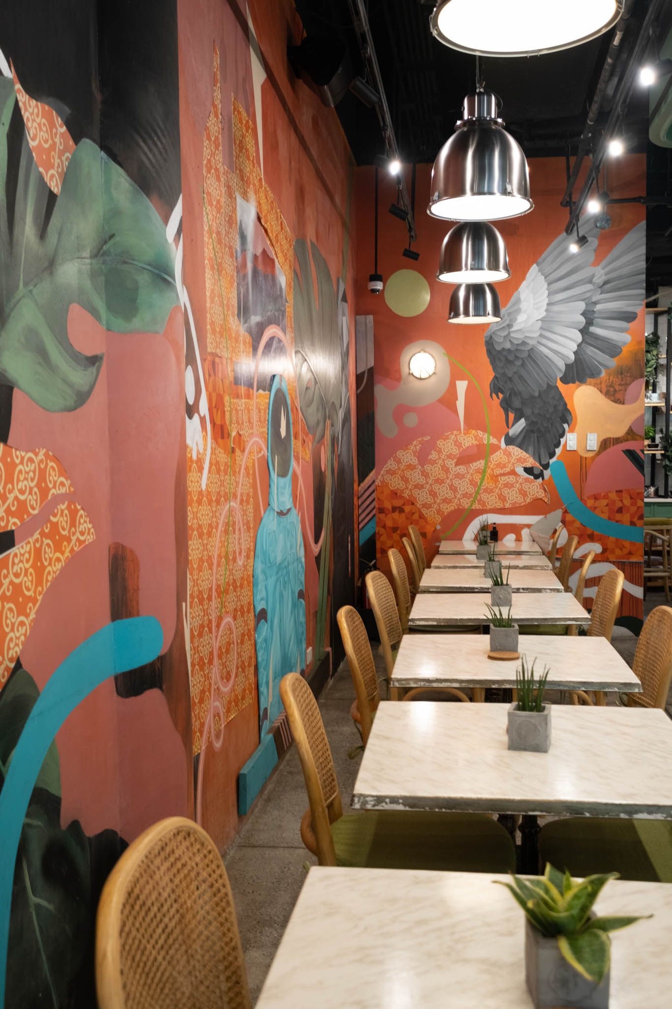 The statement mural by artist Jay Pacena is a major focal point of the Fat Seed Cafe + Roastery