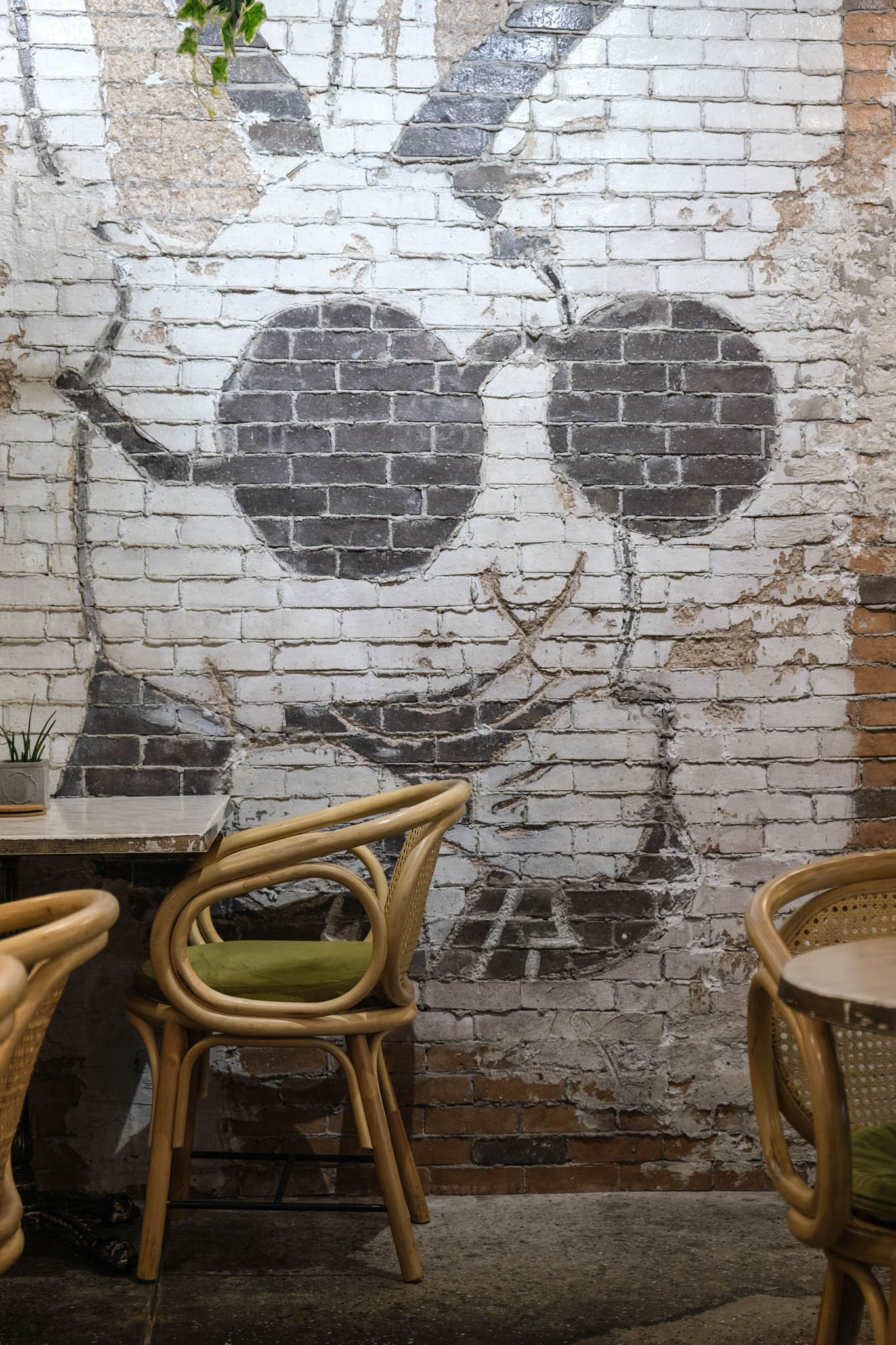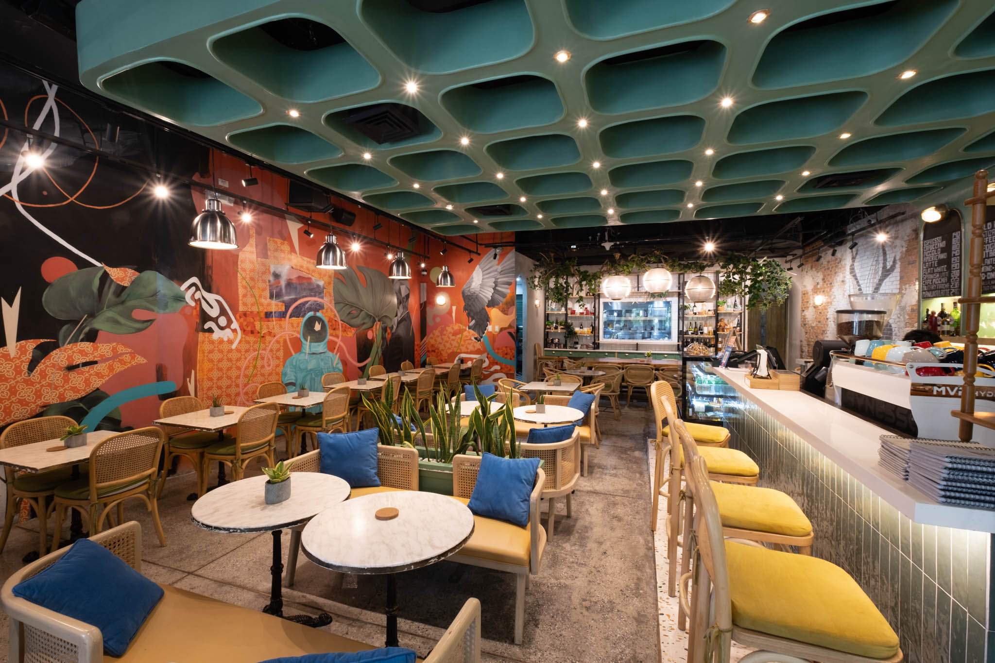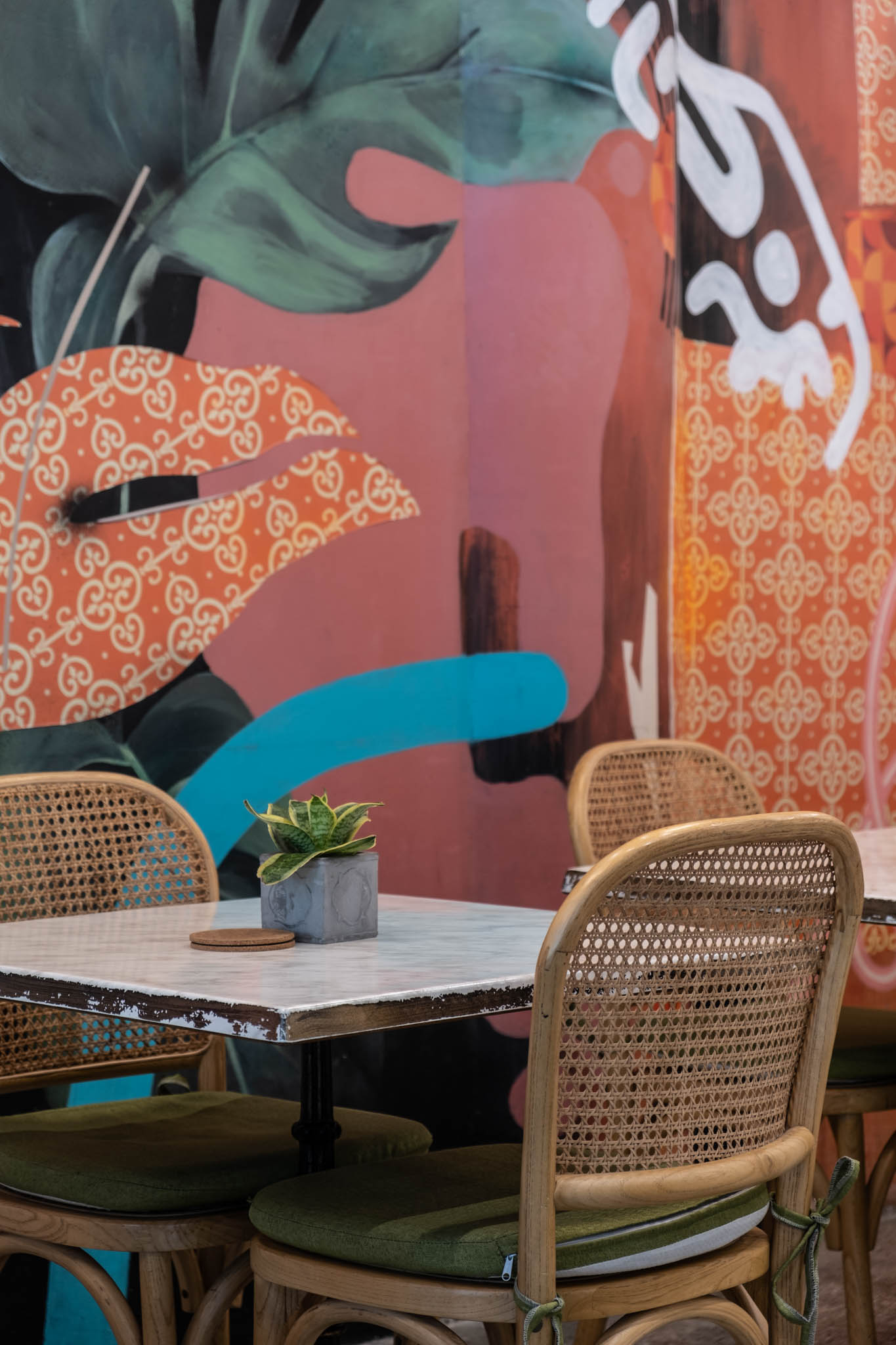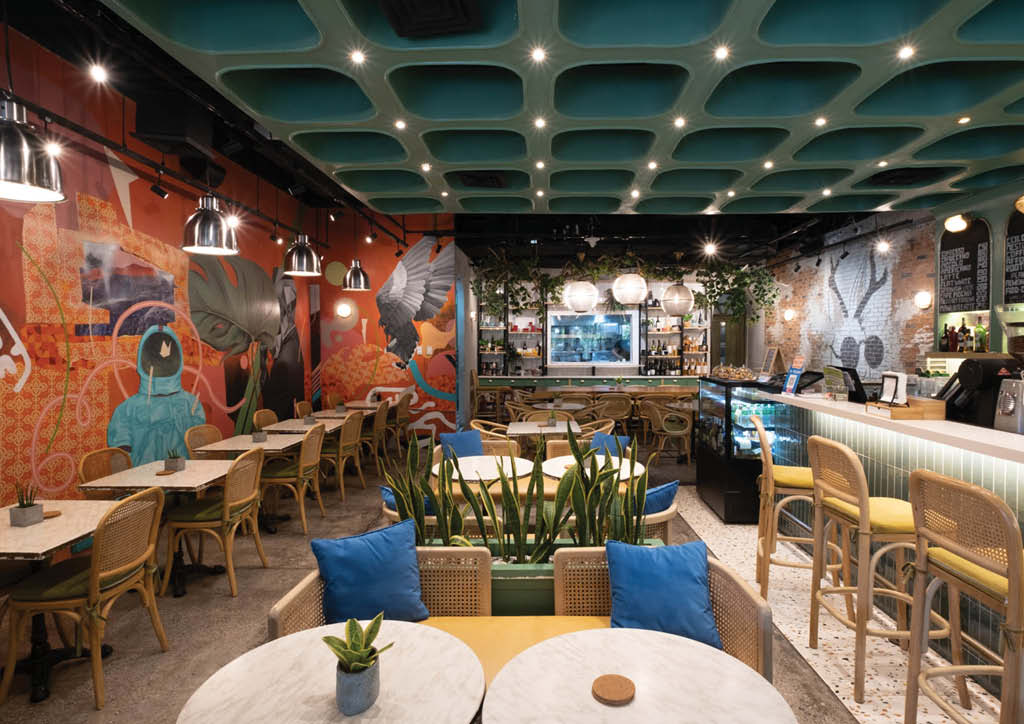 The statement mural by artist Jay Pacena is a major focal point of the Fat Seed Cafe + Roastery