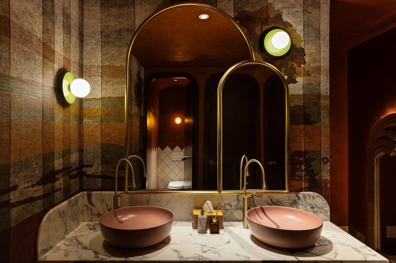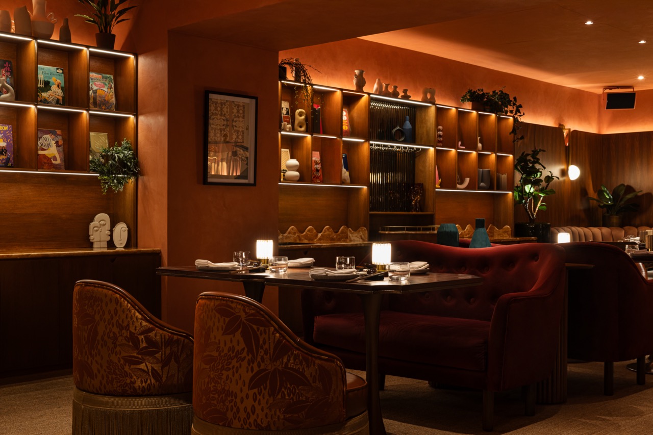 The Tropicalia room takes its inspiration from Brazilian arts, fashion, and music from the turn of the century. Vibrant terracotta hues and vinyl records reflect this influence as it establishes both nostalgia mixed in with contemporary charm. The space itself functions as a venue for celebrations as it captures the essence of movement and a suave groove. The furniture notably pops in color while artisanal artifacts fill the rows of shelving.