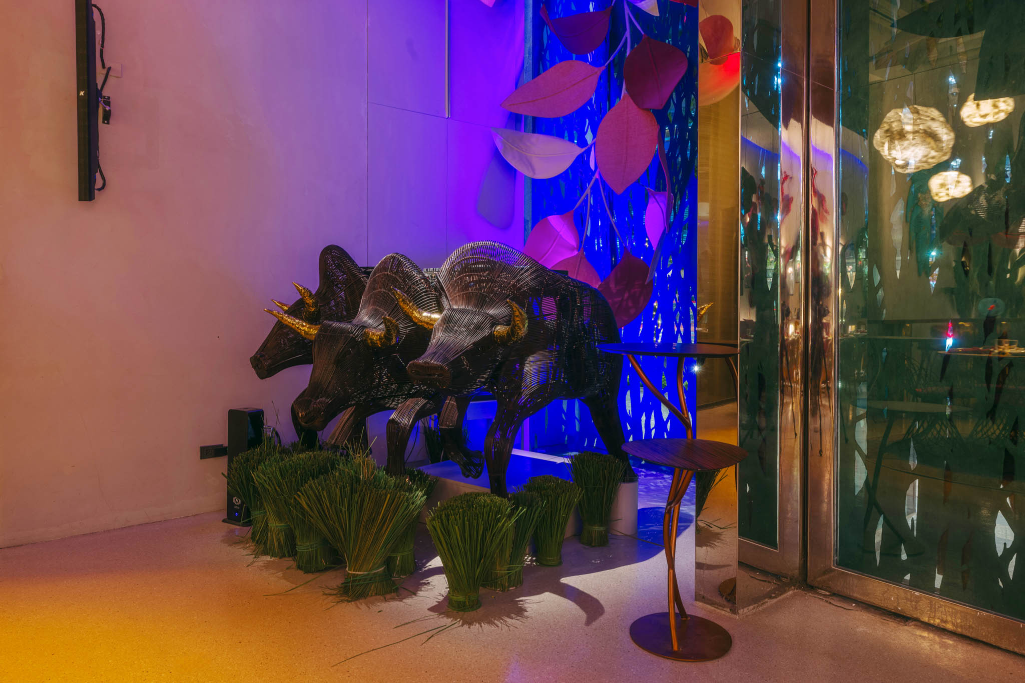 But in the VIP room, Cobonpue revealed a custom lighting fixture called the Abbey, which evokes a far more visceral reaction. Patterned after the grandeur of the Manila Cathedral, it features miniature monks dressed in vibrant red, appearing to descend the staircases. This unsettling detail creates a surreal and almost haunting tableau for many, as the designer described.
