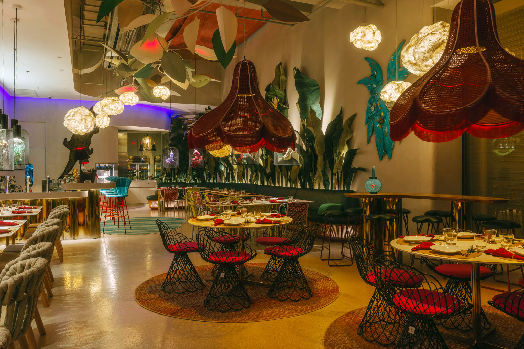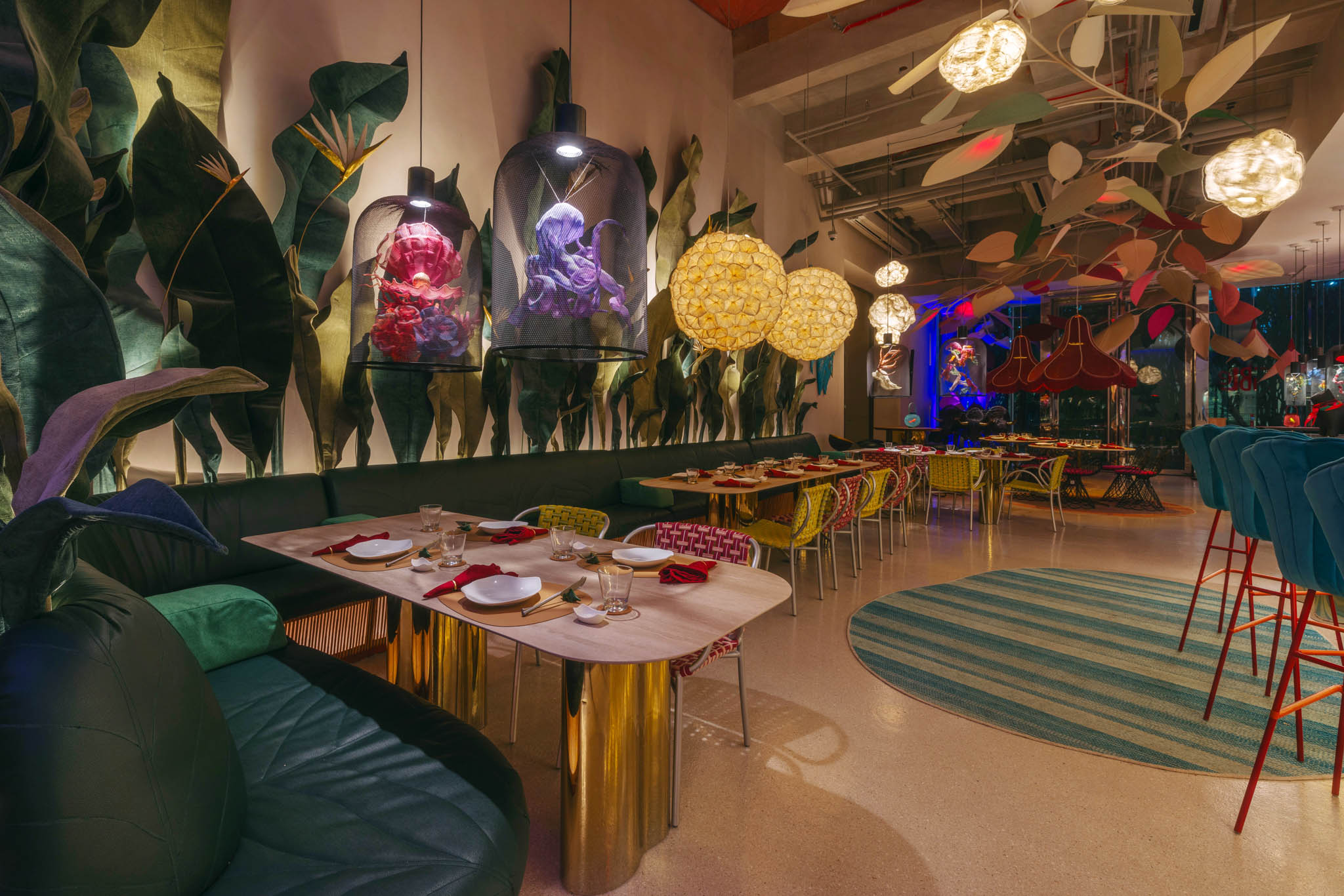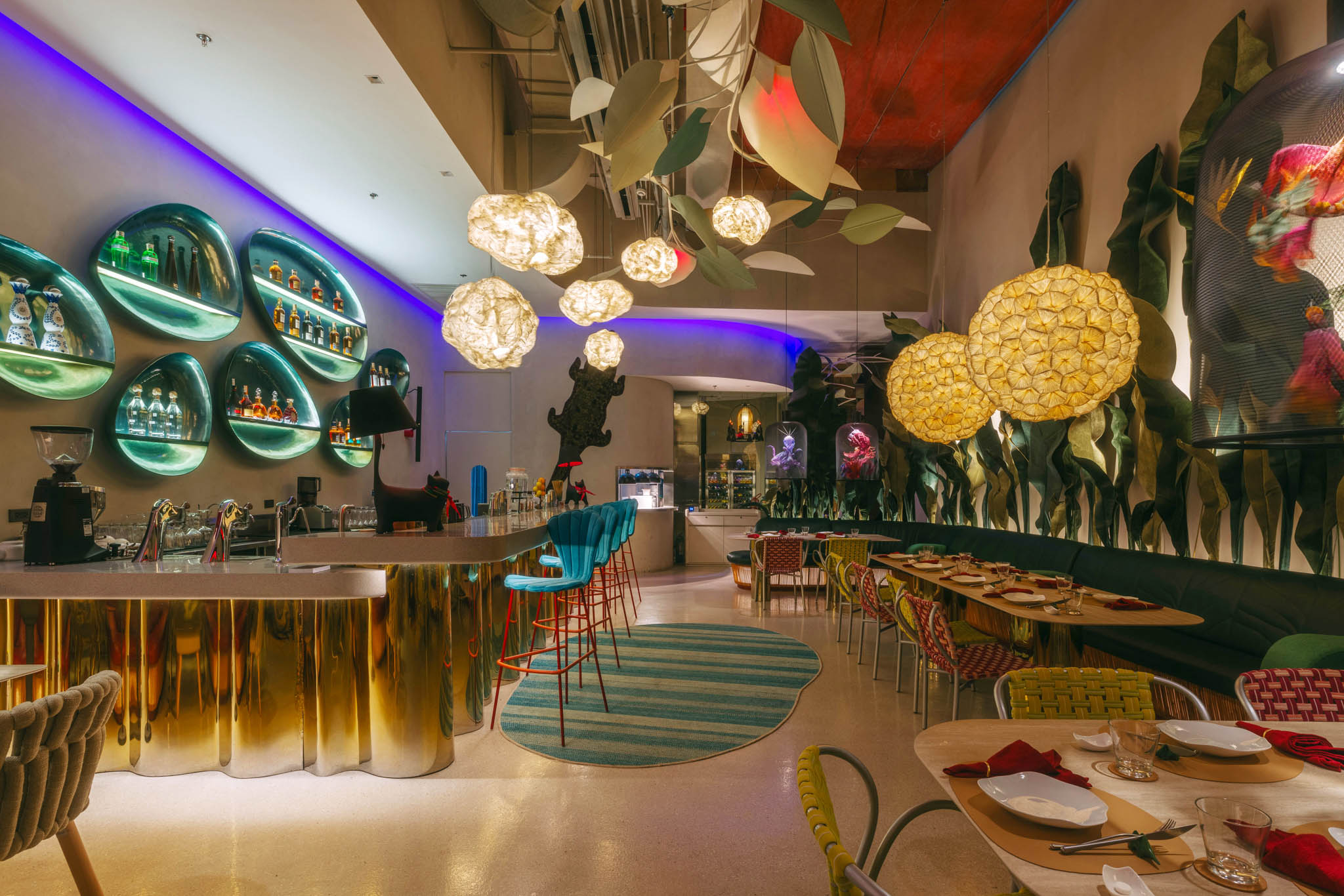 Along with the Curio and KCurated collections, massive leaves and flowers fill the space. Other unique objects inspired by nature also dominate the café, particularly evident in clam shell stools and gigantic dew drops along the bar area. The designer revealed that these very details echo the setting of Alice in Wonderland. And stepping inside FABLE is similar to going down the rabbit hole that leads to that magical world.