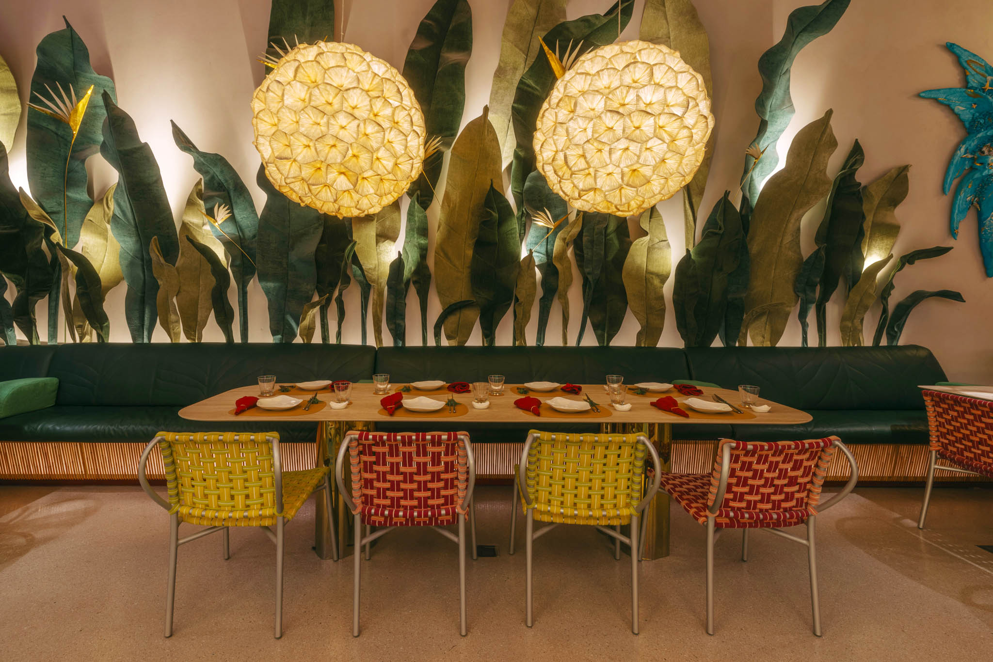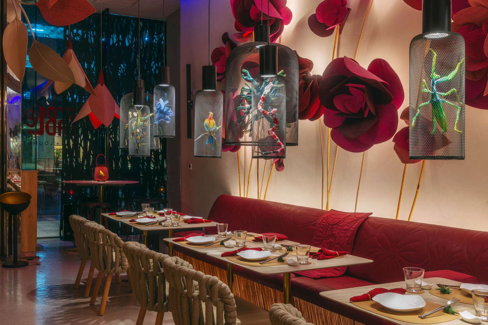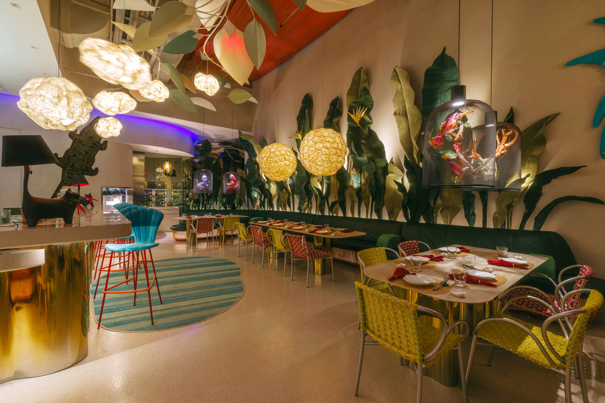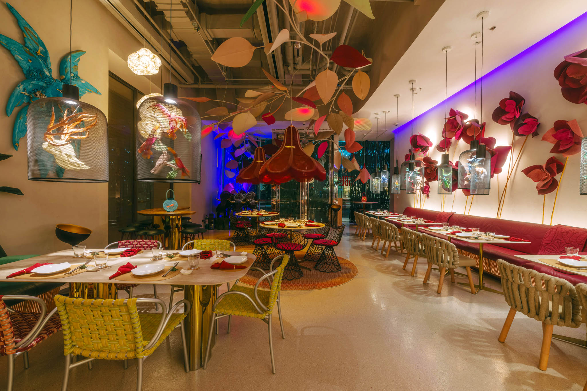Along with the Curio and KCurated collections, massive leaves and flowers fill the space. Other unique objects inspired by nature also dominate the café, particularly evident in clam shell stools and gigantic dew drops along the bar area. The designer revealed that these very details echo the setting of Alice in Wonderland. And stepping inside FABLE is similar to going down the rabbit hole that leads to that magical world.