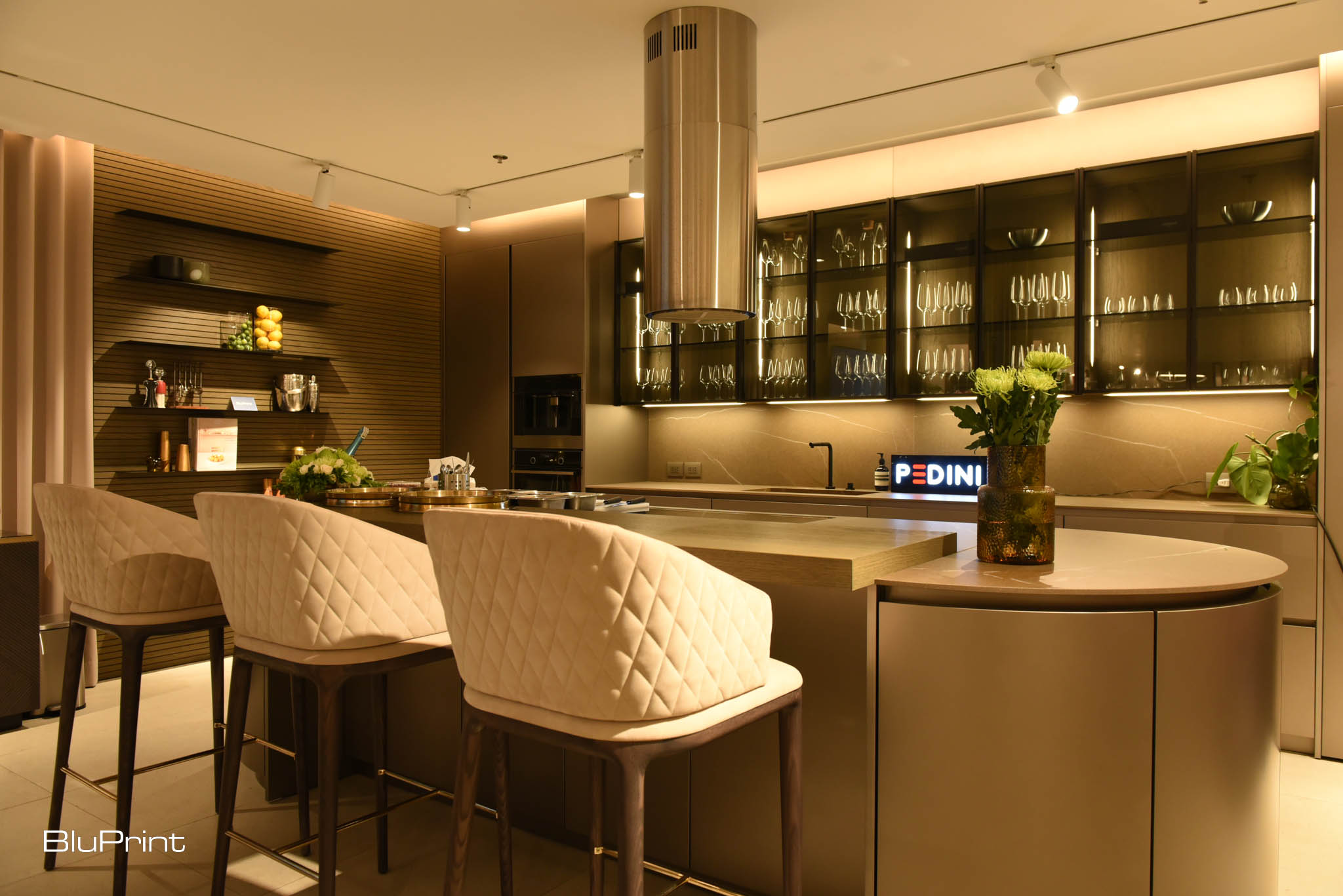 The kitchen and dining room, curated by interior designer Cecil Ravelas, featured Pedini’s signature curved kitchen joinery. The beautiful island, with clean lines and neutral colors, included high-backed bar stools. These overlooked the glass-fronted upper cabinets and beautiful, wide countertops made with aesthetic and innovative laminates.