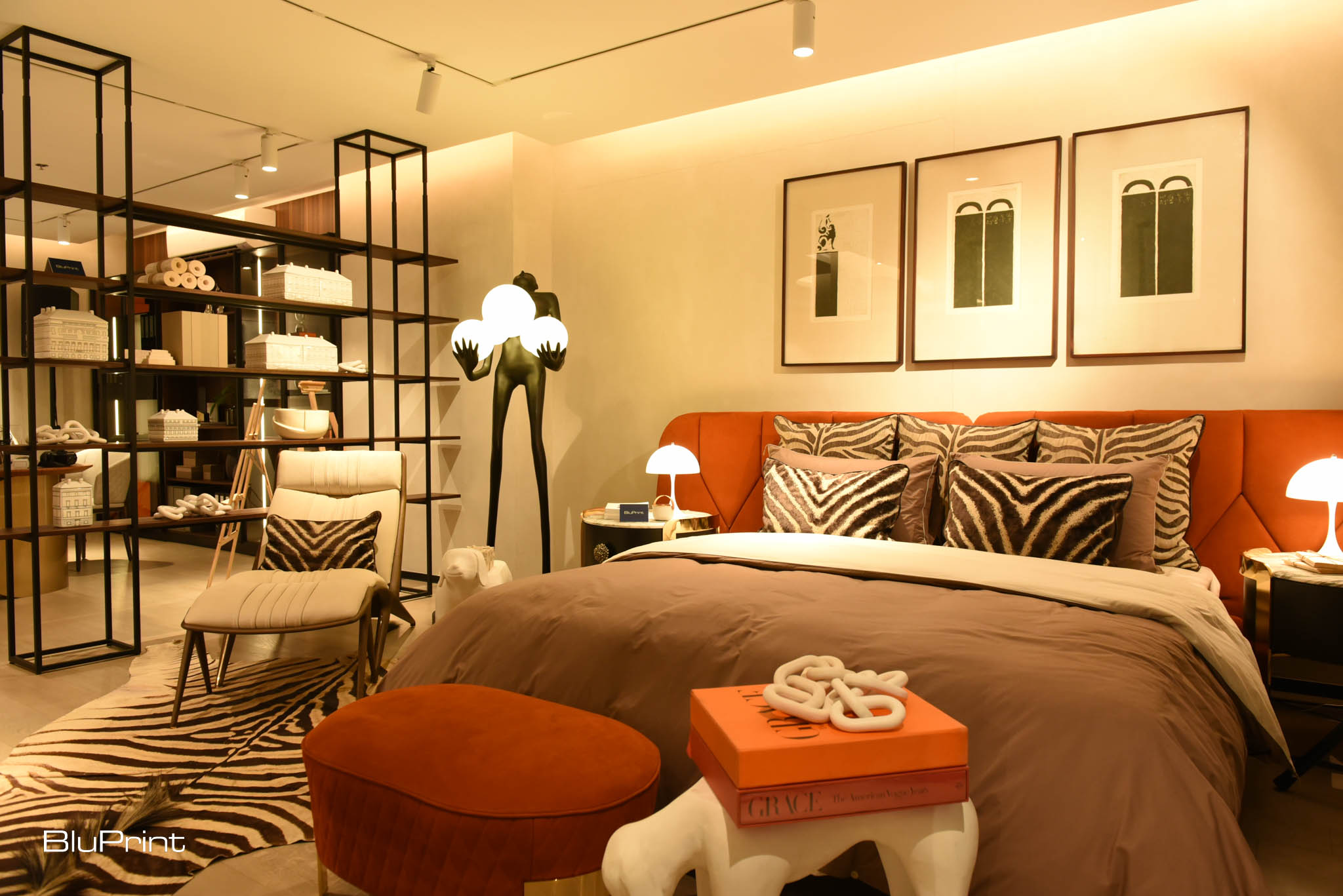 Behind a glass partition was the bedroom. True to form, the Almario sisters infused a touch of playfulness to their design, taking their cues from the bed’s orange headboard. Zebra animal prints and dog sculptures, as well as beautiful decorative pieces from their own collection completed the look.