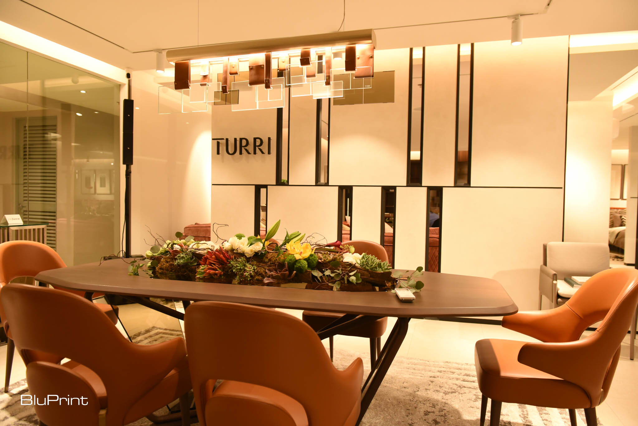 For the showroom’s living room, Jorge Yulo’s interpretation of a sophisticated and modern living space featured Turri’s plush sectional sofa adorned with dark gray and vibrant throw pillows. Subtle biophilic touches served to amplify the room. A bonsai tree graced the modern glass coffee table, punctuated by a stunning deep blue acrylic sculpture by up and coming artist, Chino Yulo. The celebrated architect praised the quality and materiality of every piece, with his design complementing the furnitures’ geometry.