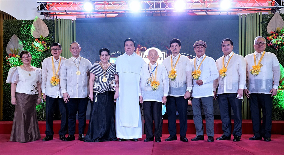 The photo shows the 2022 Outstanding Thomasian alumni awardees (L-R) representative of The Calimag family (Thomasian Family Award [Special Award]); William T. Belo (Outstanding Thomasian Alumni for Accountancy, Business, and Management [Business]); Jeffrey O. Tarayao, MS(Outstanding Thomasian Alumni for Service to Humanity); Prof. Ma. Minerva P. Calimag, MD, PhD (Outstanding Thomasian Alumni for Medicine); UST Rector Very. Rev. Fr. Richard, G. Ang, O.P., PhD; Crispin C. Maslog, PhD (Outstanding Thomasian Alumni for Media and Entertainment);Saturnino P. Javier, MD (Outstanding Thomasian Alumni for Health Allied); Nemesio R. Miranda, Jr. (Outstanding Thomasian Alumni for Music, Arts, Literature, and Design); Atty. Nilo T. Divina, Ll. B. (Outstanding Thomasian Alumni for Law and Justice); and DTI Sec. Ramon M. Lopez, MDE(Outstanding Thomasian Alumni for Accountancy, Business, and Management [Management]).