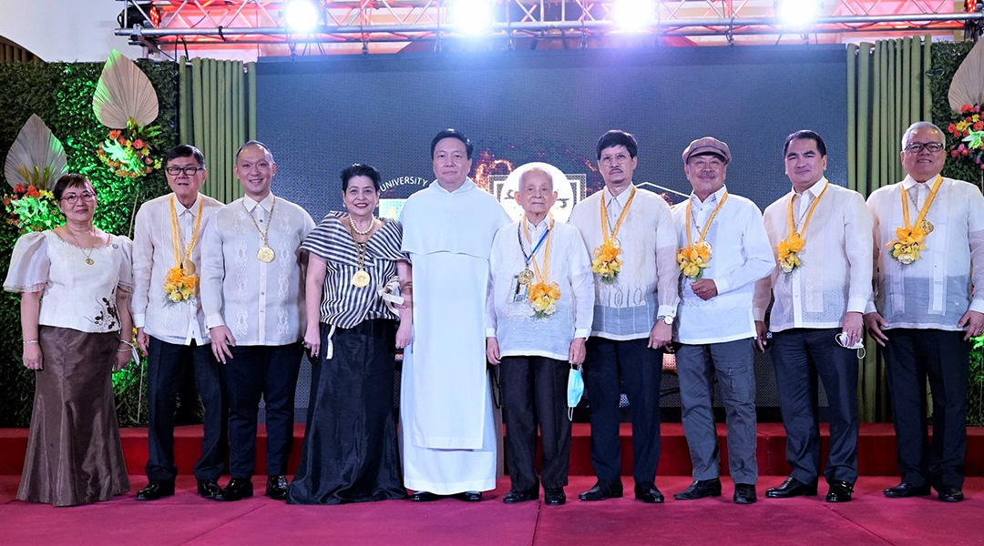 The photo shows the 2022 Outstanding Thomasian alumni awardees (L-R) representative of The Calimag family (Thomasian Family Award [Special Award]); William T. Belo (Outstanding Thomasian Alumni for Accountancy, Business, and Management [Business]); Jeffrey O. Tarayao, MS(Outstanding Thomasian Alumni for Service to Humanity); Prof. Ma. Minerva P. Calimag, MD, PhD (Outstanding Thomasian Alumni for Medicine); UST Rector Very. Rev. Fr. Richard, G. Ang, O.P., PhD; Crispin C. Maslog, PhD (Outstanding Thomasian Alumni for Media and Entertainment);Saturnino P. Javier, MD (Outstanding Thomasian Alumni for Health Allied); Nemesio R. Miranda, Jr. (Outstanding Thomasian Alumni for Music, Arts, Literature, and Design); Atty. Nilo T. Divina, Ll. B. (Outstanding Thomasian Alumni for Law and Justice); and DTI Sec. Ramon M. Lopez, MDE(Outstanding Thomasian Alumni for Accountancy, Business, and Management [Management]).