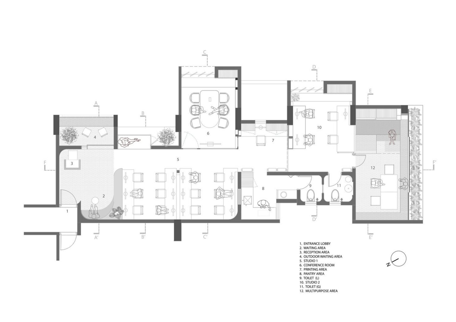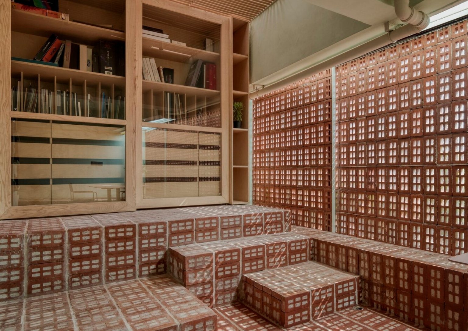 Studio by the Hill’s entrance is a direct visual representing the whole office – bricks, pale green plaster walls, and beautiful sunlight. Every meeting room in the office has its own character. One room boasts tiered seating made with perforated bricks that match the wall. Another room has a wooden table with recycled tubes to hold the table’s base. The same tubes clad a part of the room’s wall to create texture and design.